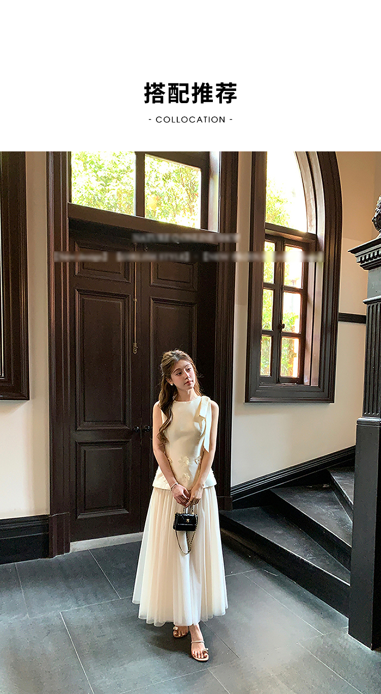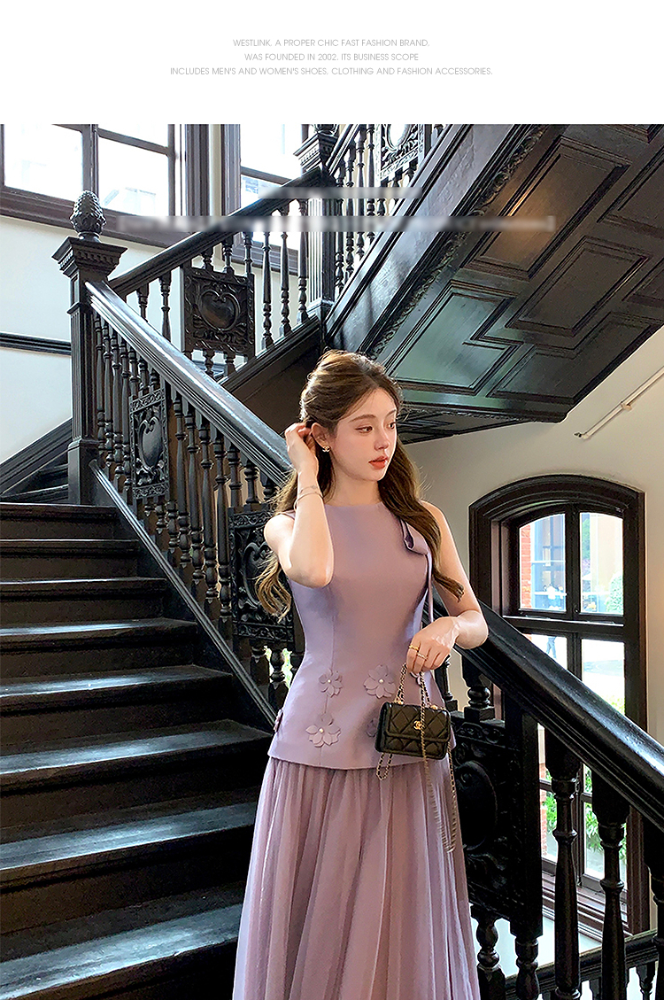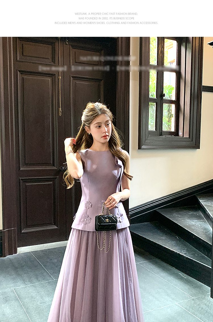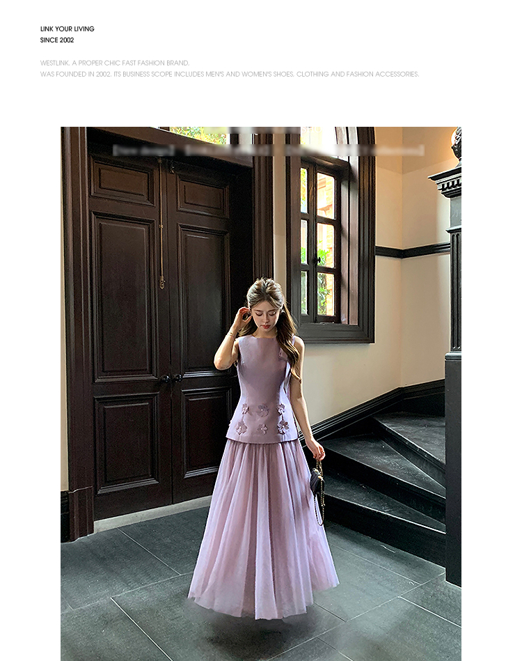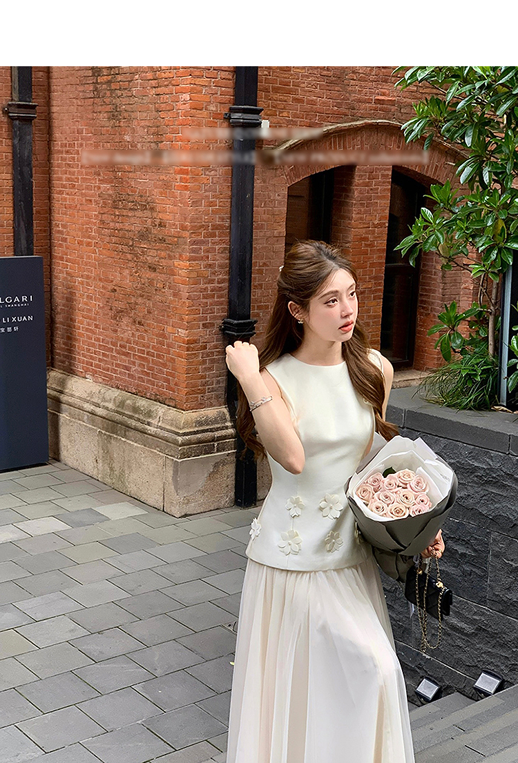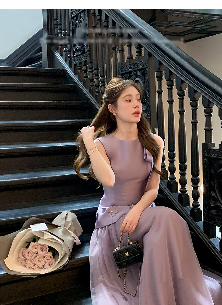 西遇拼接网纱连衣裙女夏季新款立体花朵收腰圆领无袖仙女裙SS050834