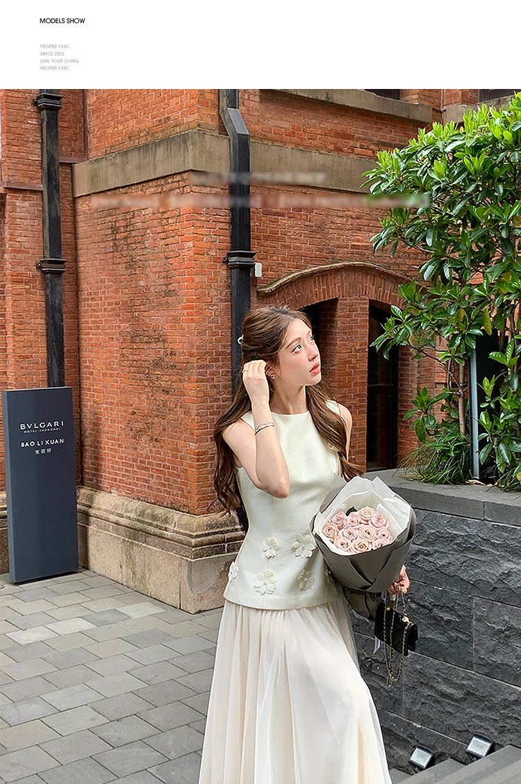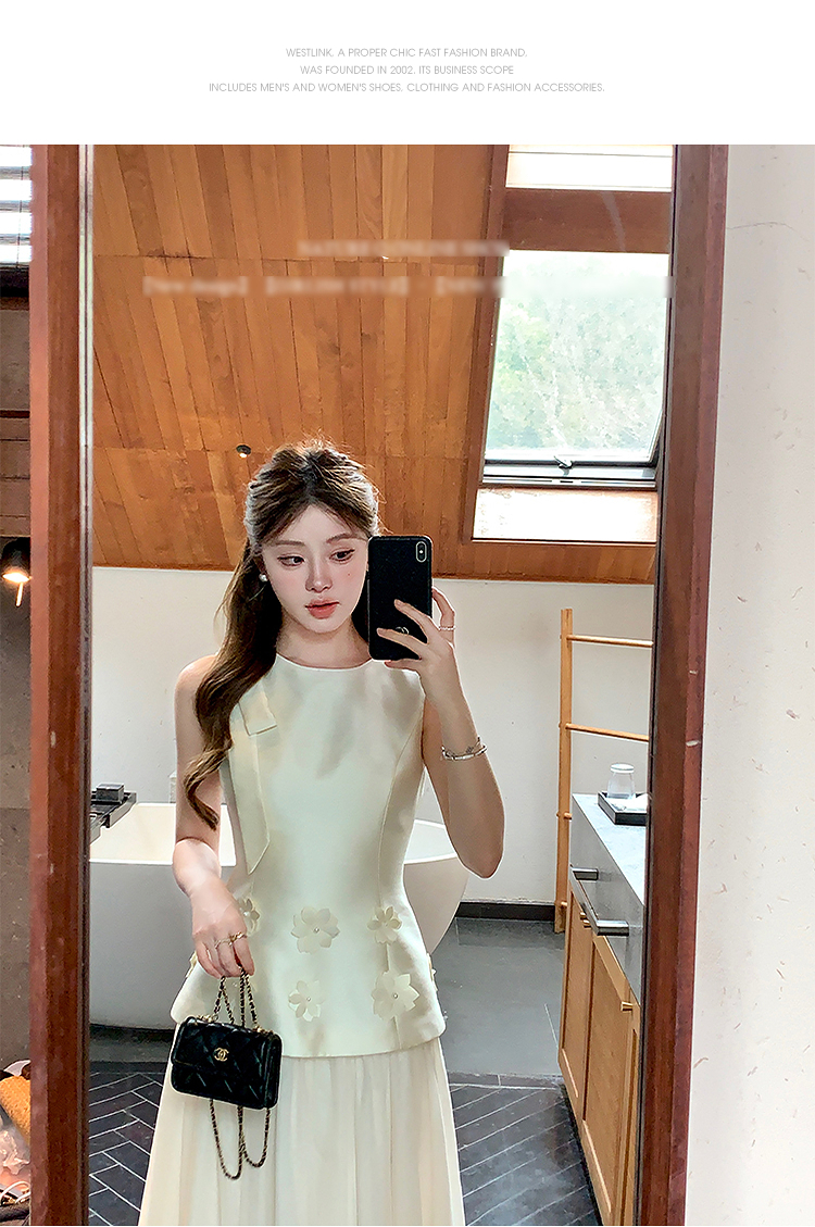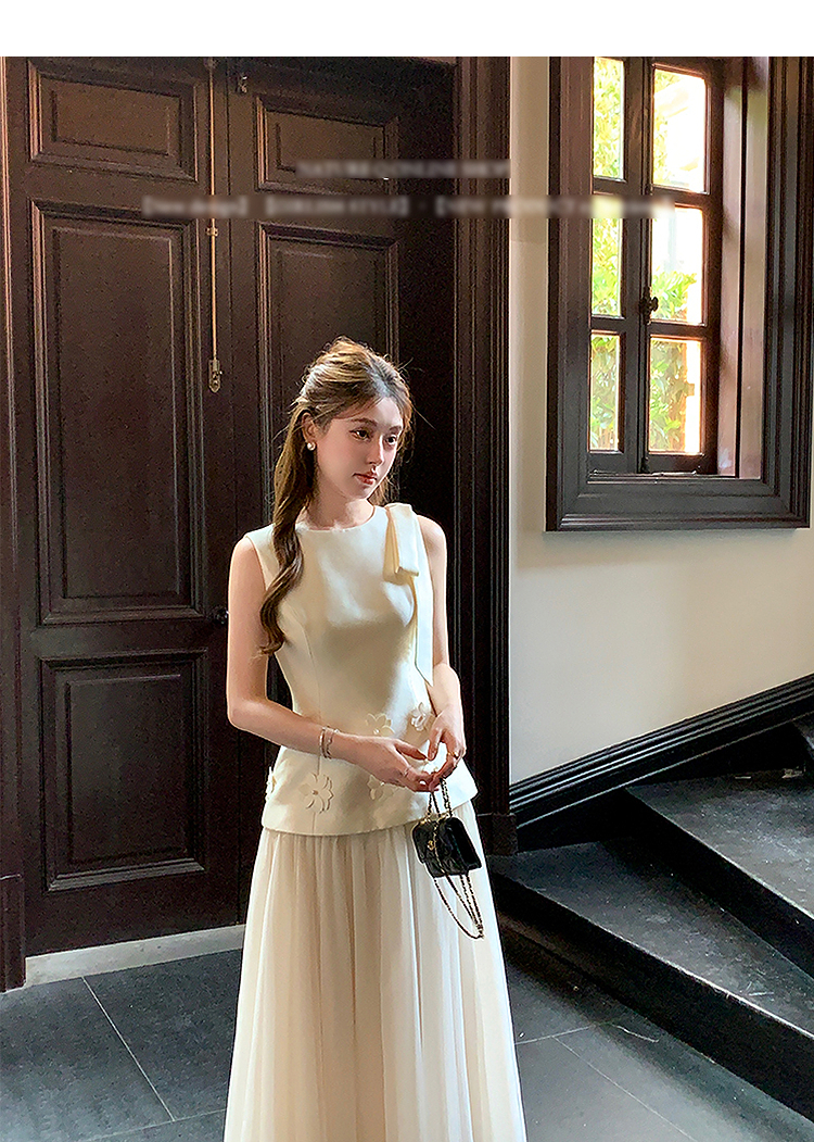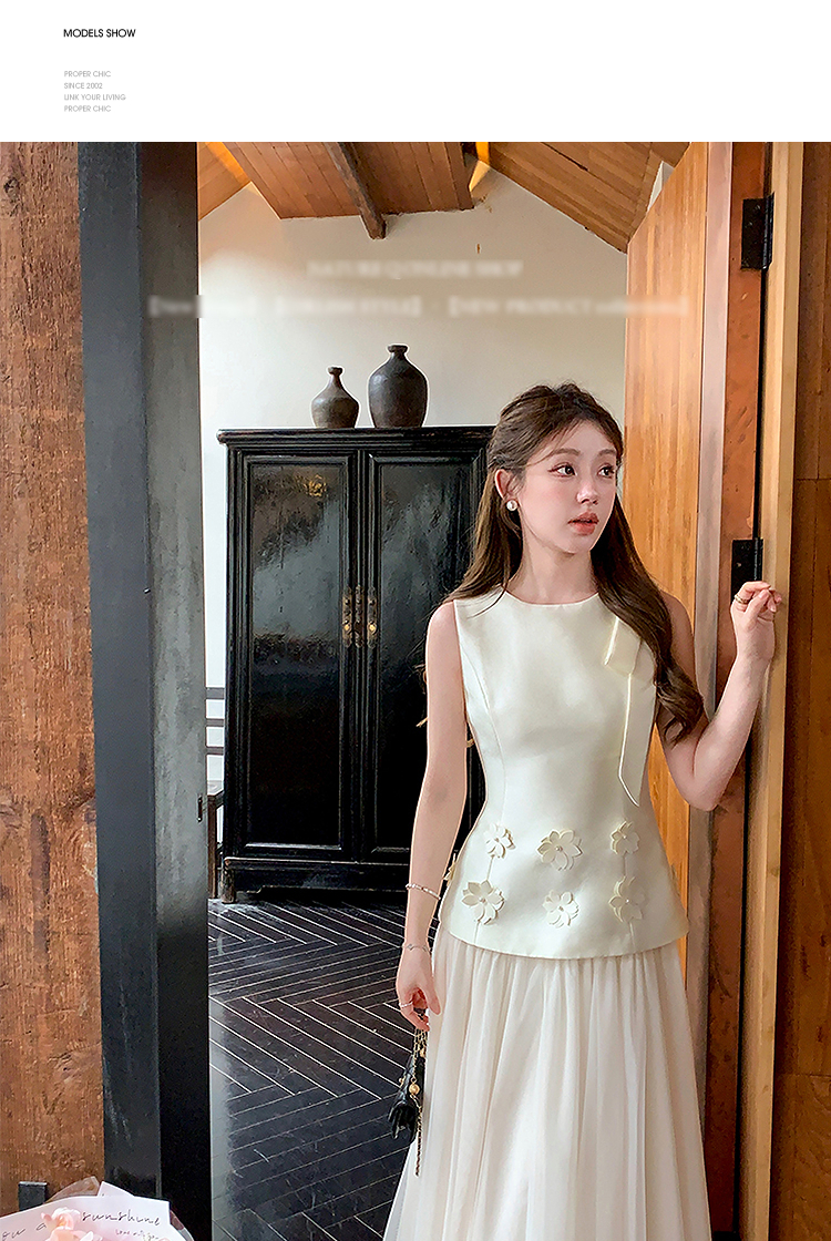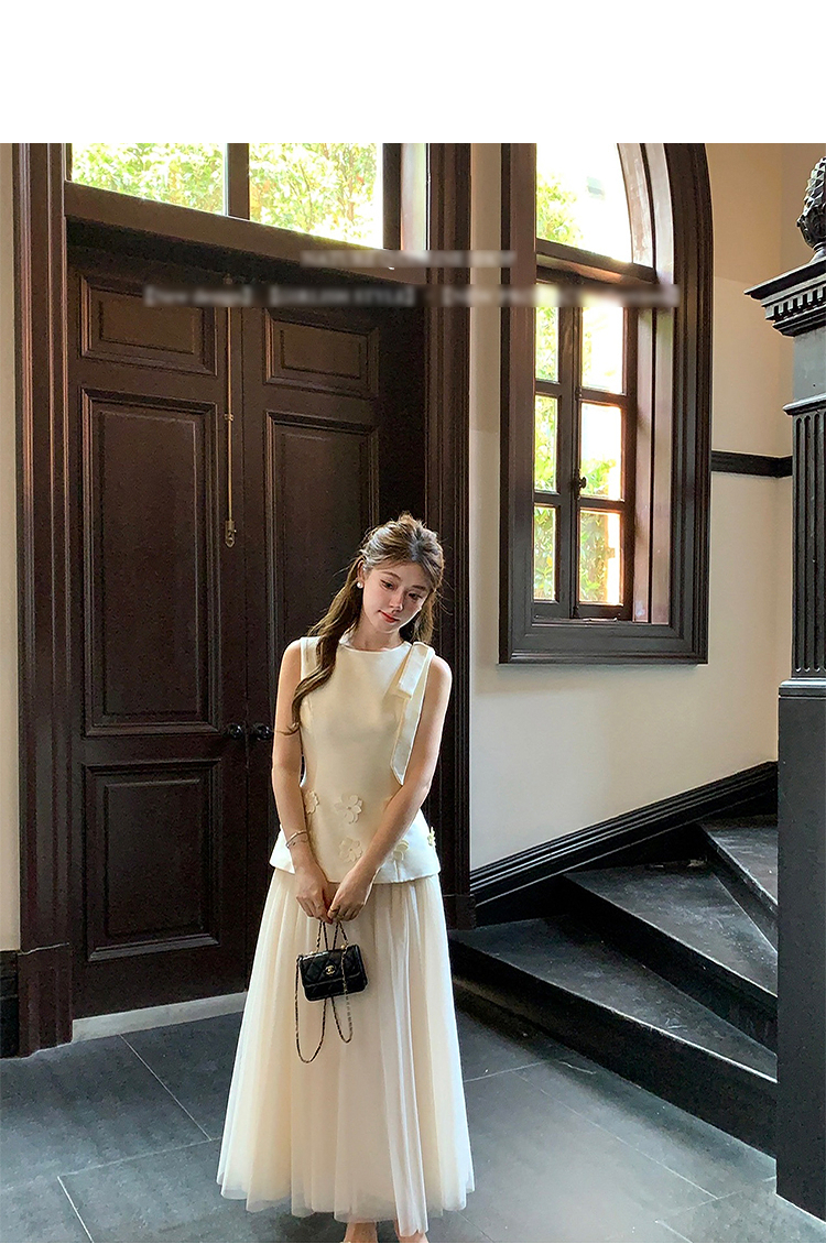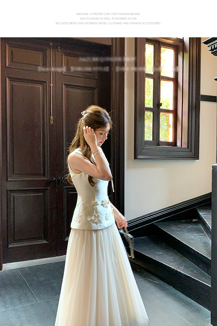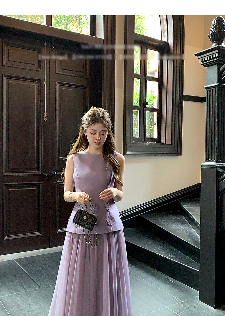 西遇拼接网纱连衣裙女夏季新款立体花朵收腰圆领无袖仙女裙SS050834