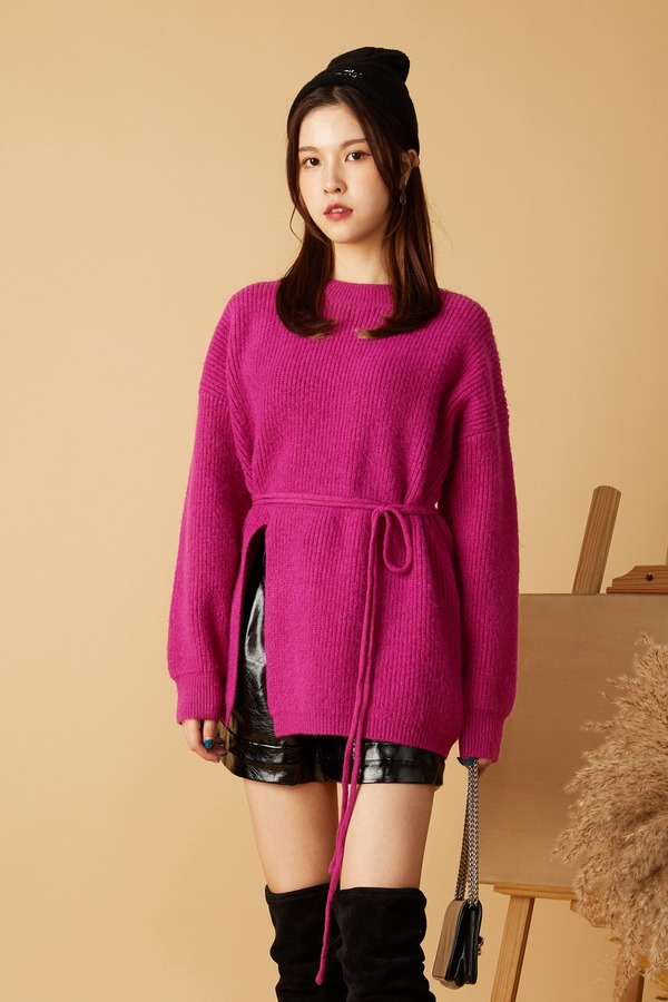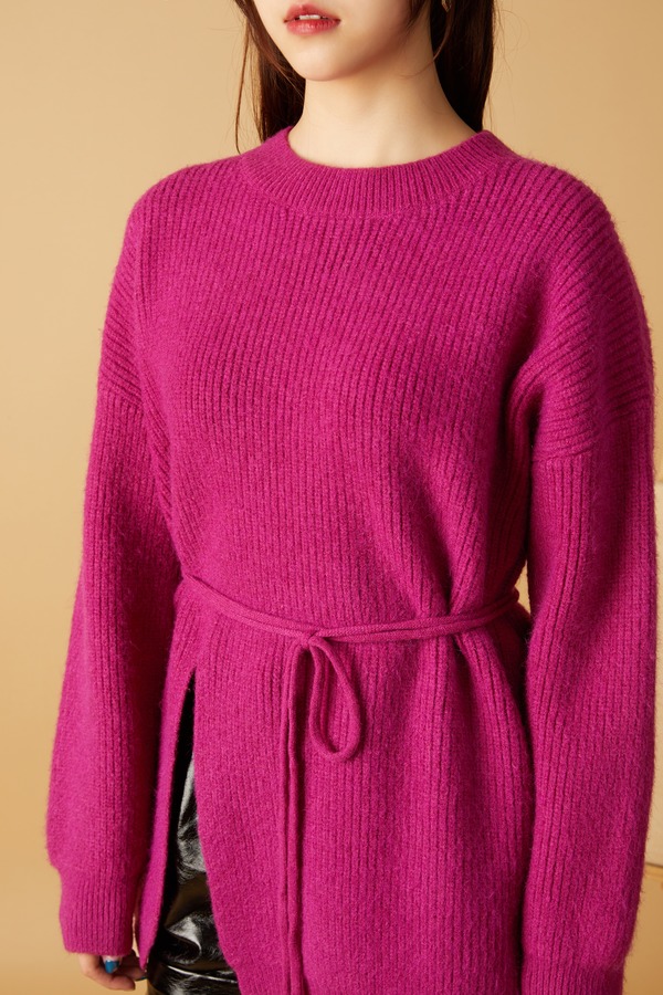 ANSUABEL 玫红色系带高开衩针织上衣 10481