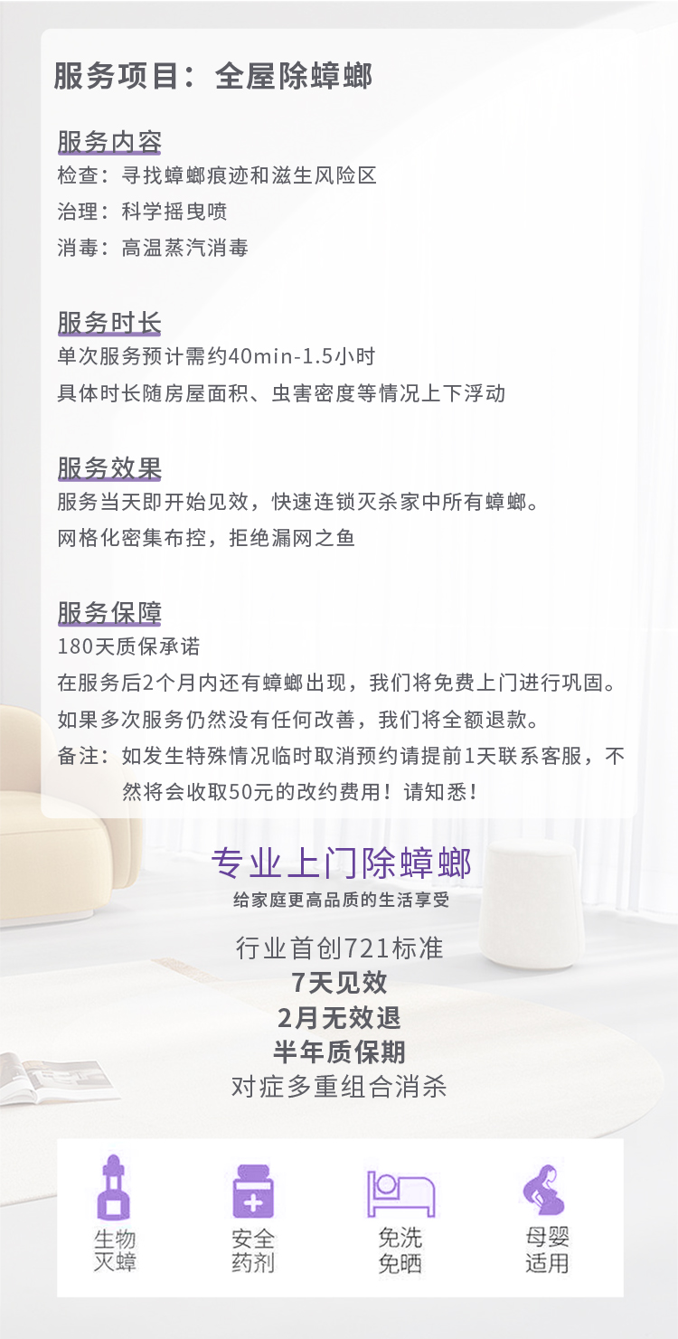 下单须知:清洁区域:全屋踢脚线、电器散热器周围、橱柜内边缝处、地毯周围、冰箱底座周围、厨房窗台下、水槽周围、地漏处、马桶周围、大门口1.5米区域