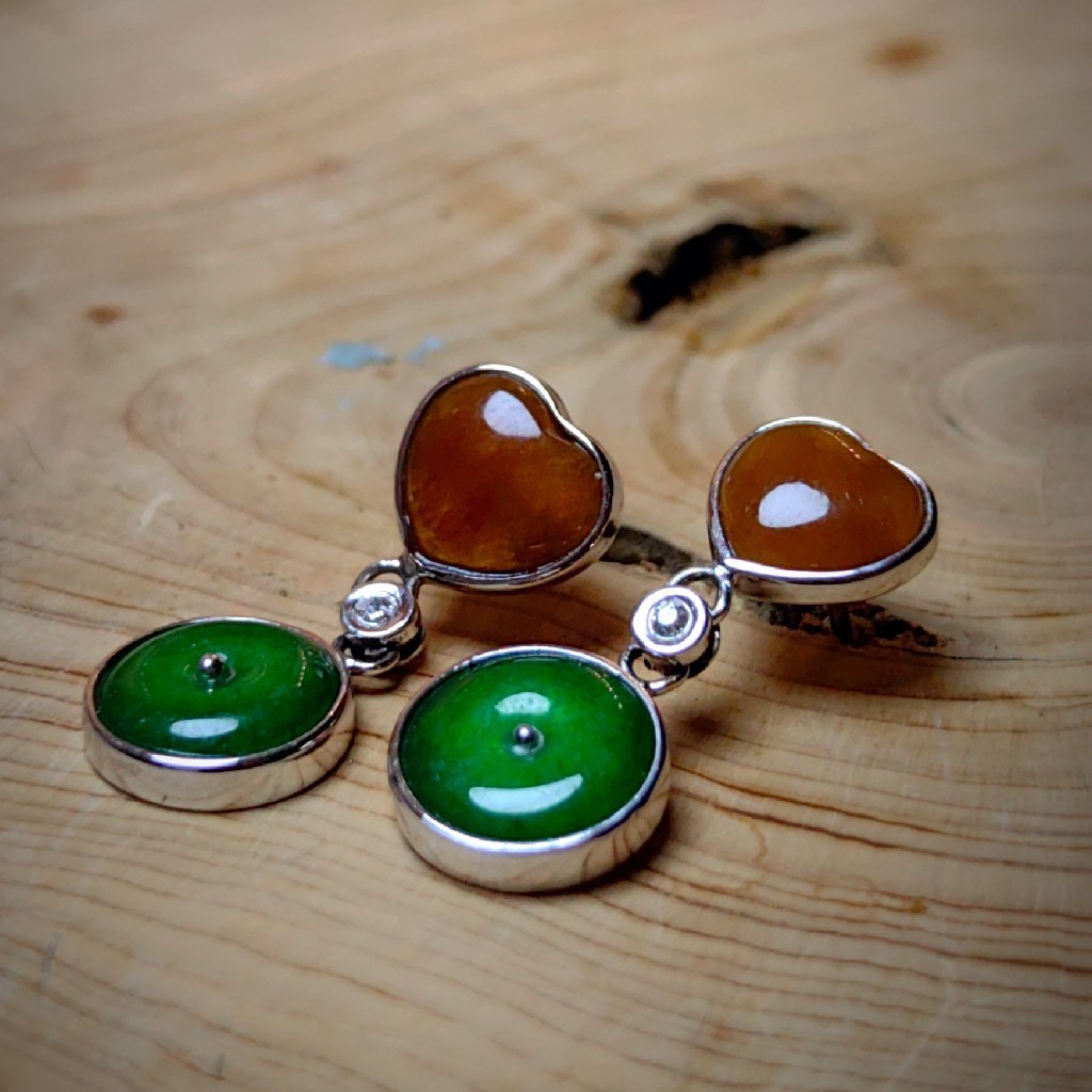 清新的简约款,由桃心形红翡搭配圆形翠绿色翡翠小平安扣,中间由钻石链接,是一对精致个性的设计款耳环。