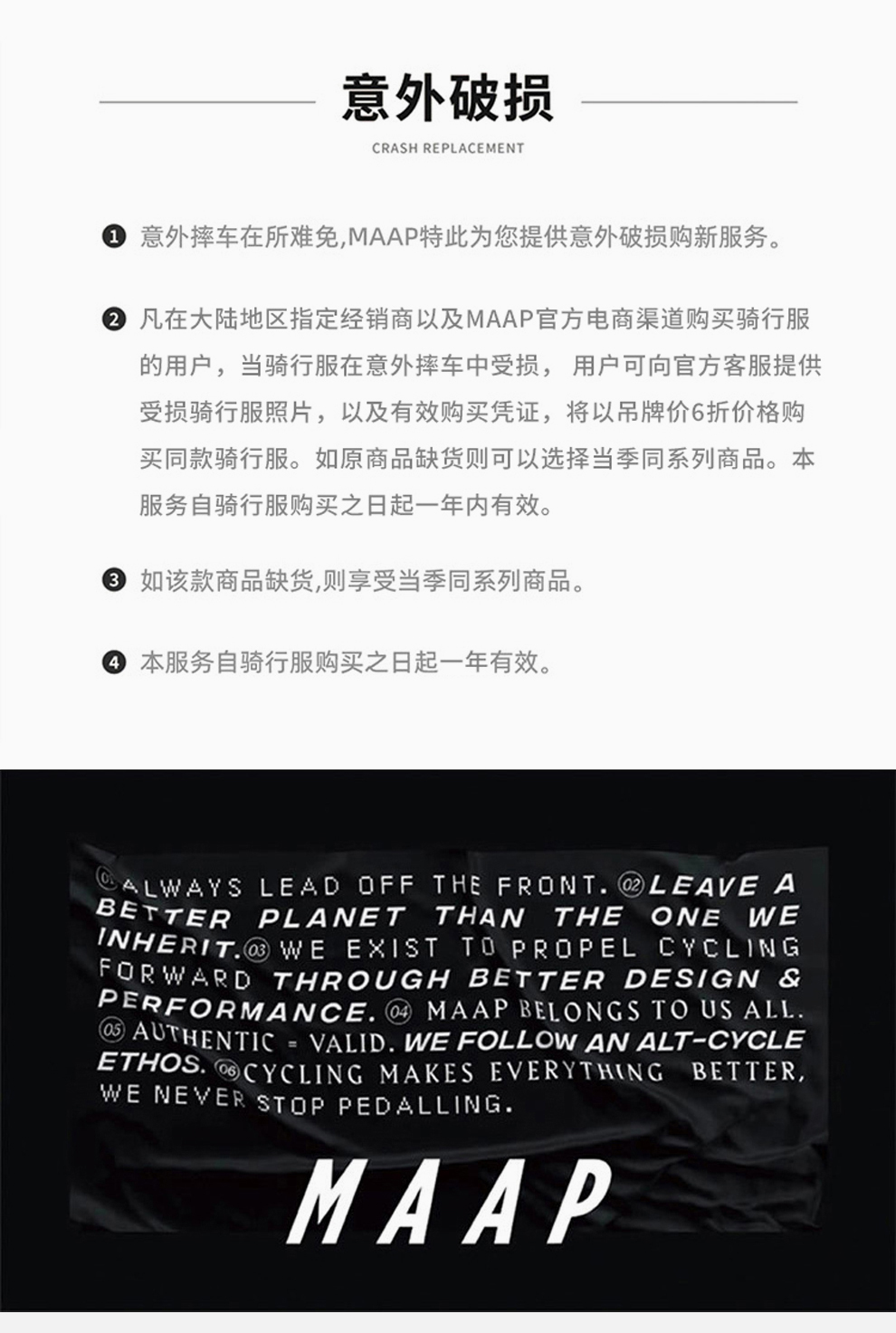 - MAAP作为澳洲功能性骑行服,其出色的时尚设计元素为骑行生活增添色彩。MAAP在为专业车手提升性能表现方面也毫不妥协。