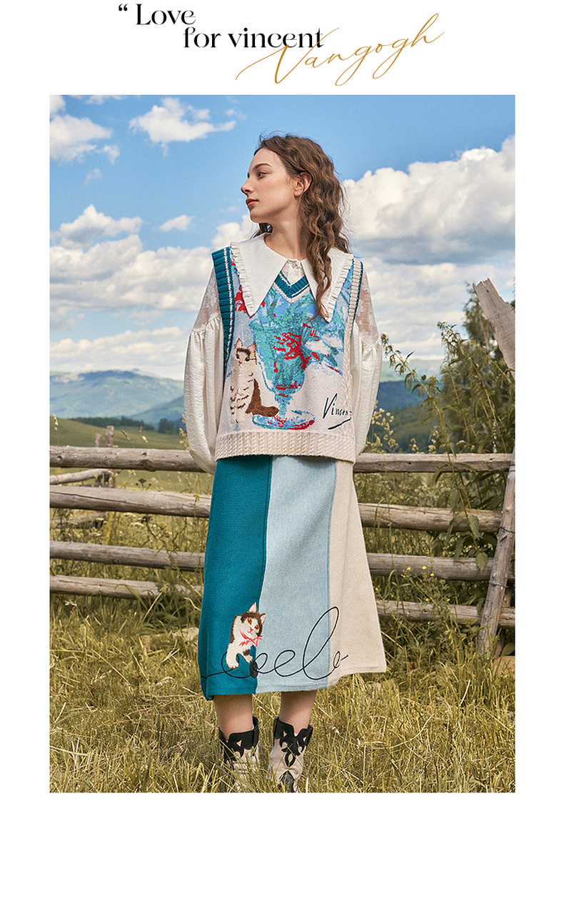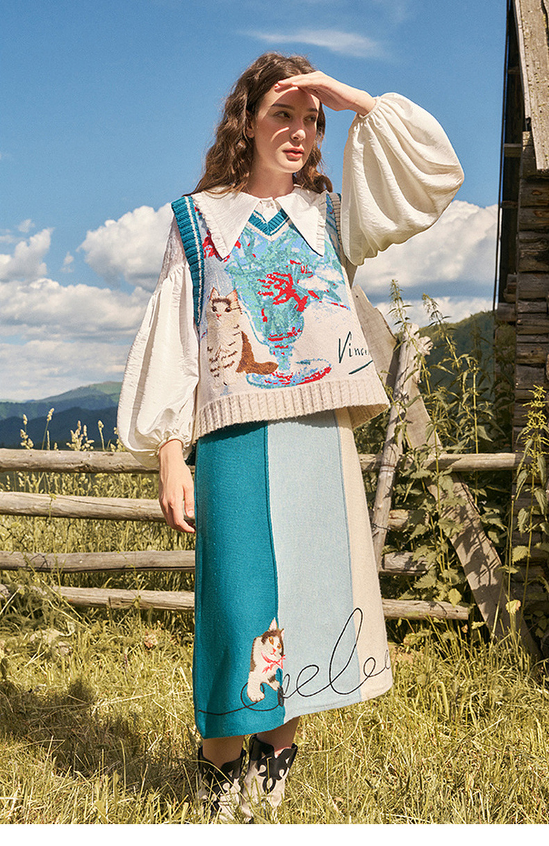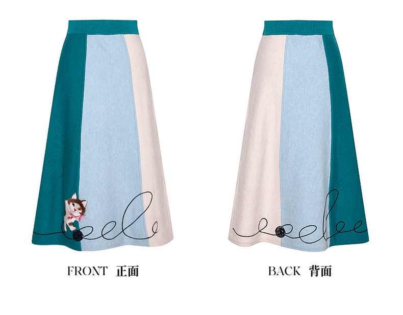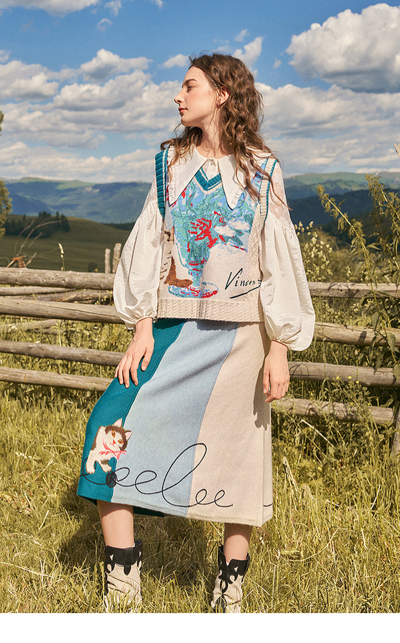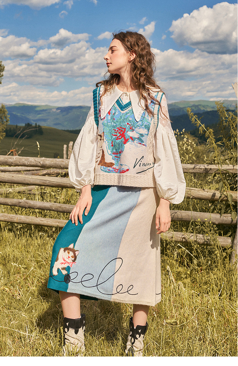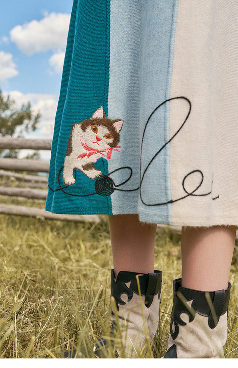 两三事梵高文艺毛线乐园2024秋季新款小猫刺绣拼色针织高腰半身裙
