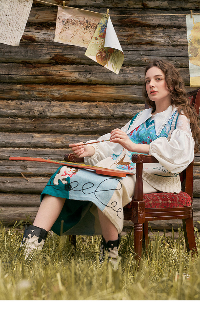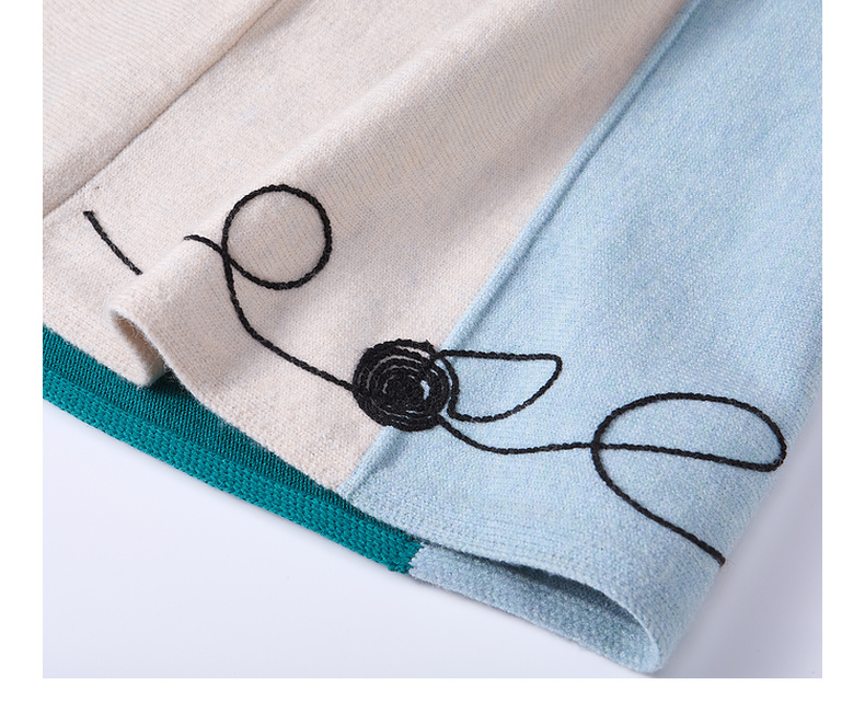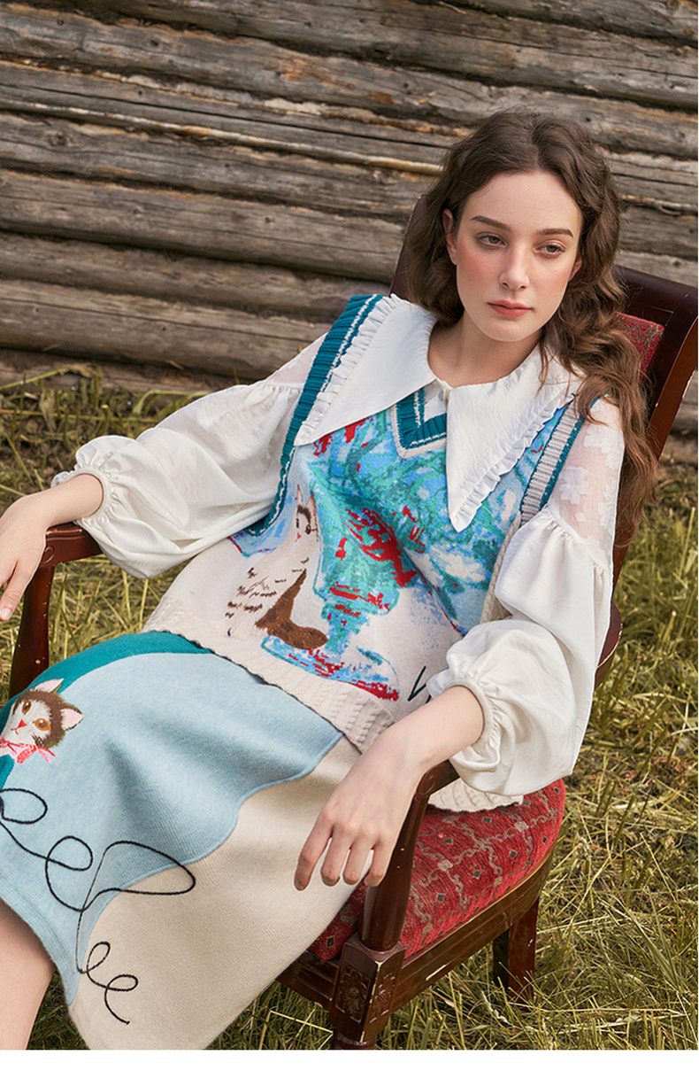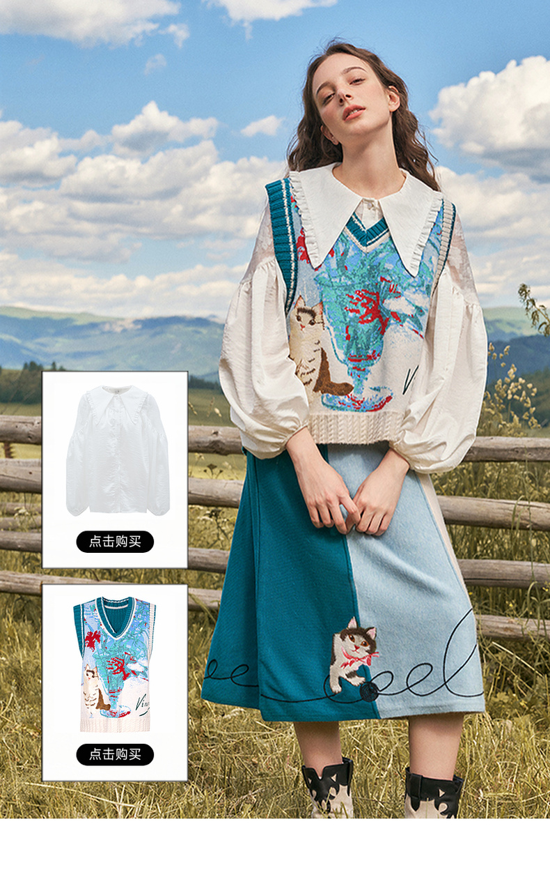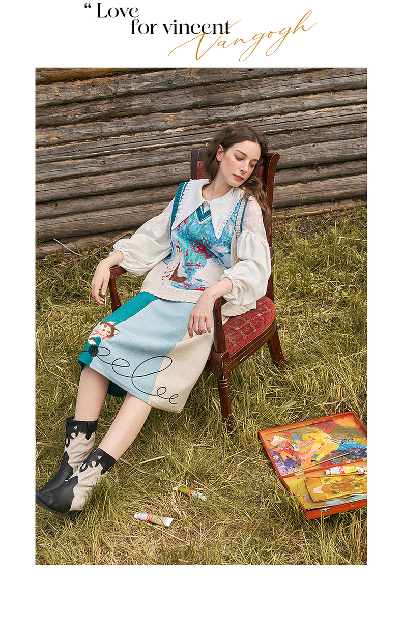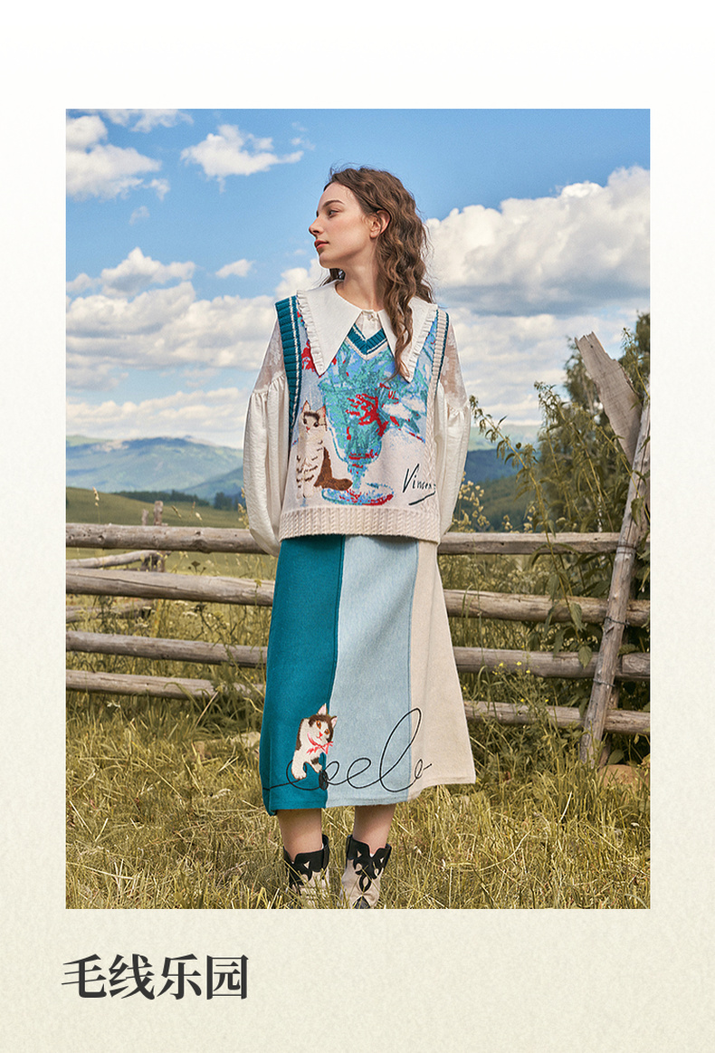 两三事梵高文艺毛线乐园2024秋季新款小猫刺绣拼色针织高腰半身裙