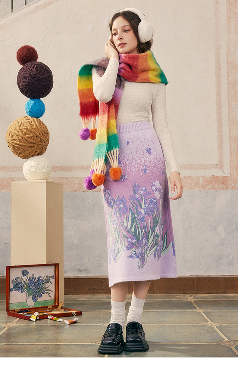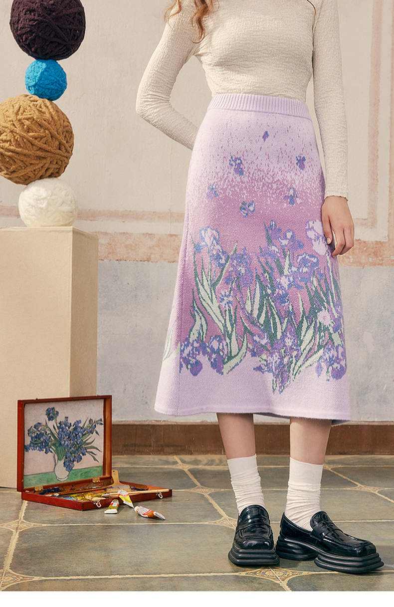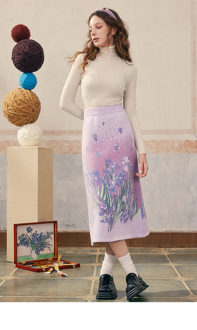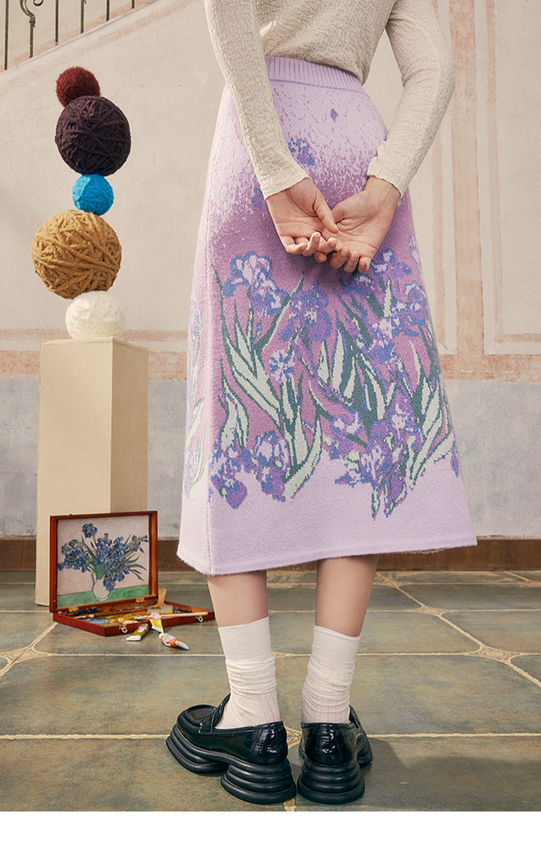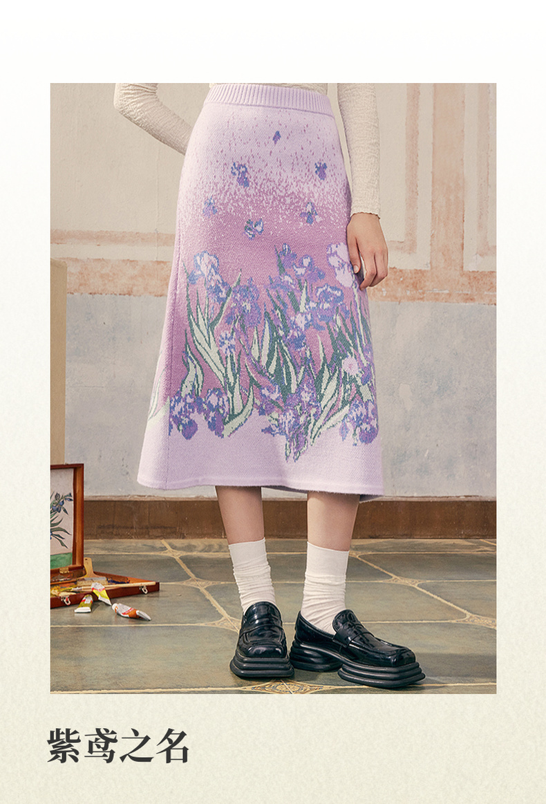 两三事梵高文艺紫鸢之名2024秋季新款渐变色鸢尾花图案针织半身裙