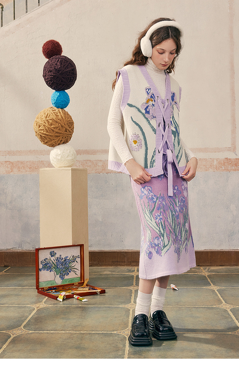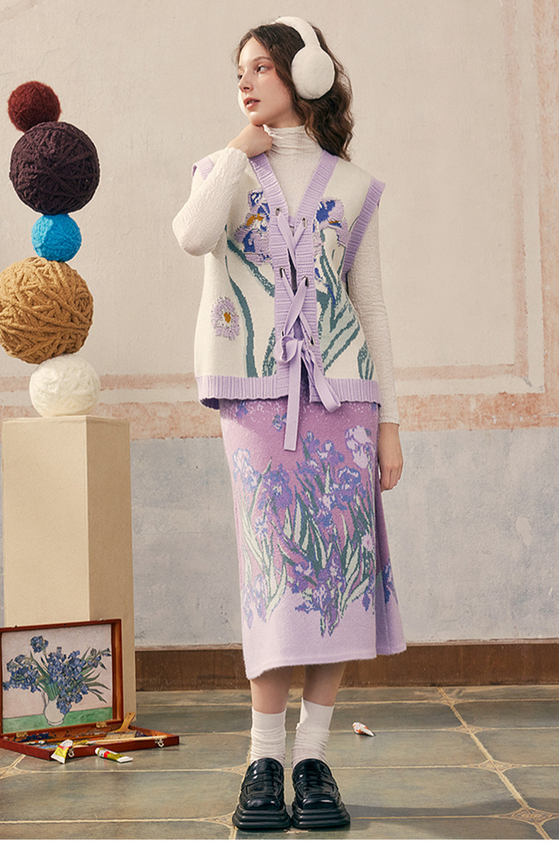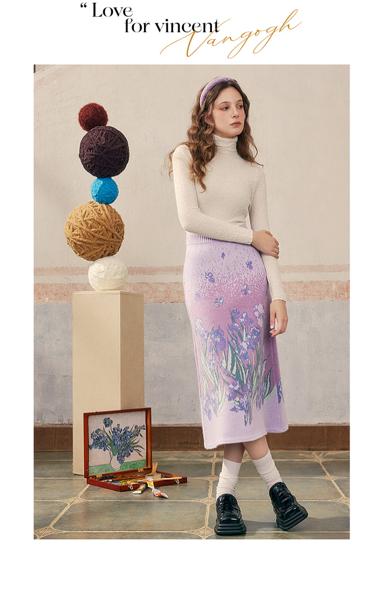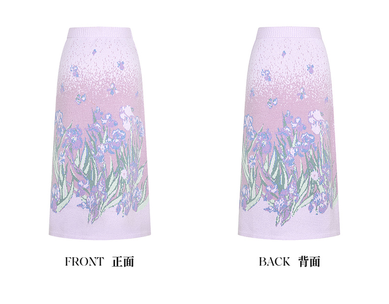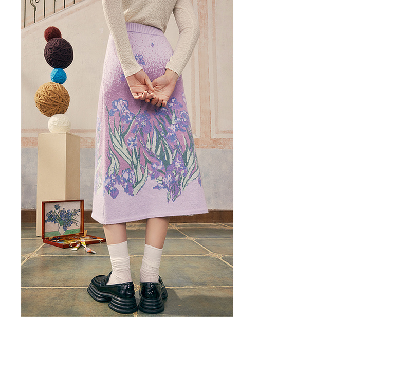 两三事梵高文艺紫鸢之名2024秋季新款渐变色鸢尾花图案针织半身裙