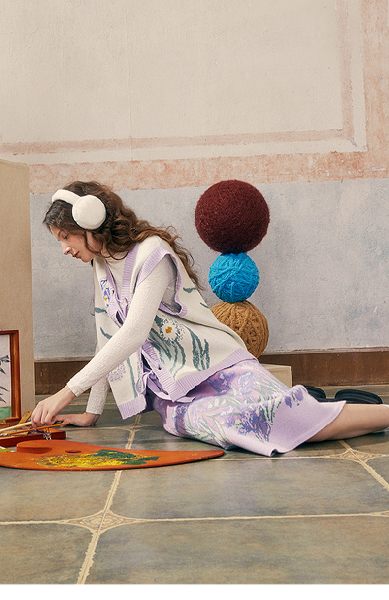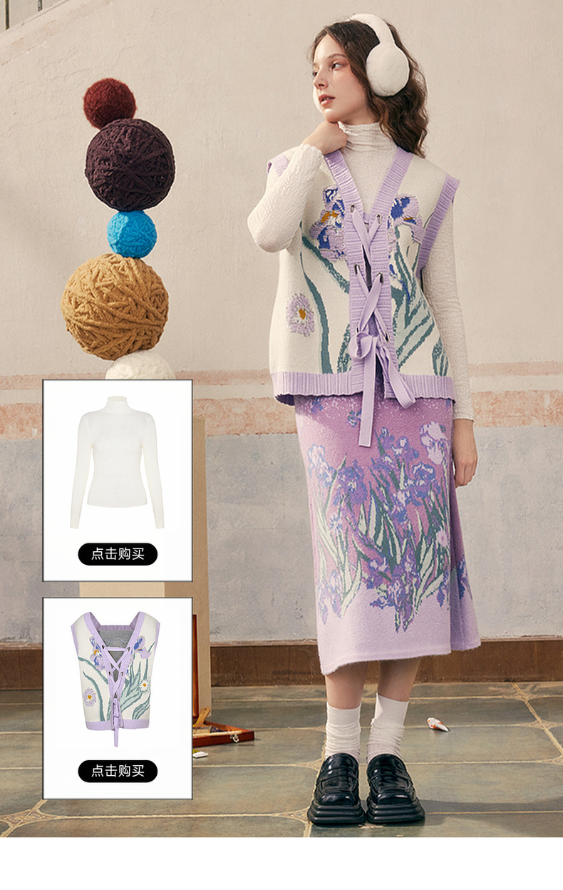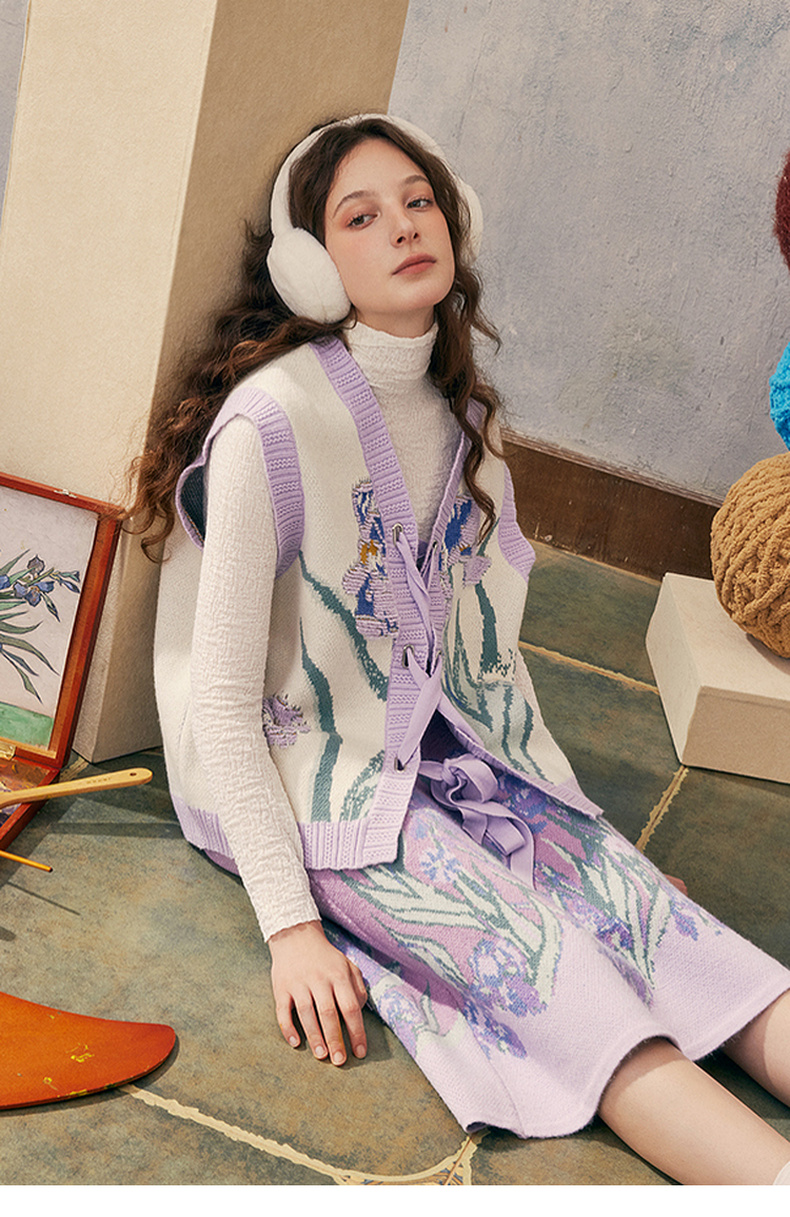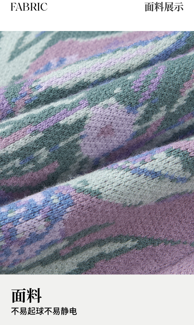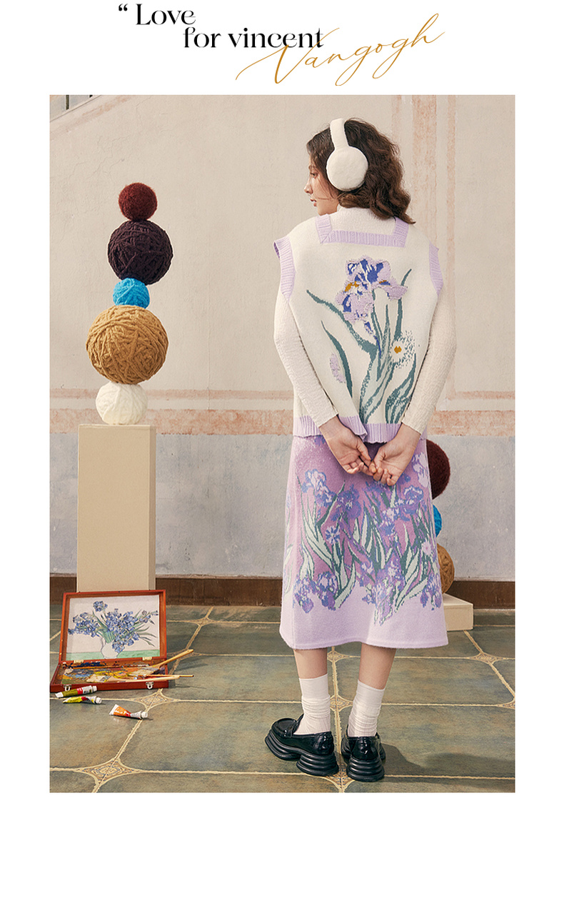两三事梵高文艺紫鸢之名2024秋季新款渐变色鸢尾花图案针织半身裙