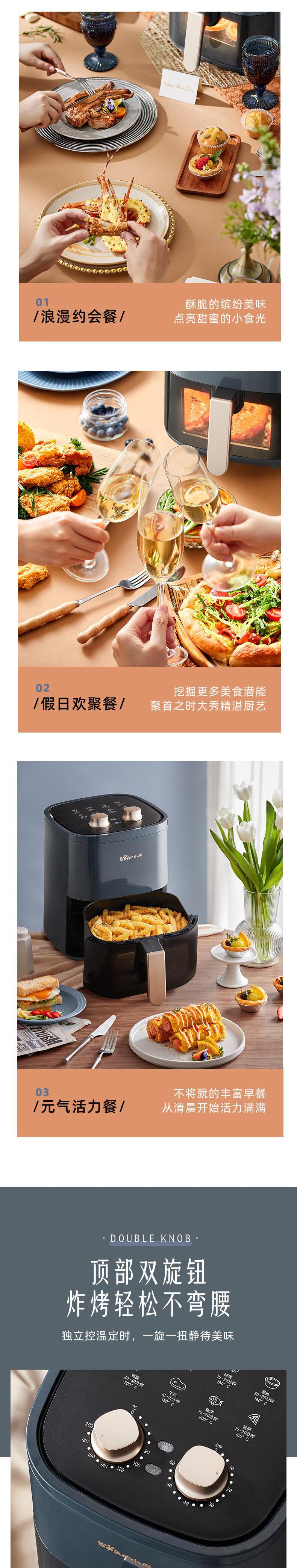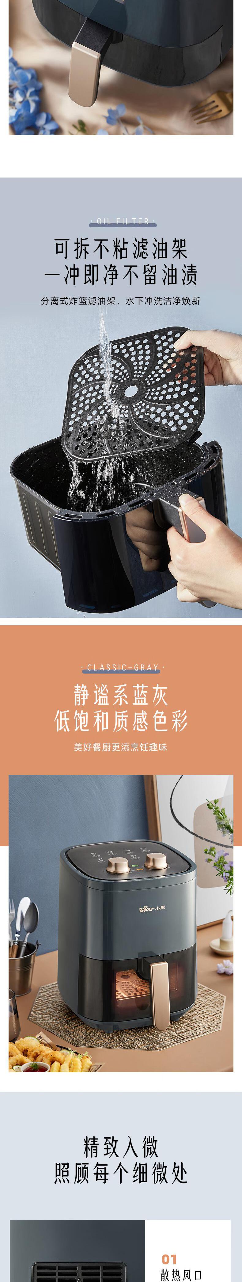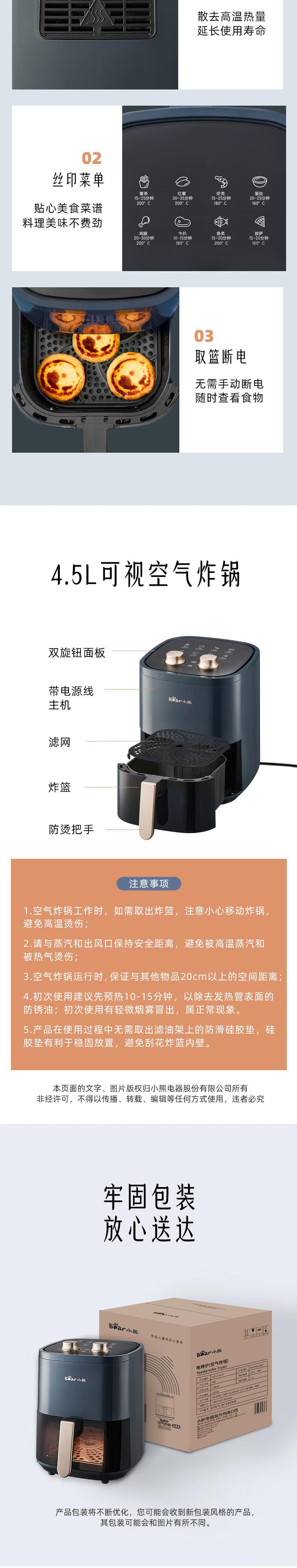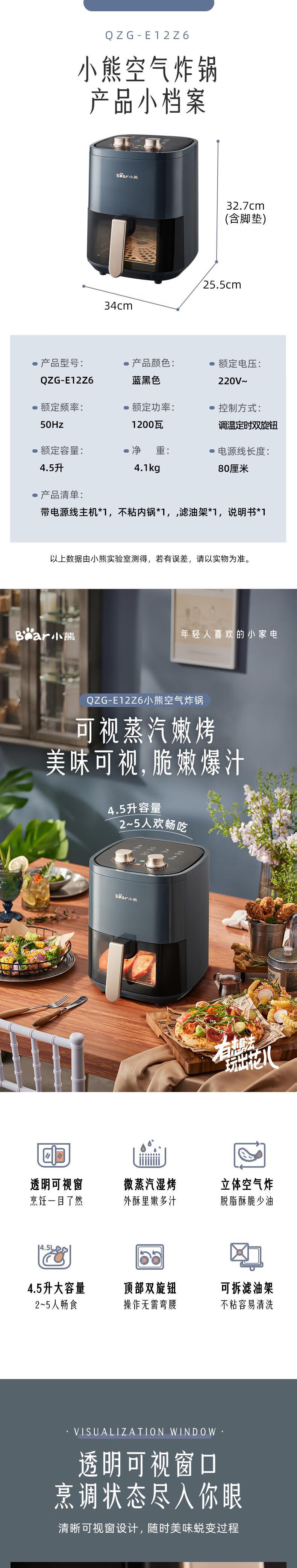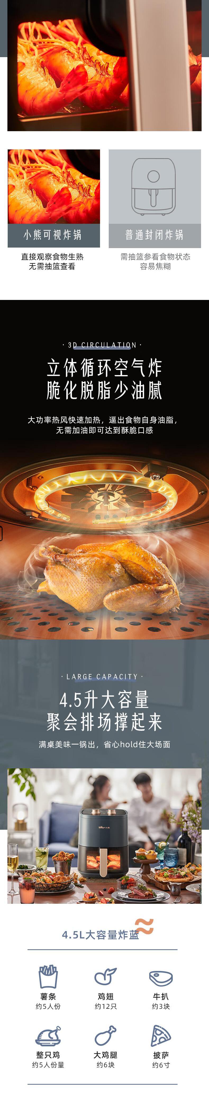 【自营】小熊空气炸锅 4.5L 家用无油烟低脂多功能电炸锅 QZG-E12Z6低油烘烤可视窗口精准控时控温不沾涂层