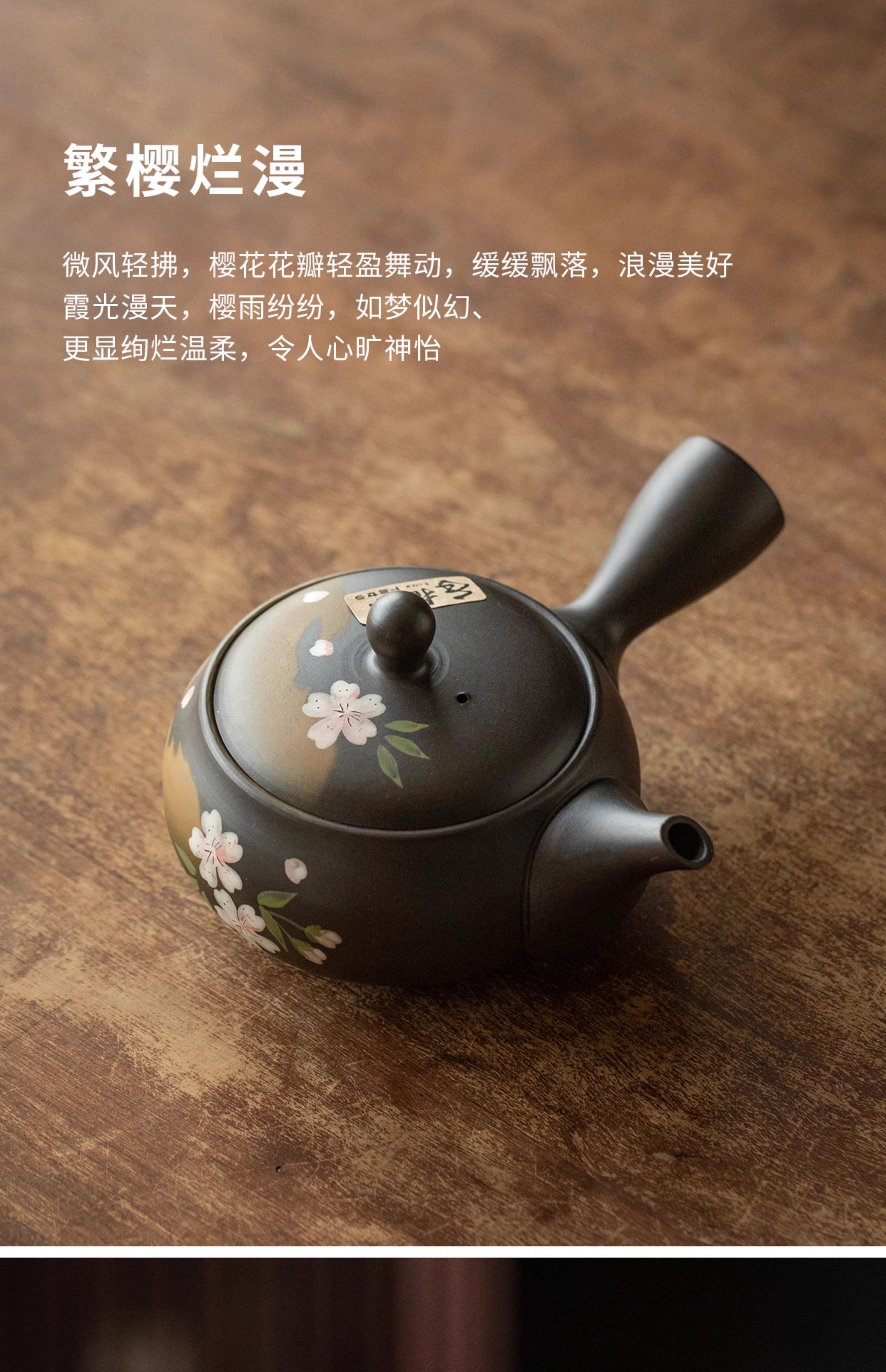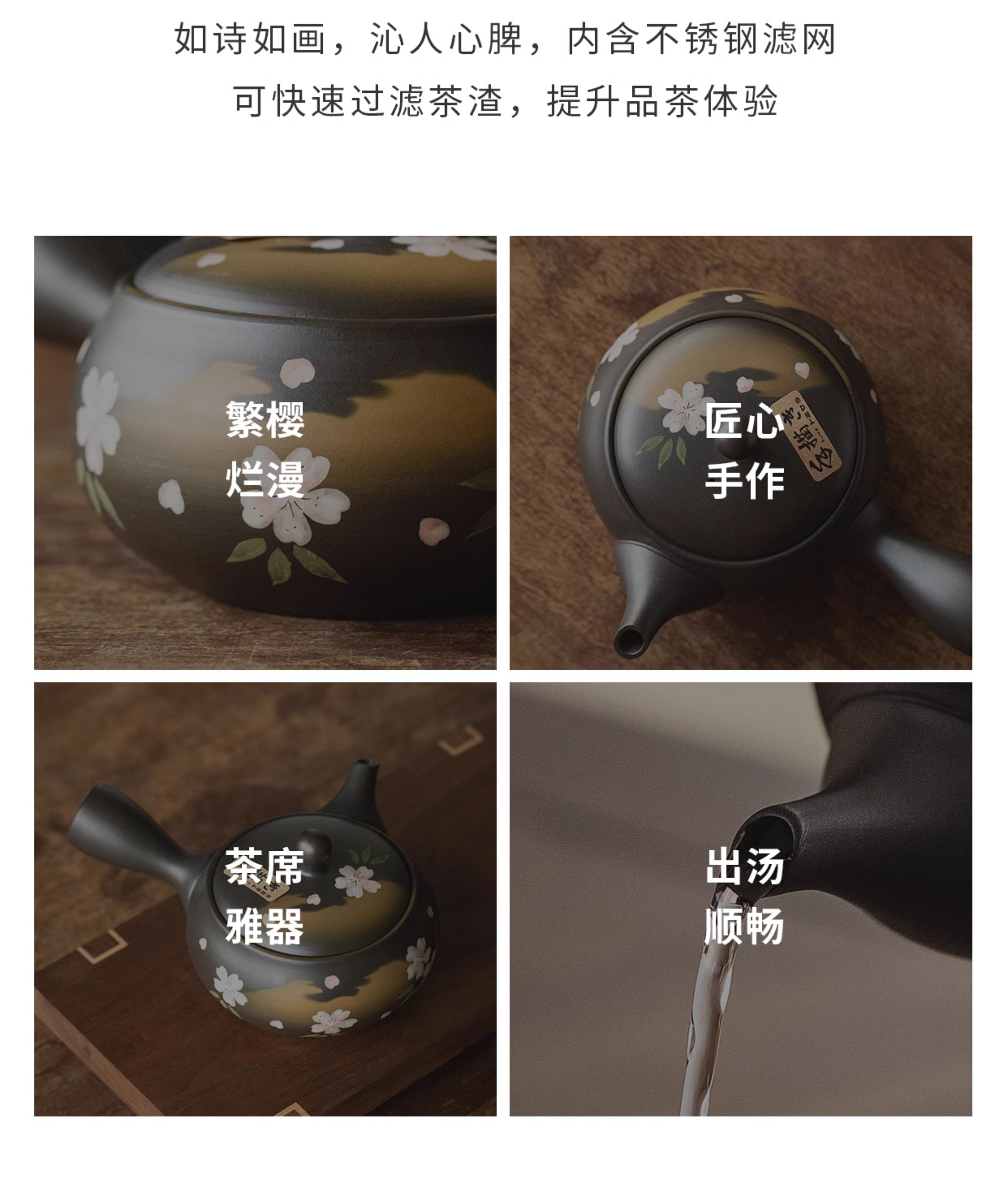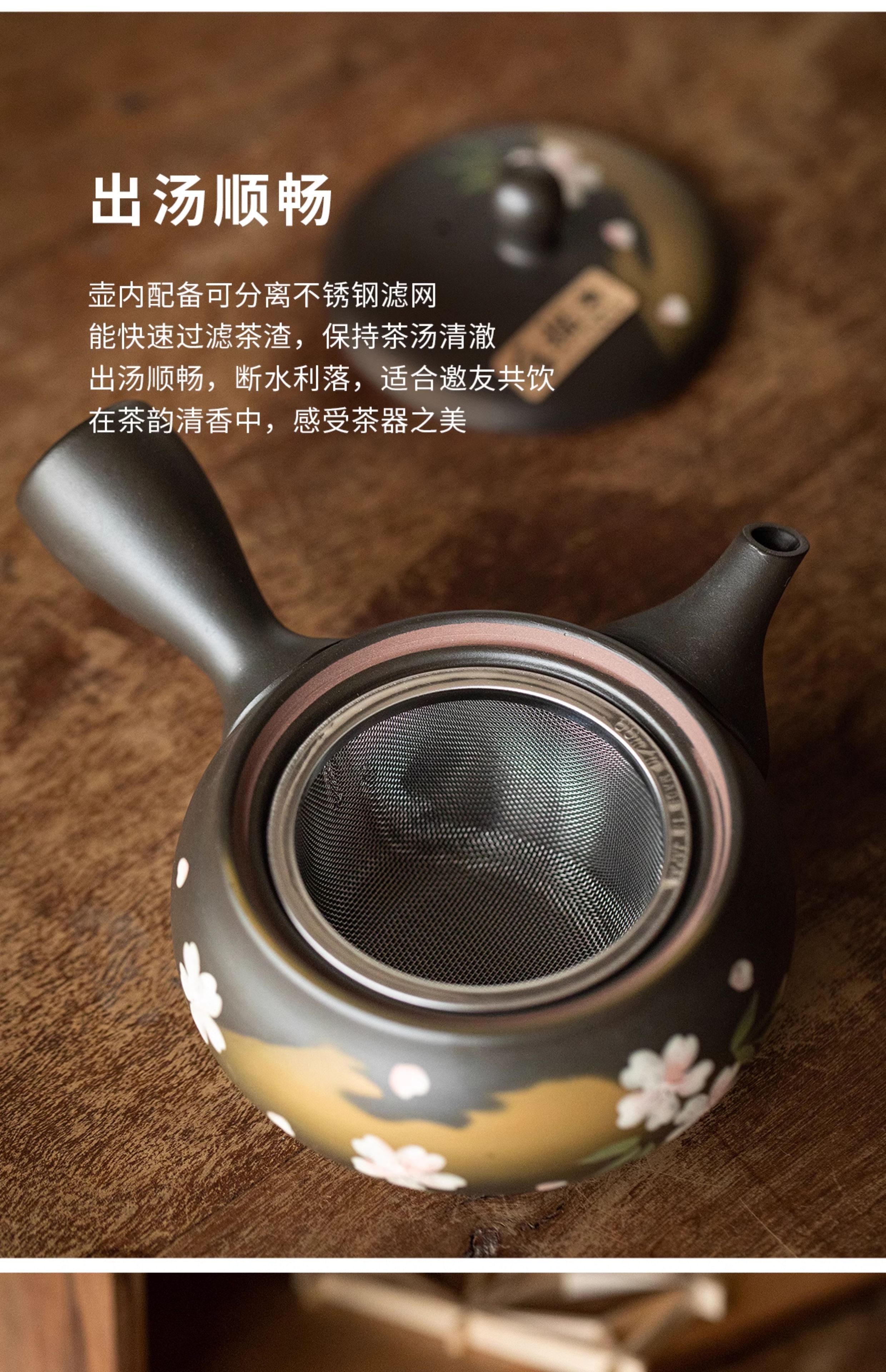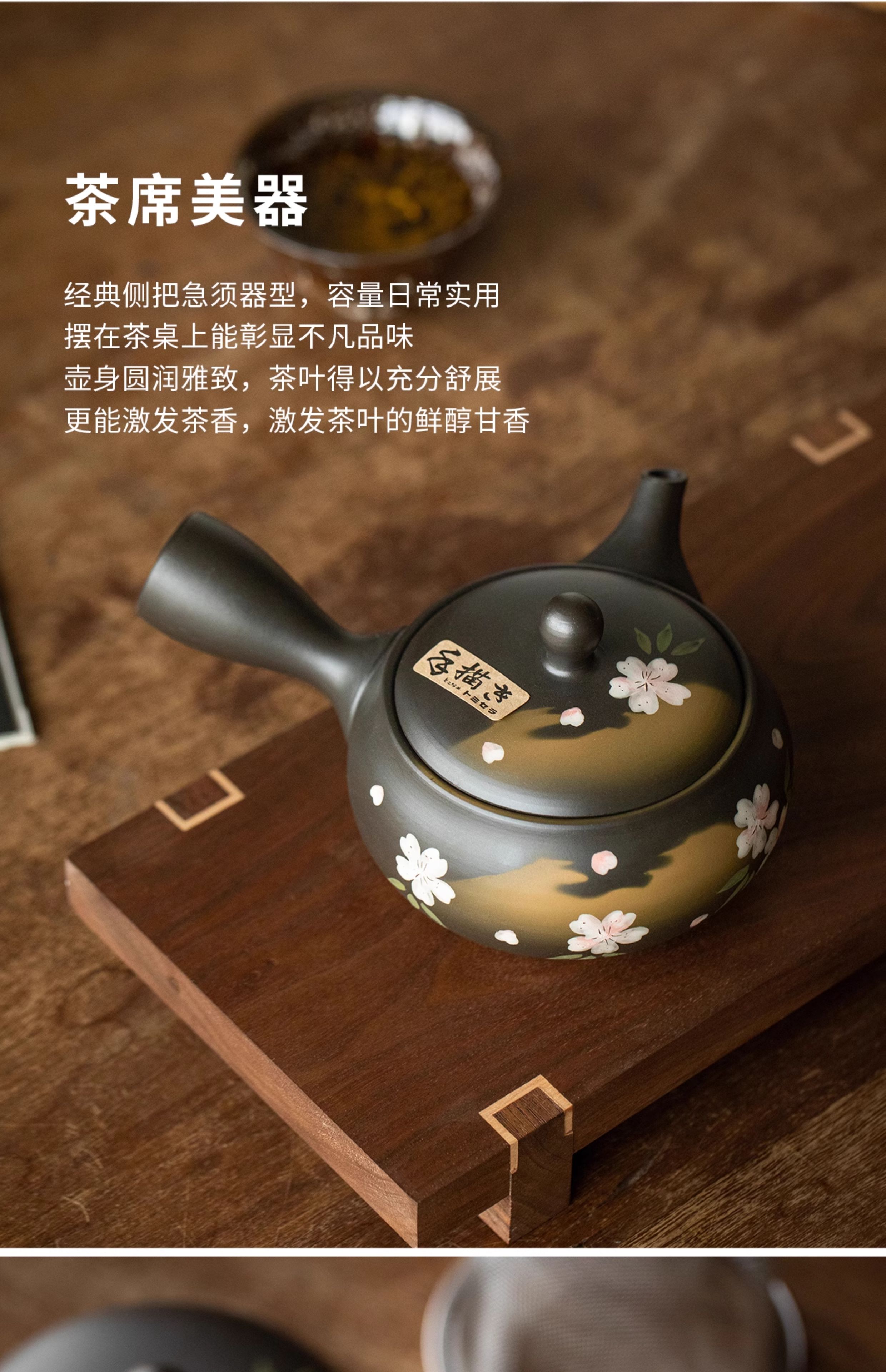 日本进口常滑烧侧把急须壶日式手工家用泡茶壶防烫过滤小清新茶具樱花流光茶壶370cc