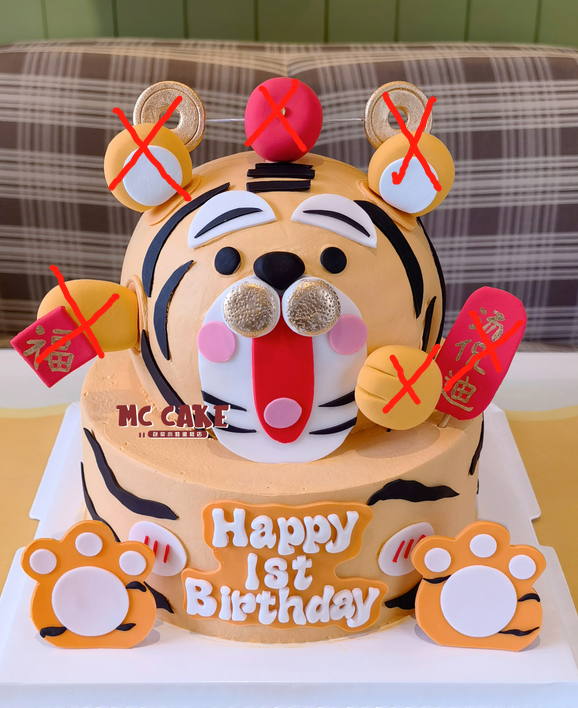 蛋糕装饰部分不可以吃:老虎宝宝的两个手,姓名牌、虎耳朵、铜钱、红色帽子;