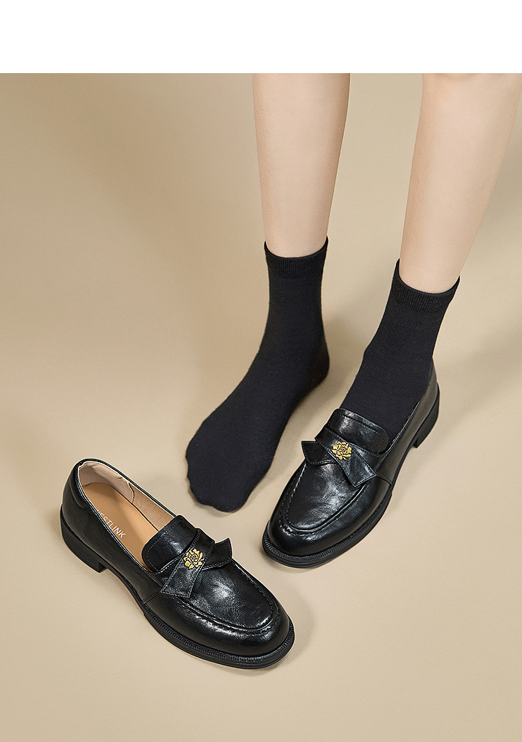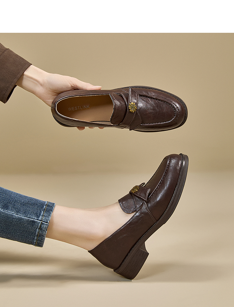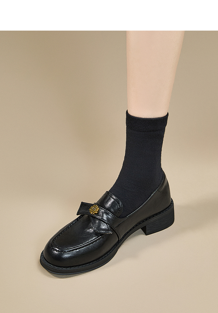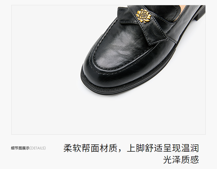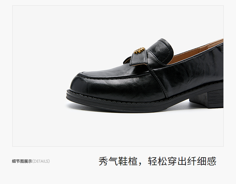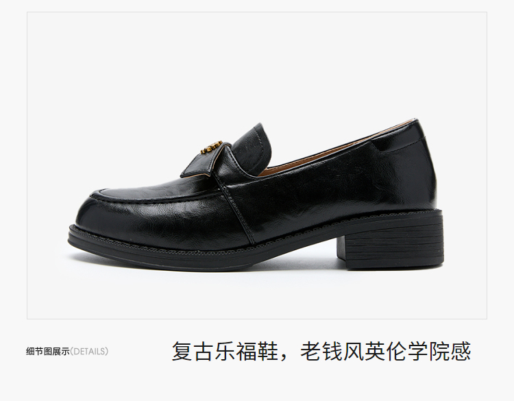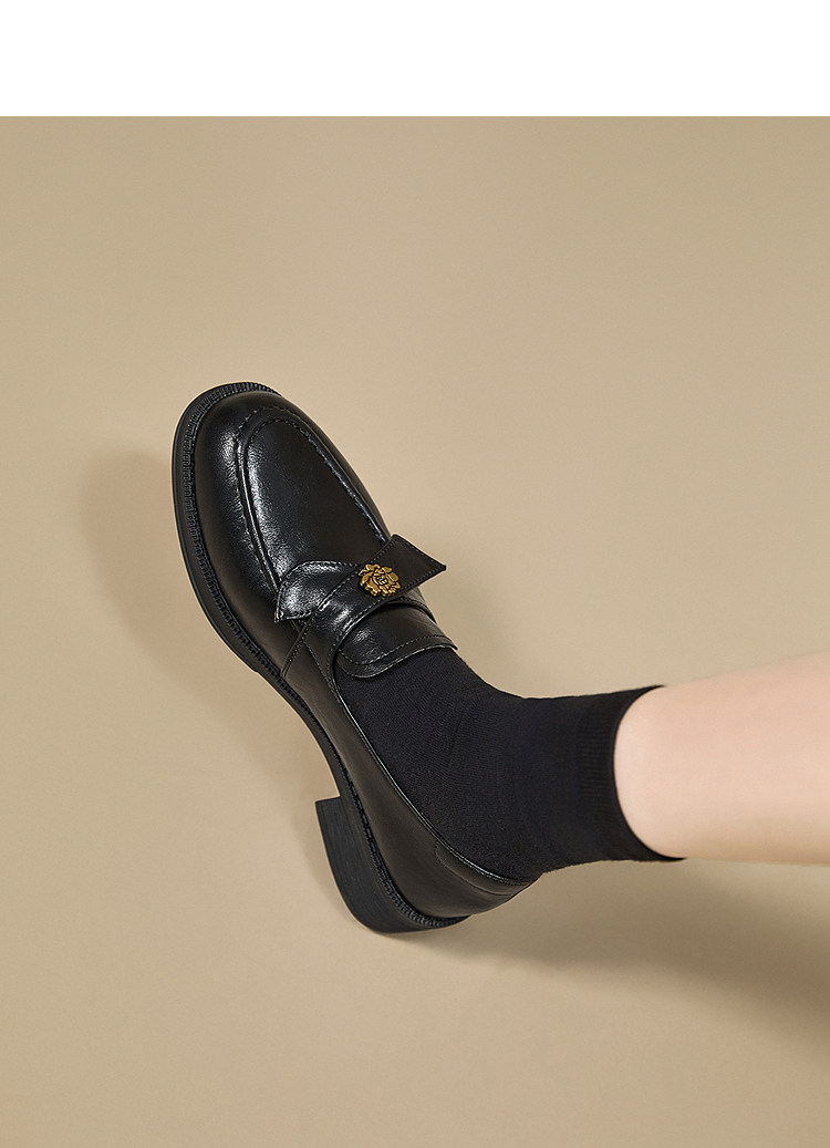 西遇复古乐福鞋女新款秋季法式老钱风粗跟单鞋子山茶花小皮鞋V0057228