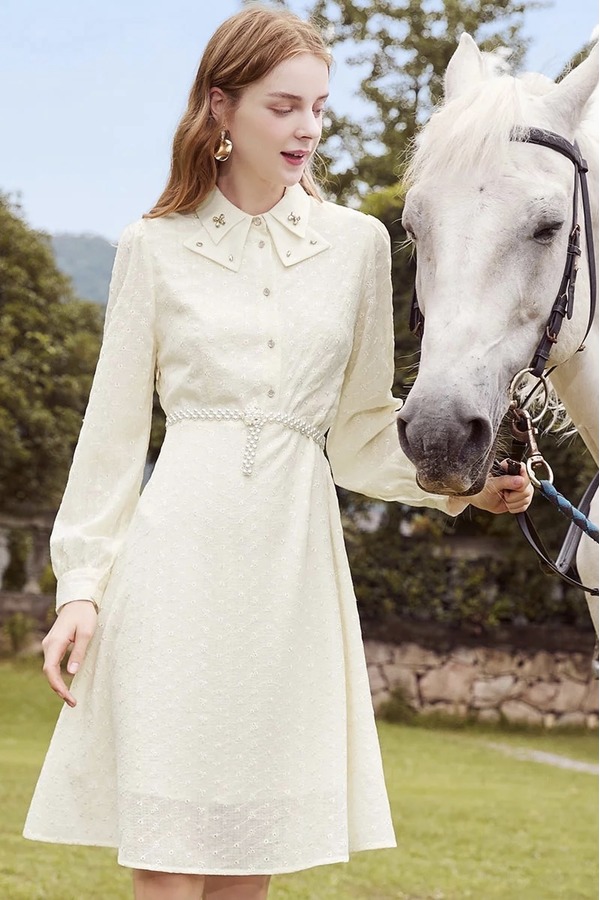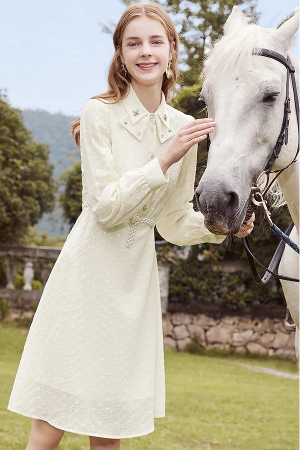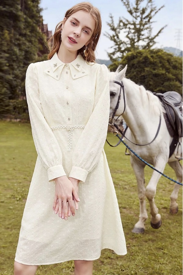 yigue/亦谷 翻领碎钻娃娃中长款连衣裙 15396