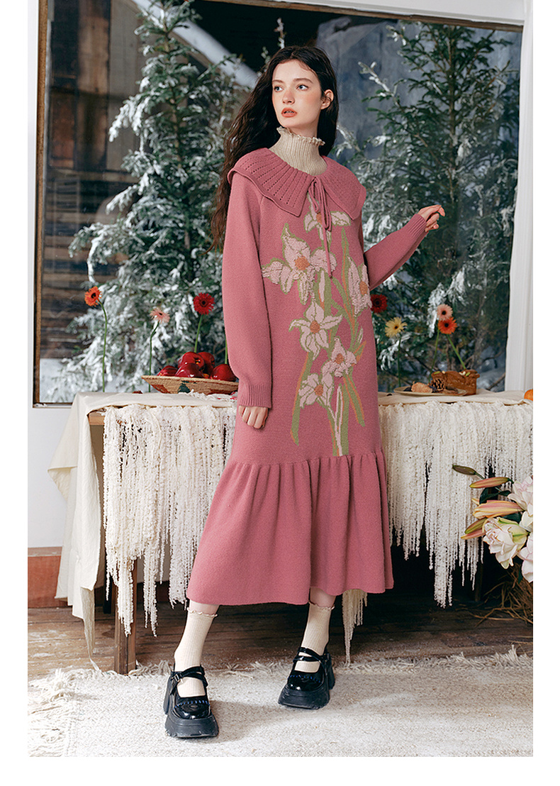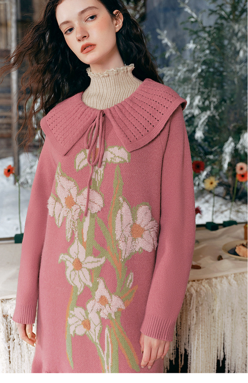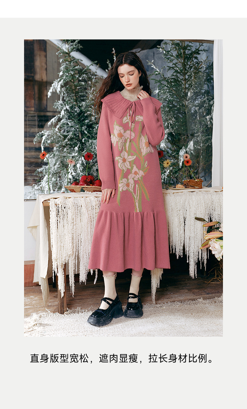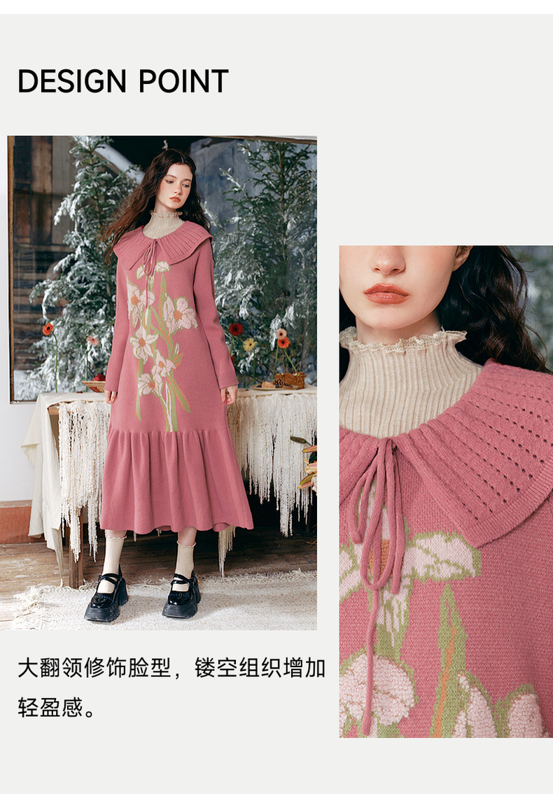 两三事花漾甜情2024冬新款甜美镂空大翻领大花毛巾绣毛衣裙连衣裙