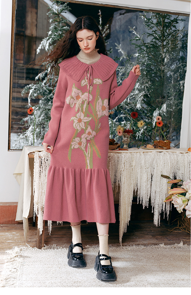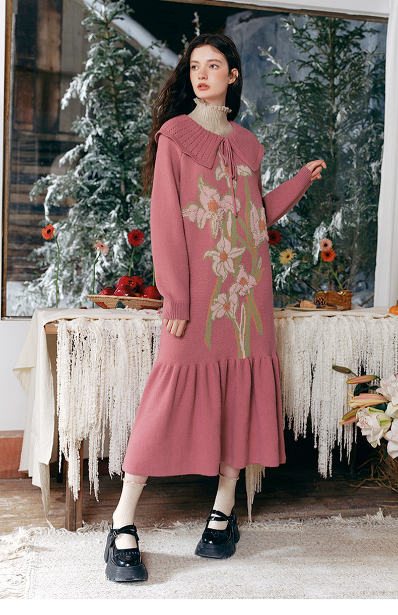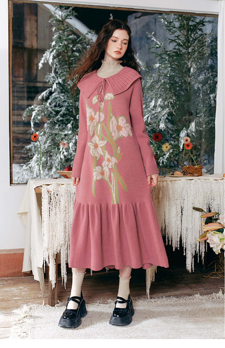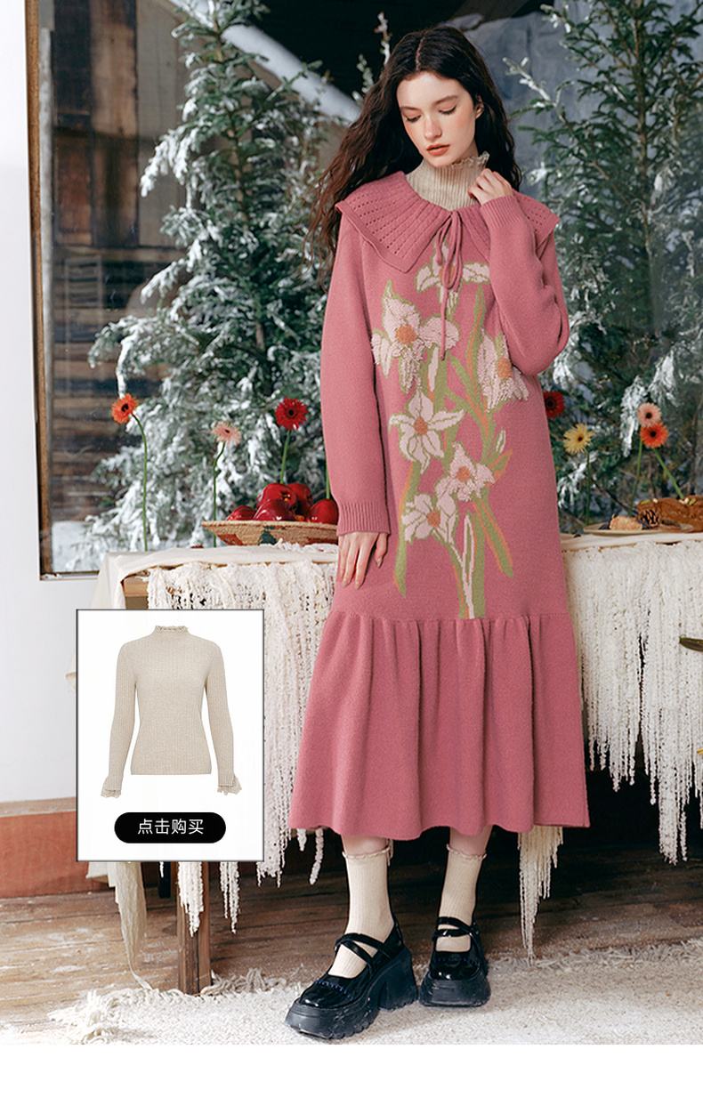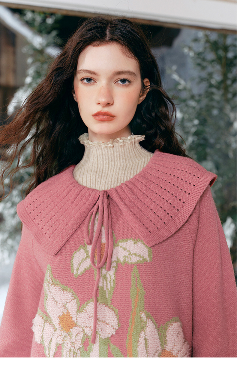 两三事花漾甜情2024冬新款甜美镂空大翻领大花毛巾绣毛衣裙连衣裙