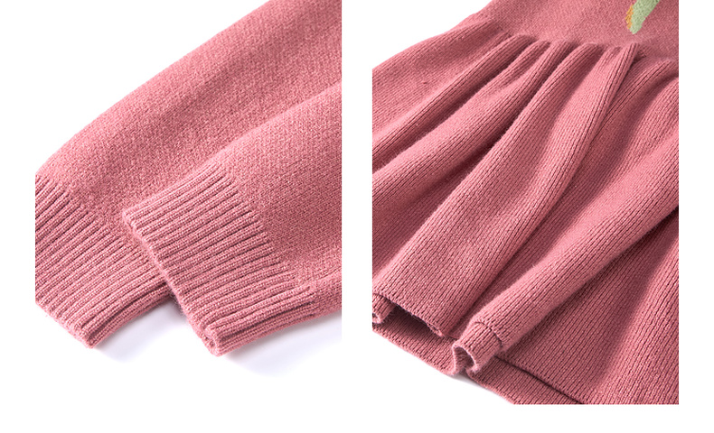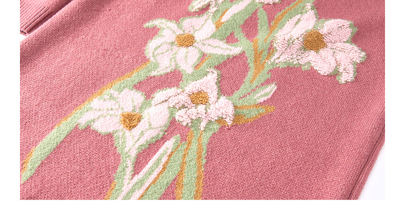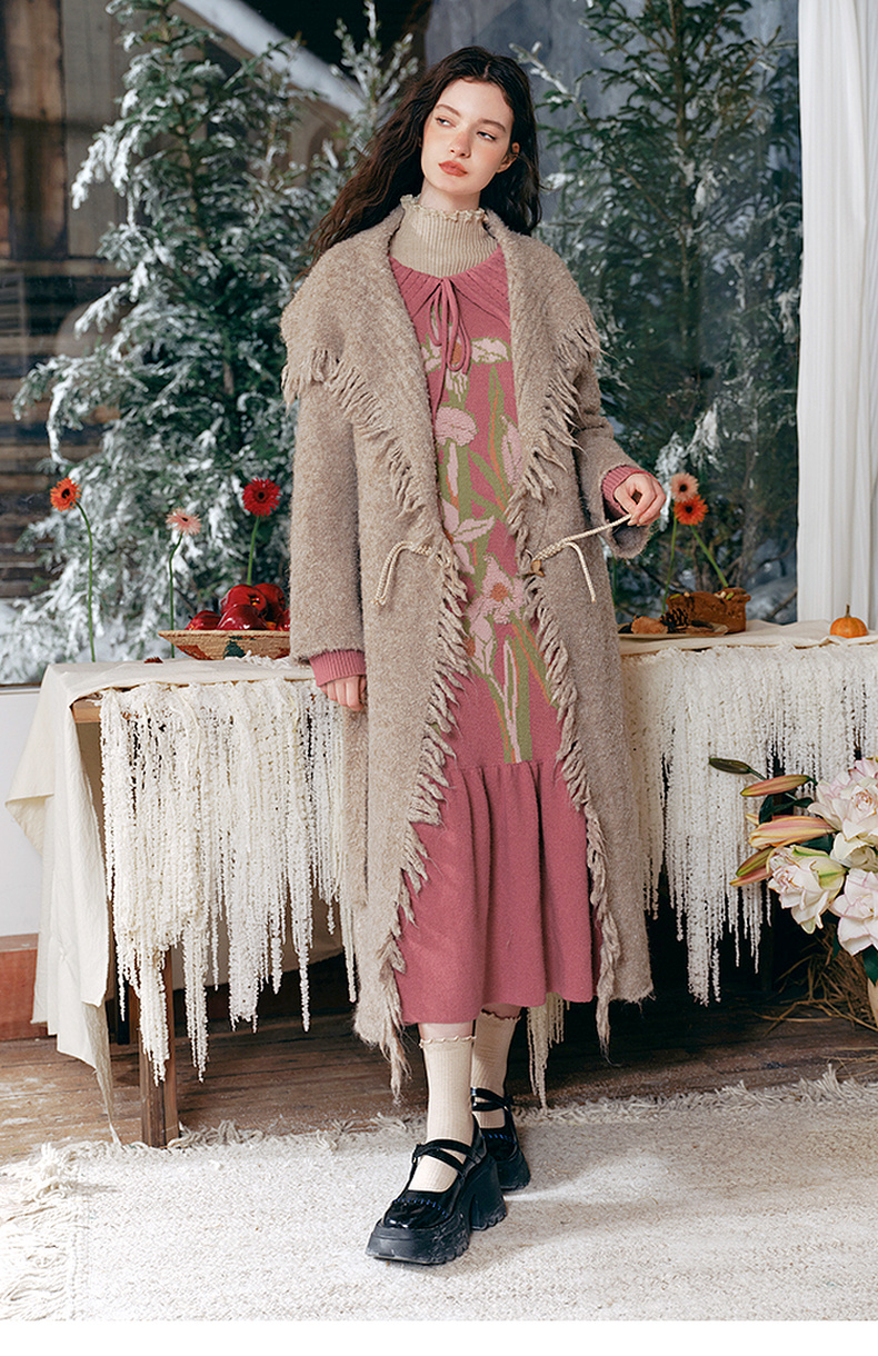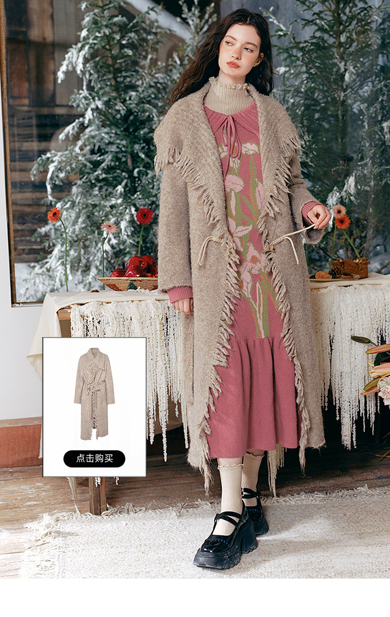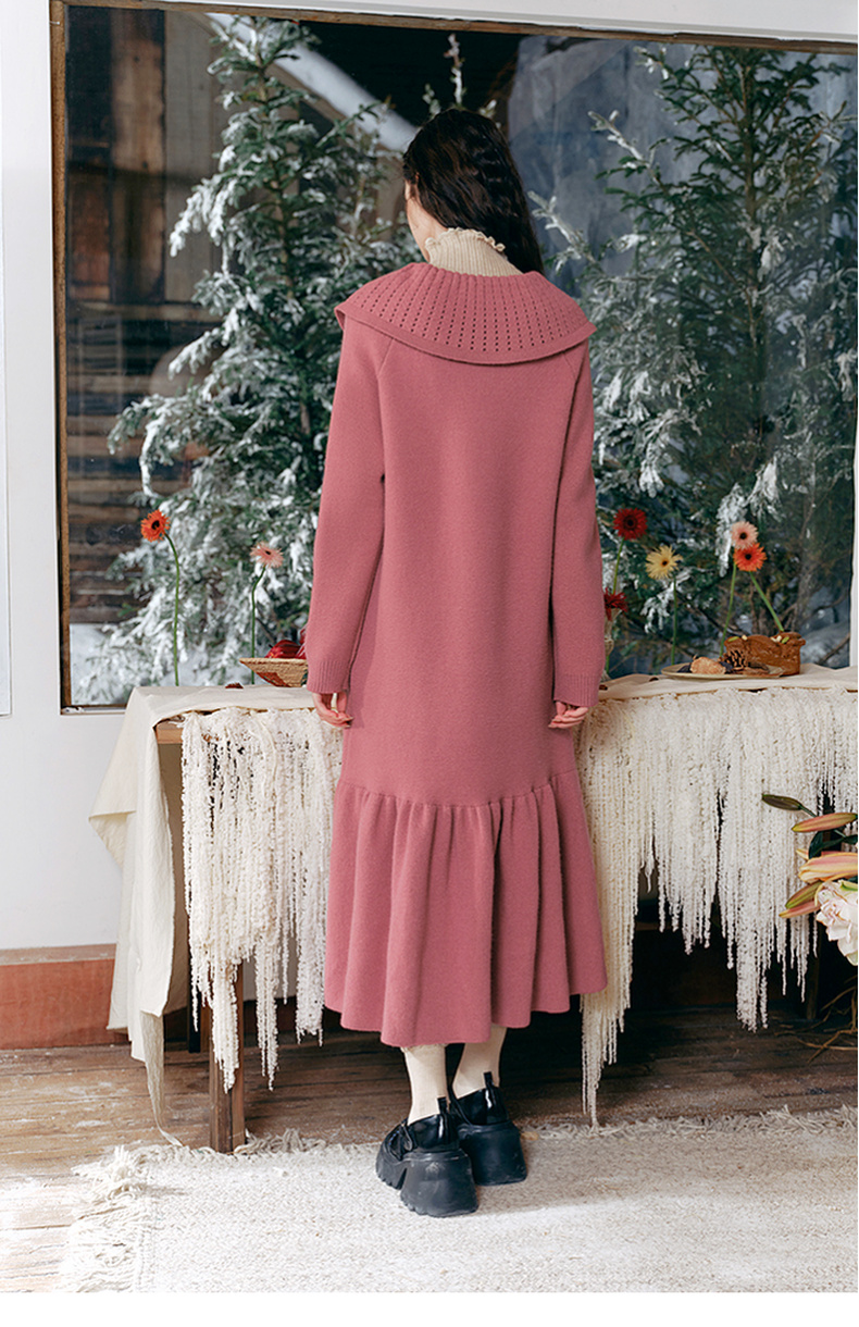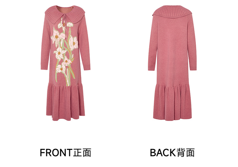 两三事花漾甜情2024冬新款甜美镂空大翻领大花毛巾绣毛衣裙连衣裙