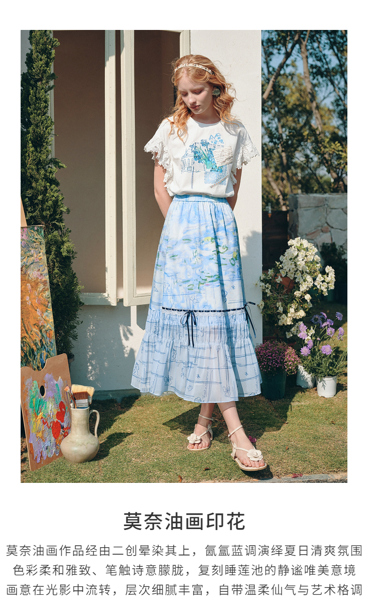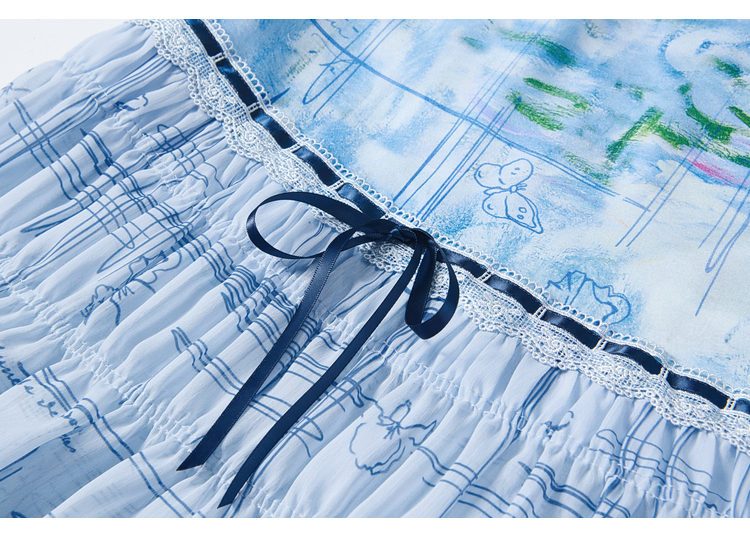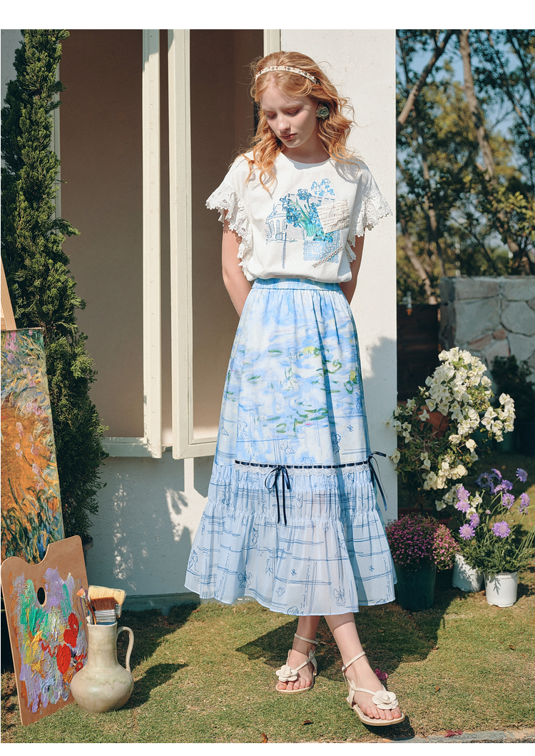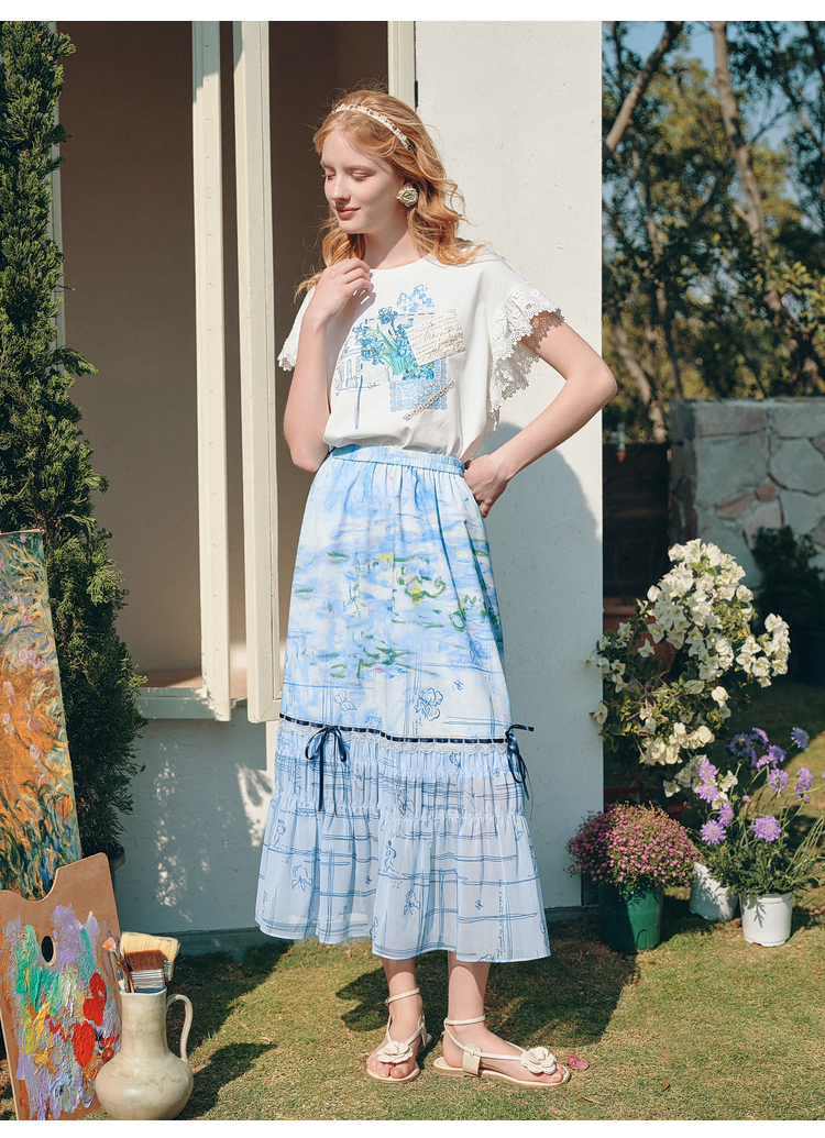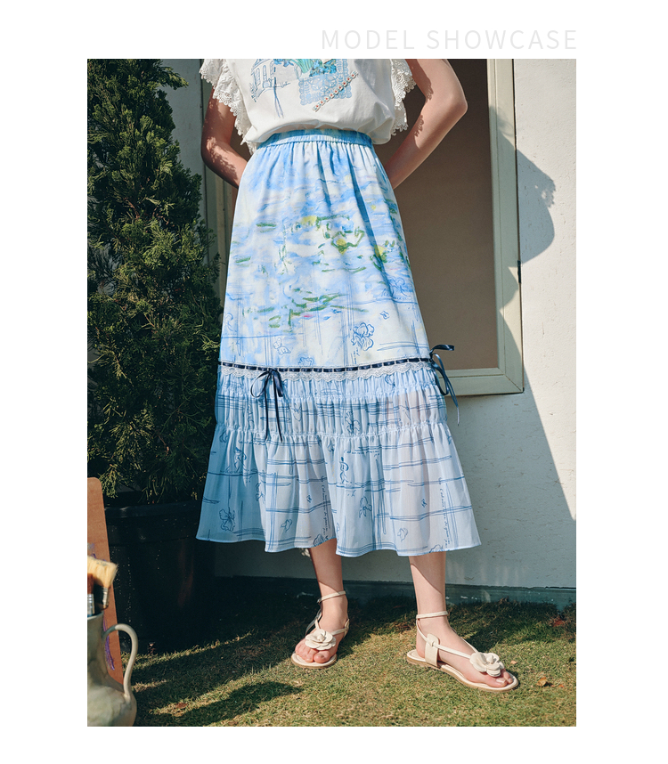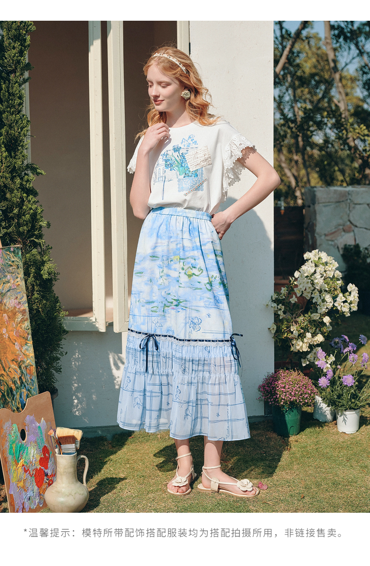 两三事雾屿微光2026夏季新款小清新蝴蝶结蕾丝拼接印花高腰半身裙