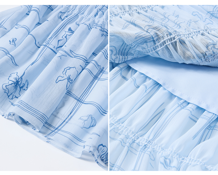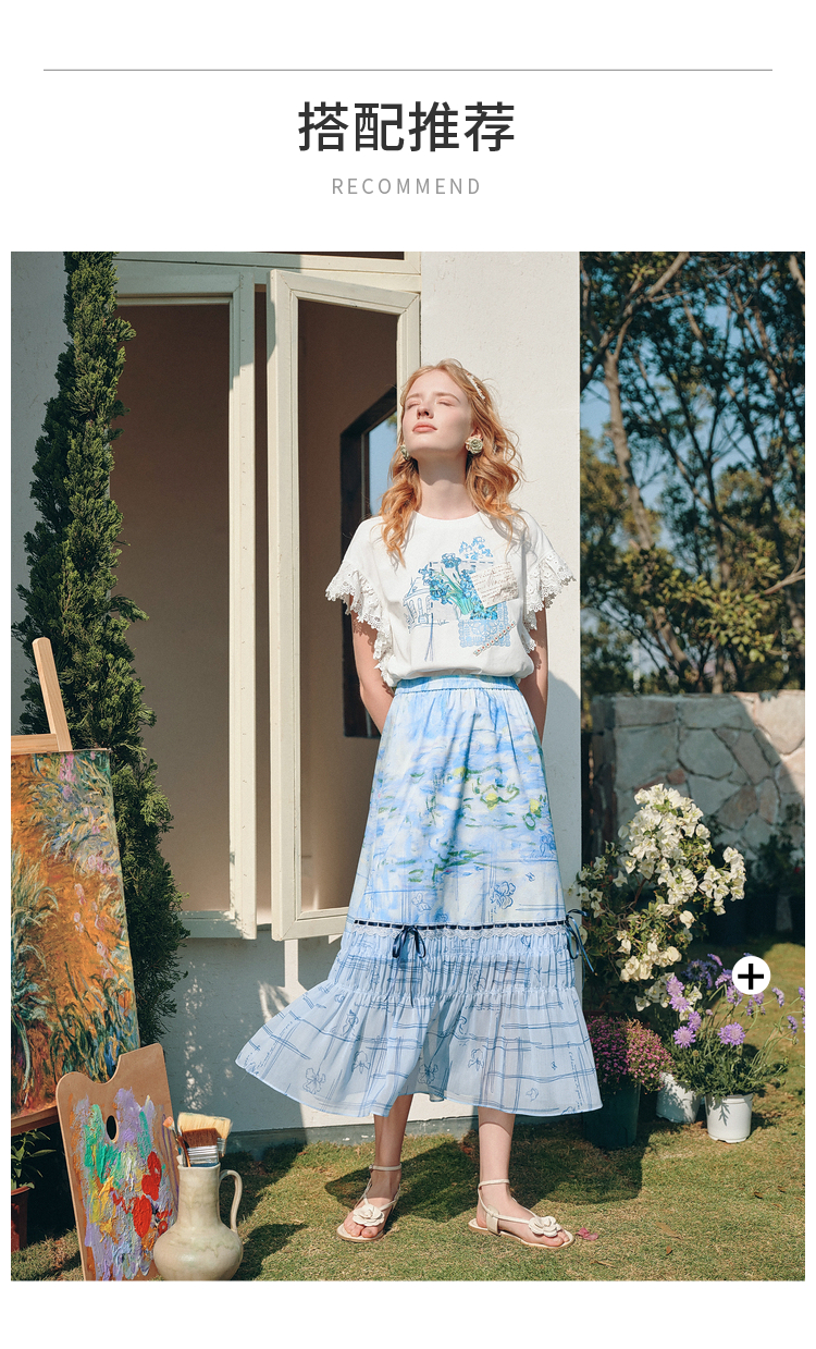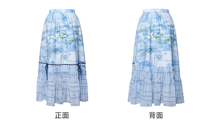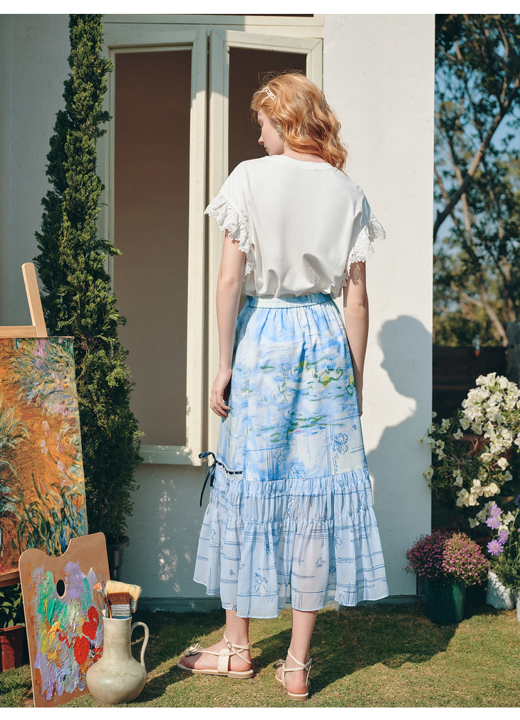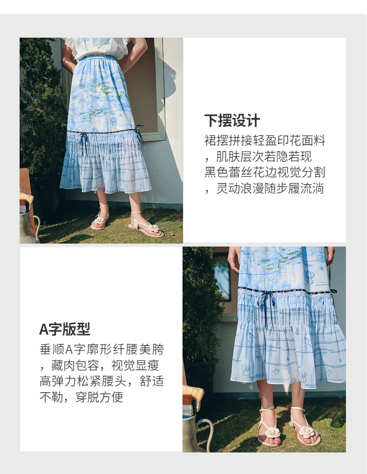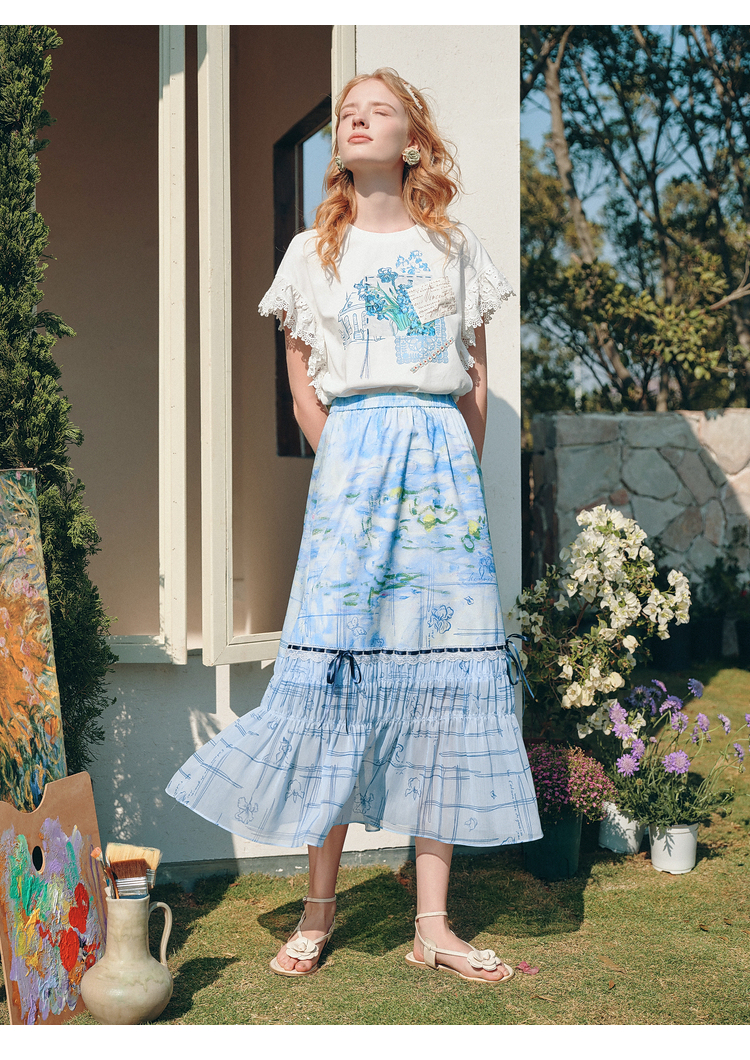 两三事雾屿微光2026夏季新款小清新蝴蝶结蕾丝拼接印花高腰半身裙