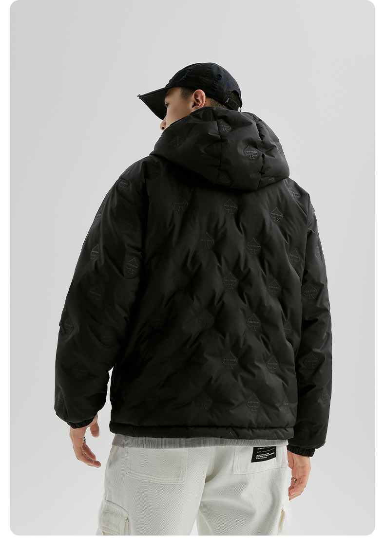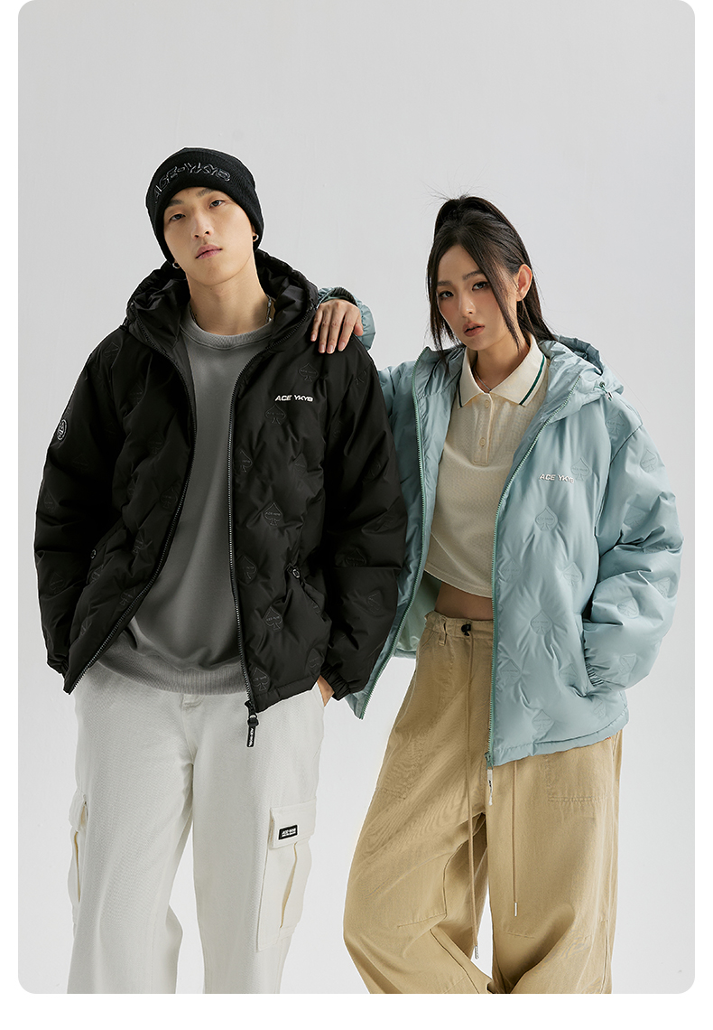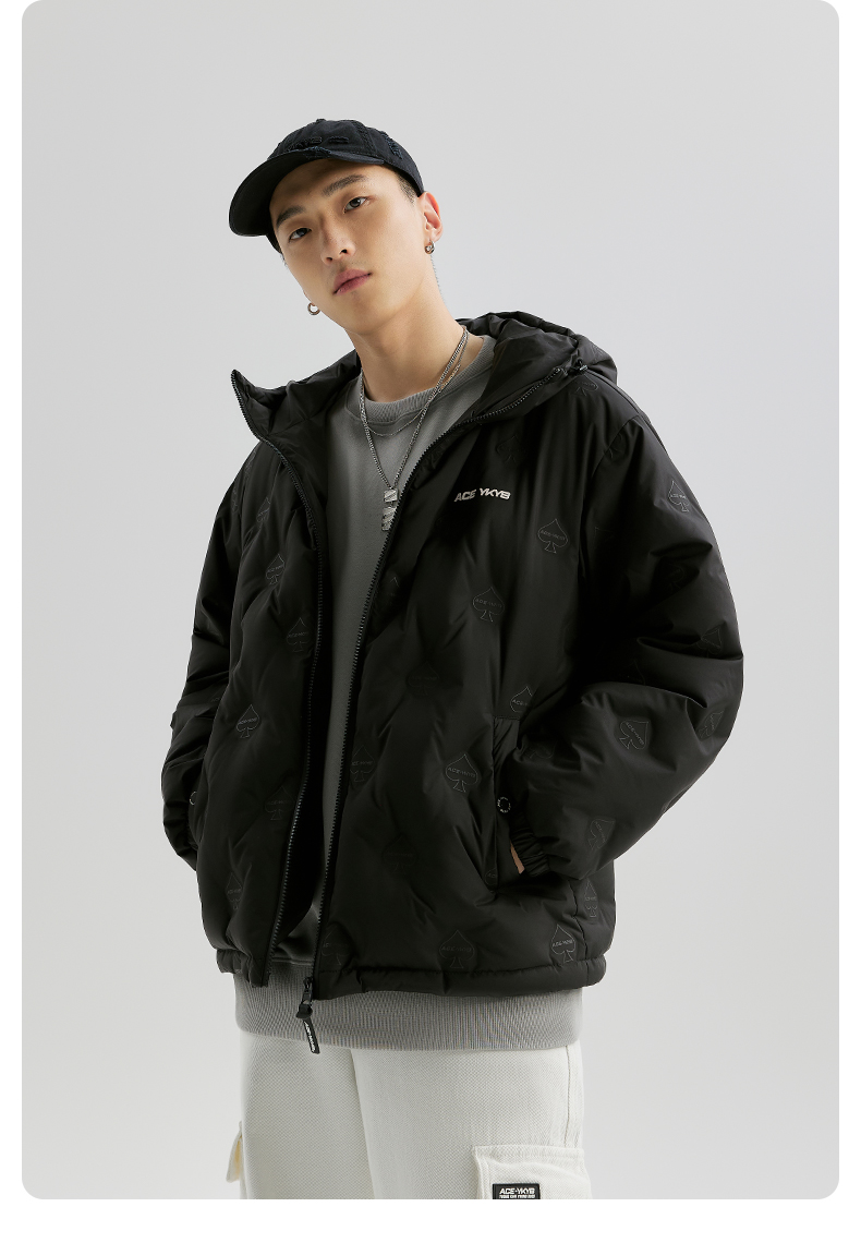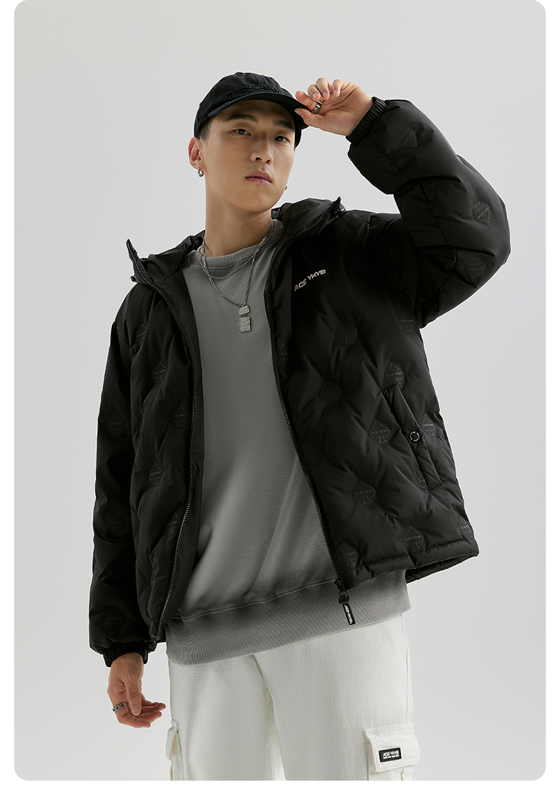 YKYB连帽羽绒服冬季新款潮牌上衣街头休闲黑桃压花夜光宽松外套