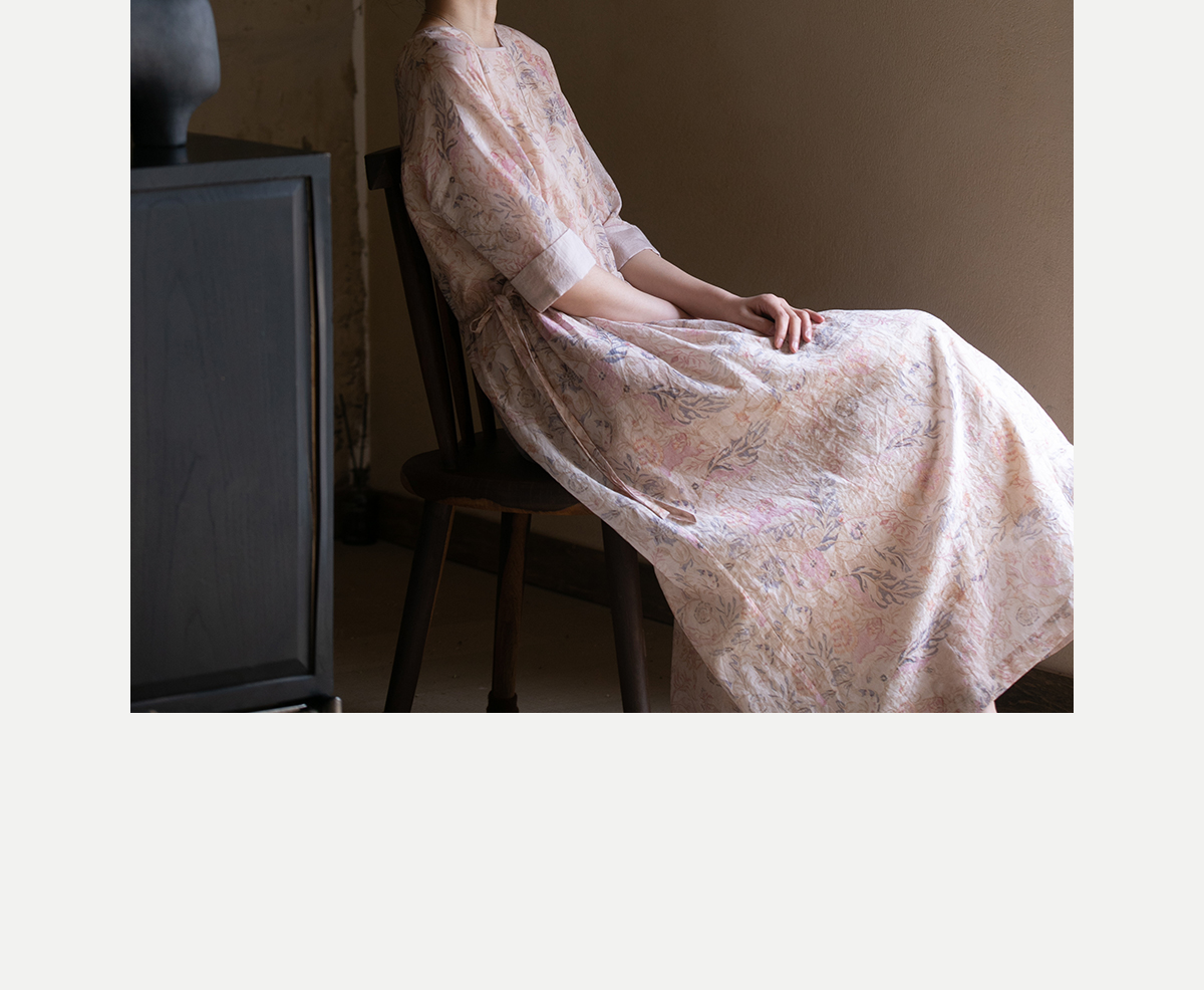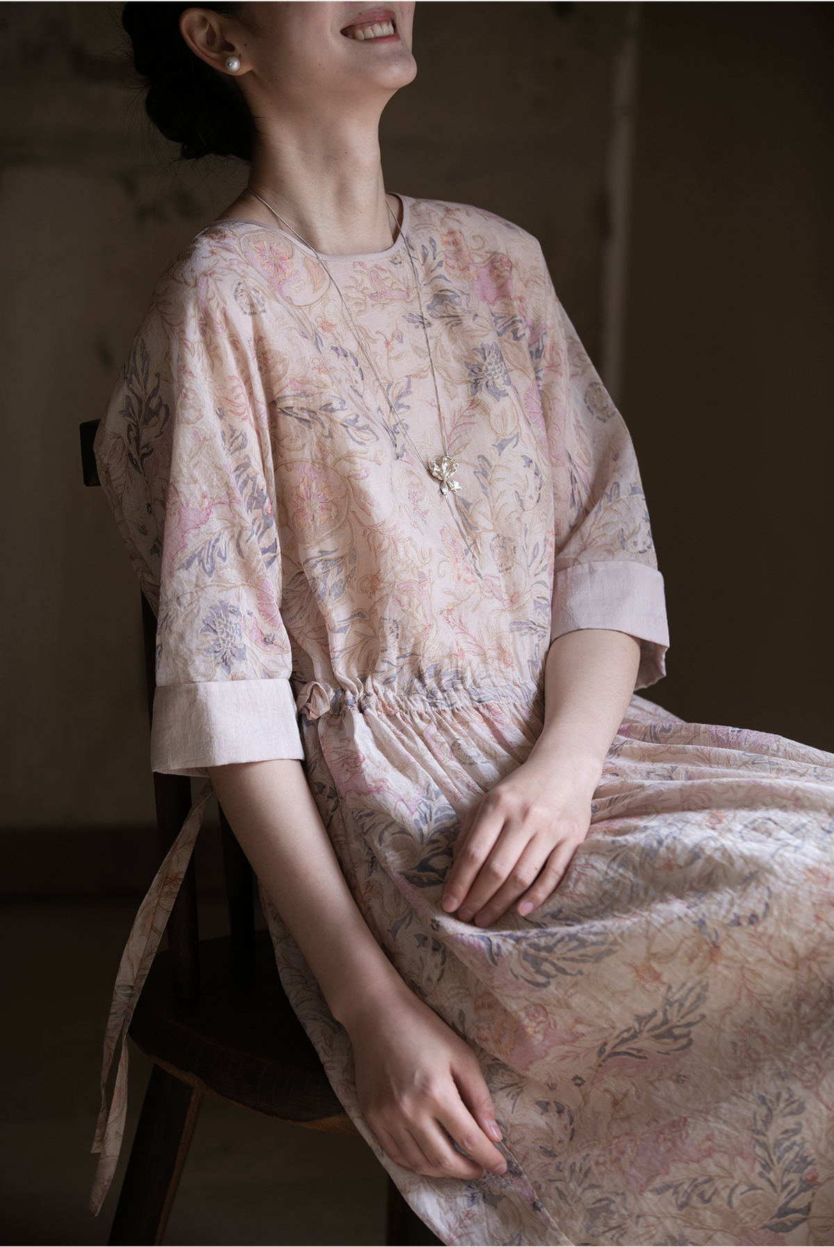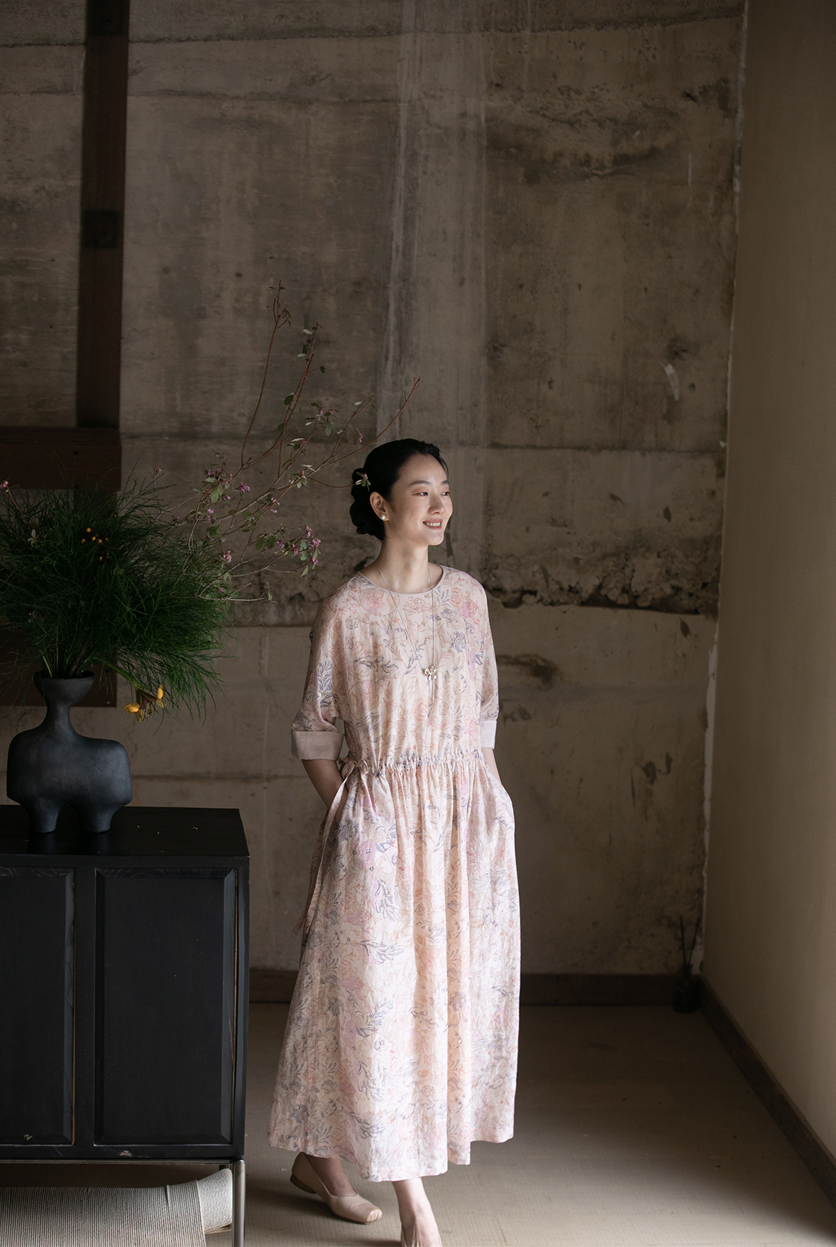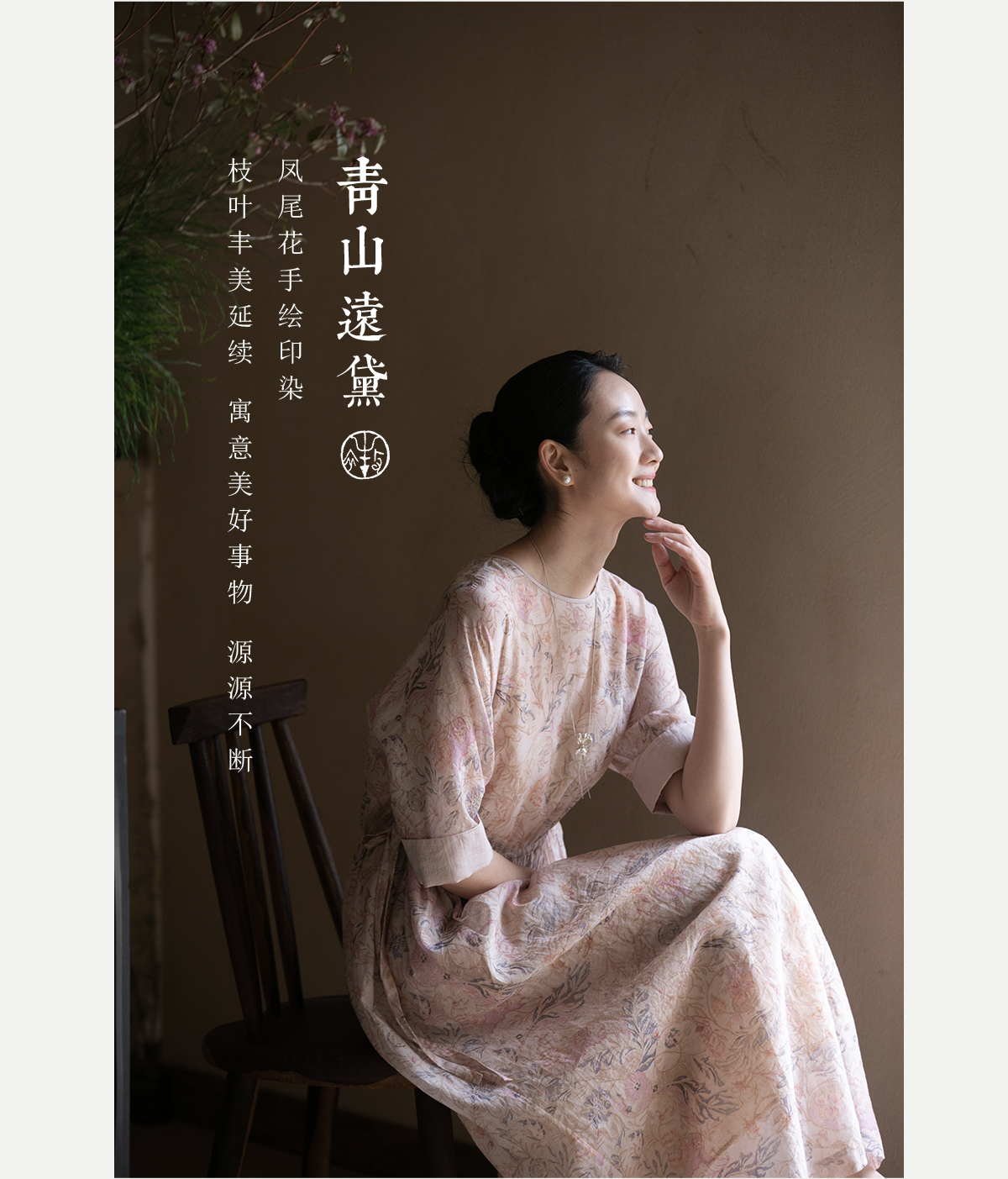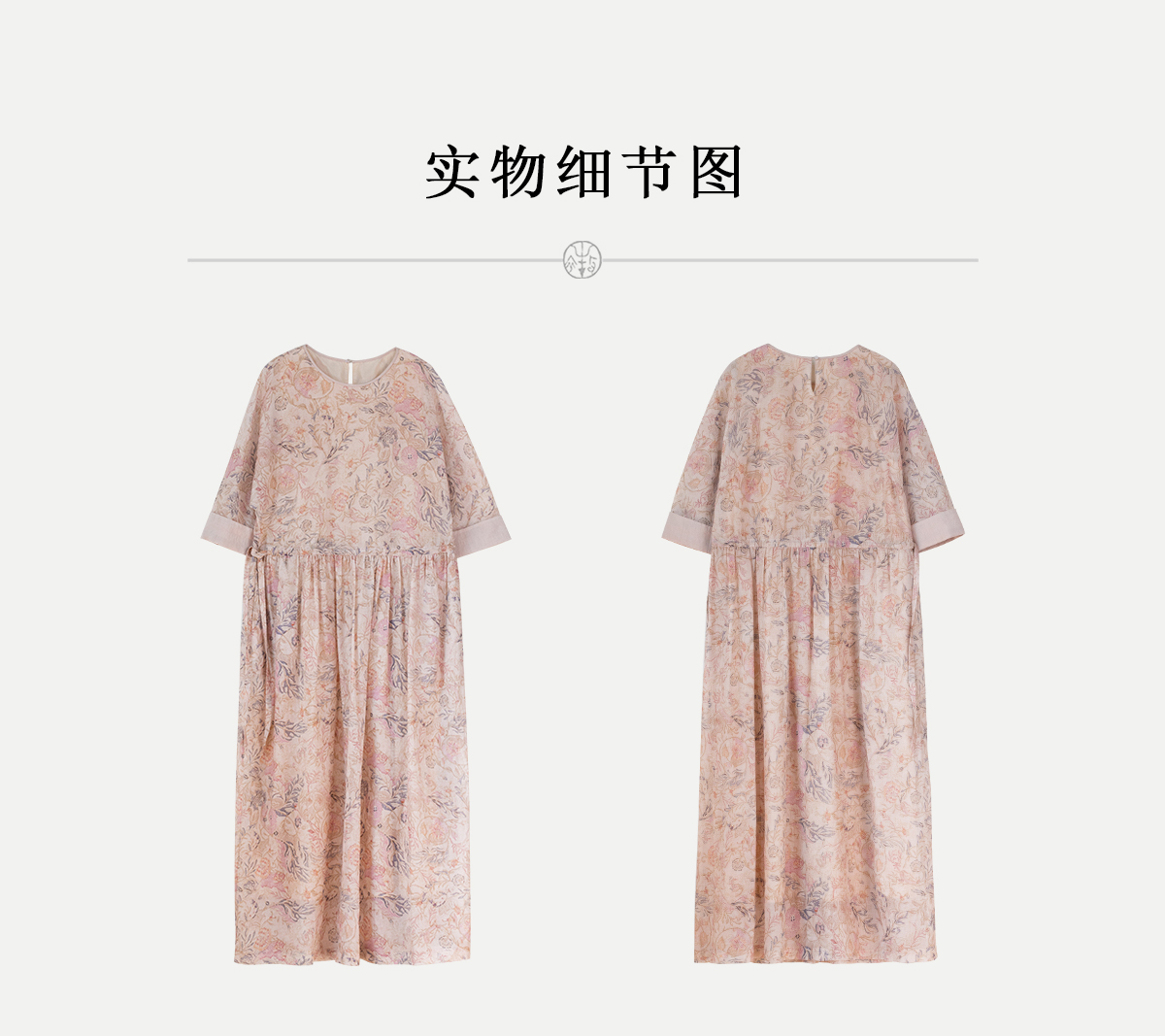 牧衣游原创 丝棉印染连衣裙新品轻薄圆领宽松文艺气质长裙 画舫