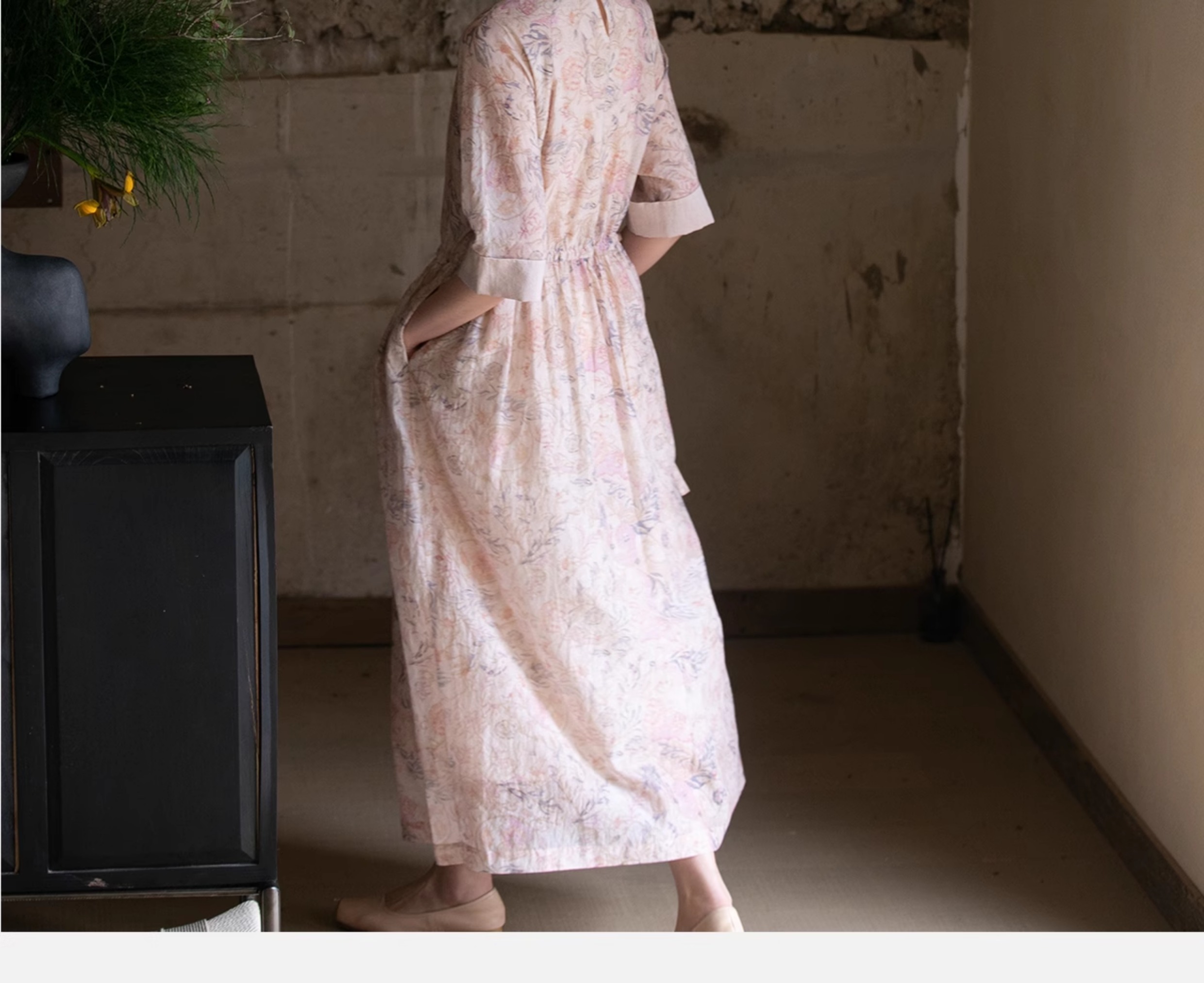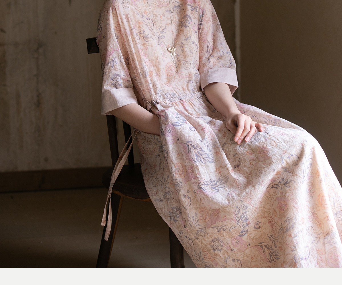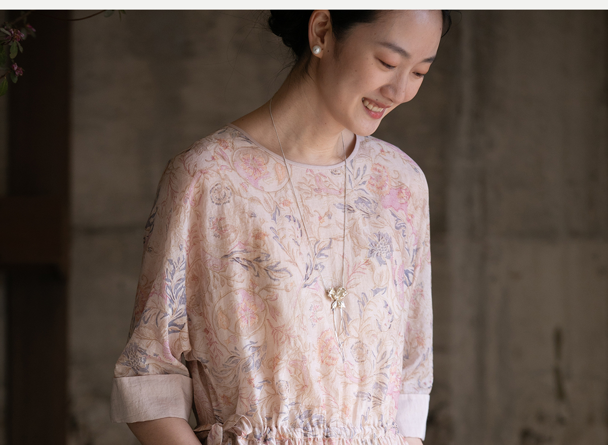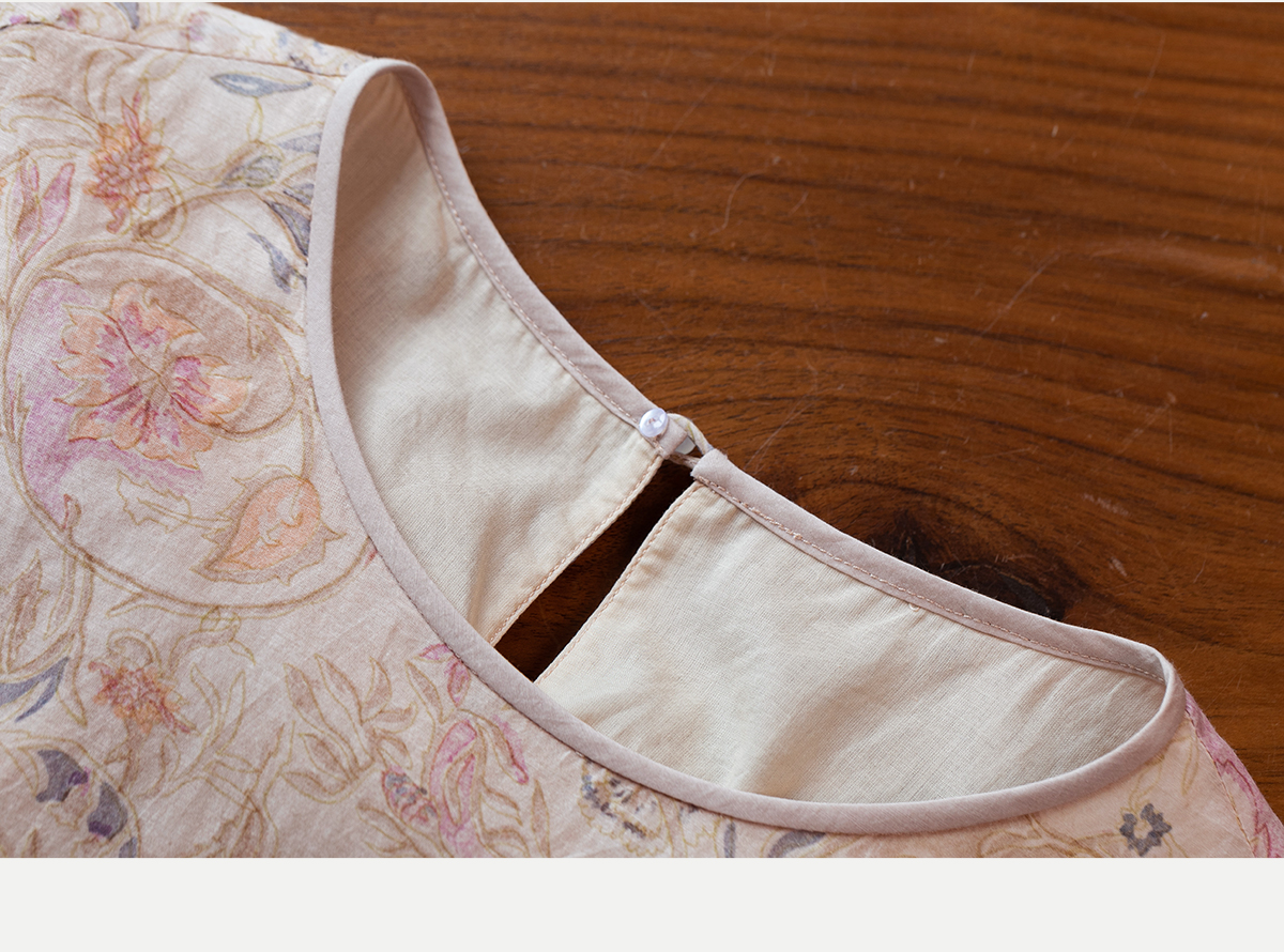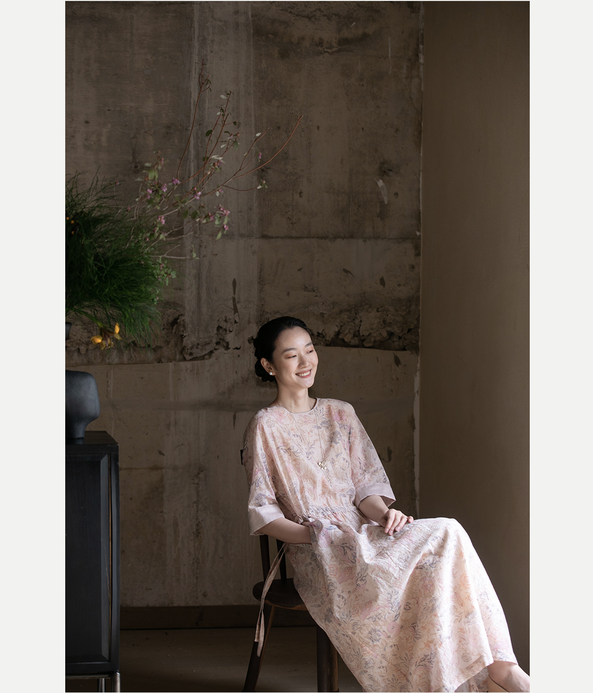 牧衣游原创 丝棉印染连衣裙新品轻薄圆领宽松文艺气质长裙 画舫