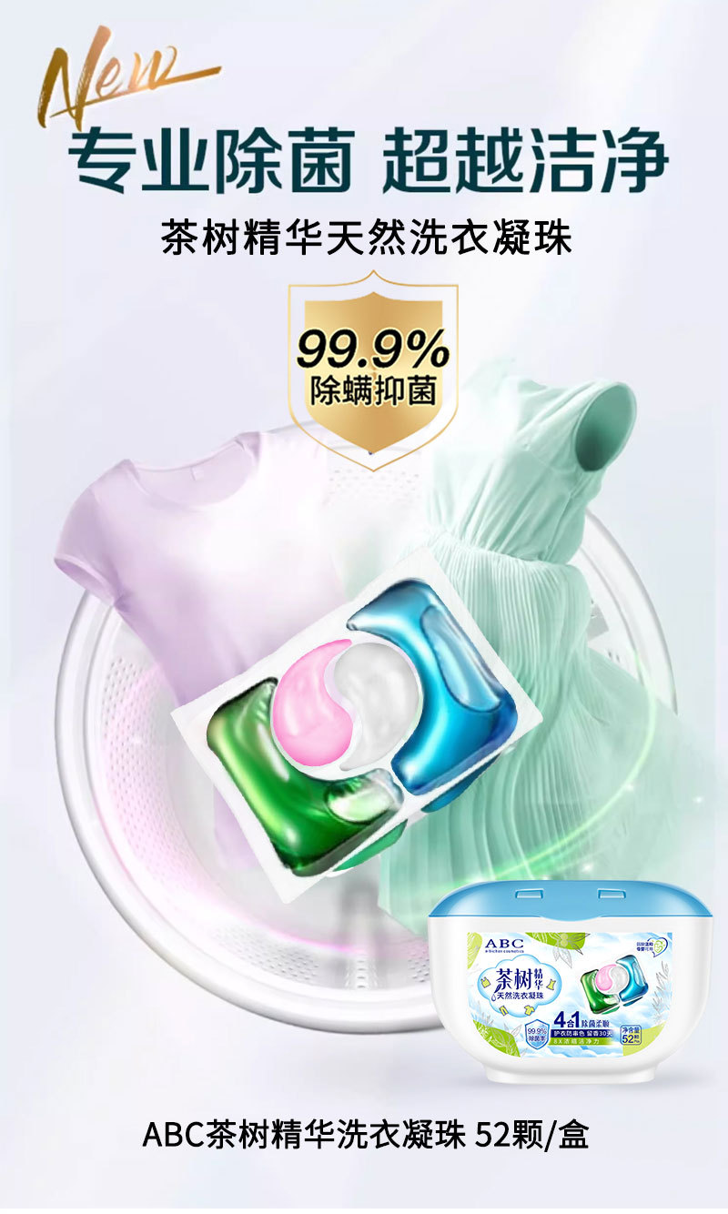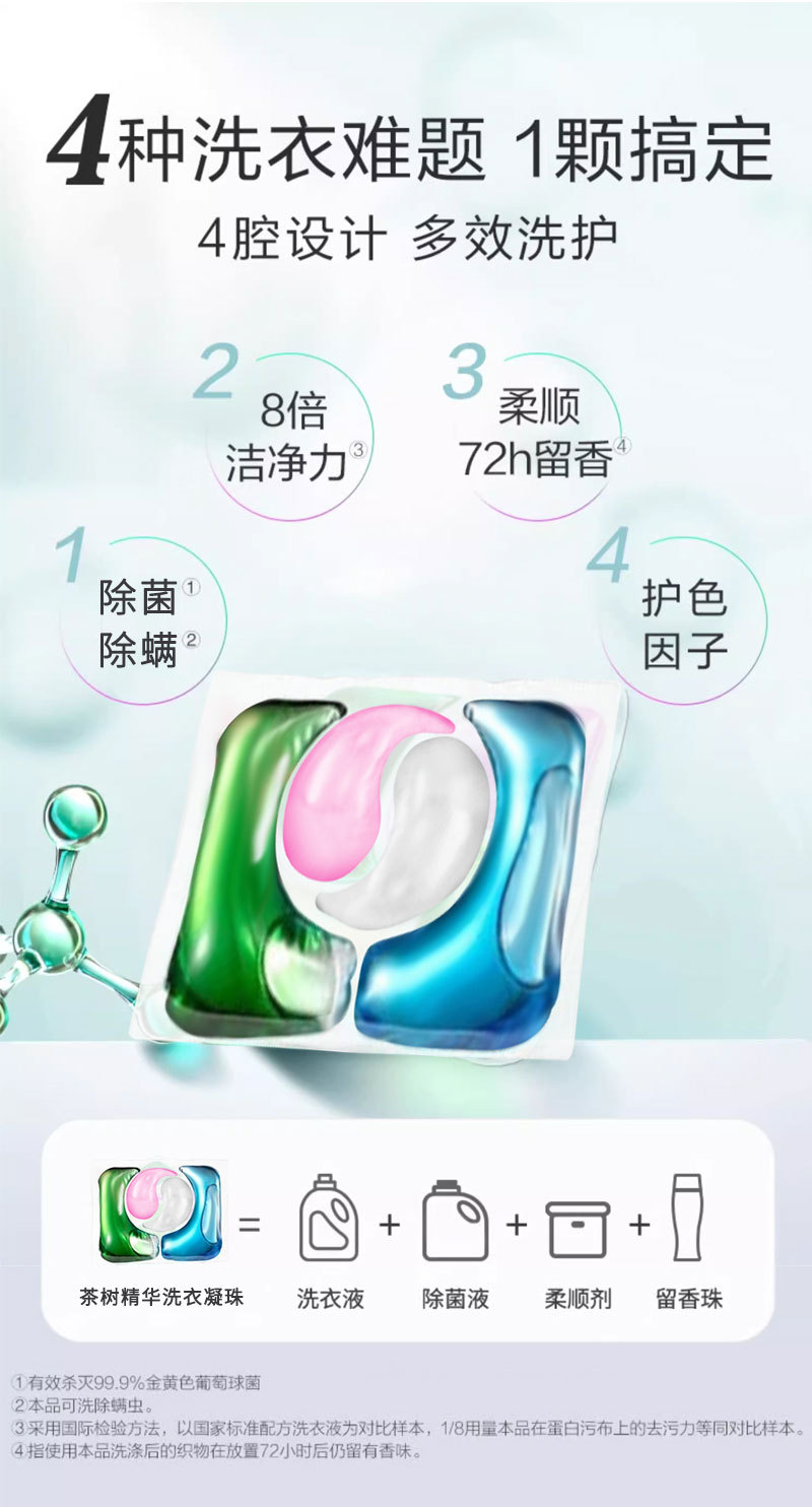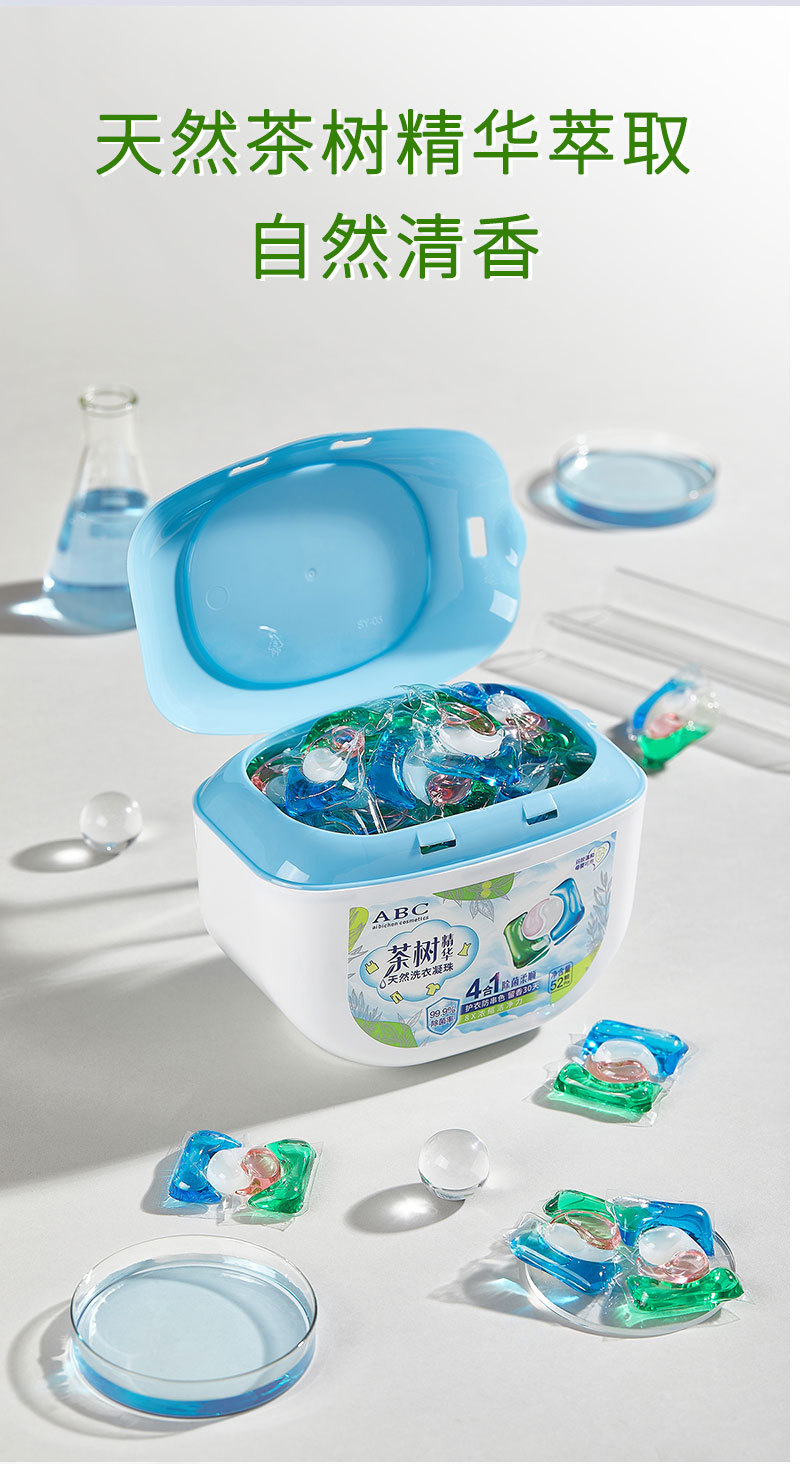 【AIBICHEN 茶树精华洗衣凝珠】4效合一 30S速溶 专业配方 快速分解去污渍 抑菌 除螨 柔顺 护色 柔软 持久留香