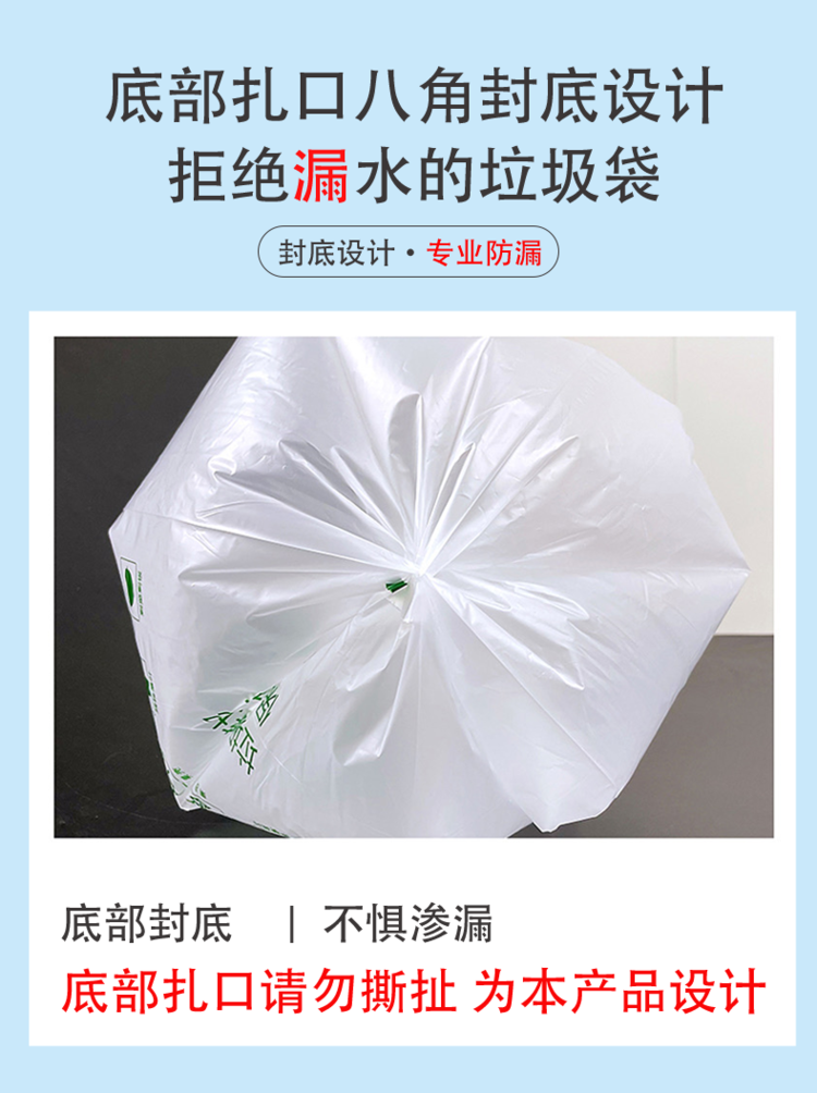 【详情】✅全新HDPE材质,韧性强不易破,无毒无臭,环保✅底部扎口八角封底设计, 拒绝漏水,耐烫不易破,厨房可用✅加厚加大款,15kg承重,容量20L,巨能装,比超市两元一个的还扎实!