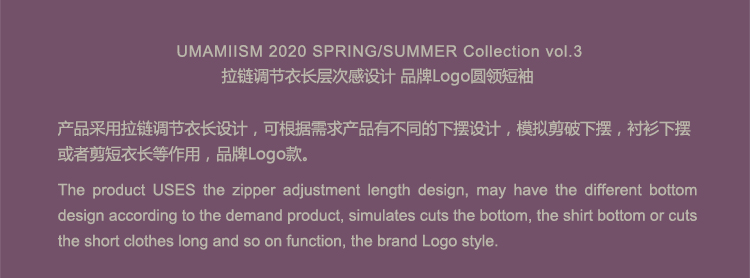 UMAMIISM 20SS 拉链调节衣长层次感设计品牌LOGO宽松休闲圆领短袖