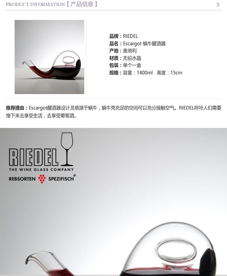 【样品清仓特惠5折,仅1件,无货退款】奥地利进口Riedel escargot蜗牛醒酒器水晶玻璃红酒醒分酒酒器