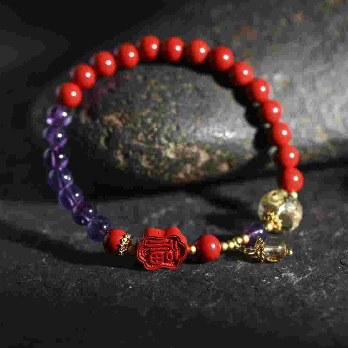 | 配件 | 紫水晶,黄水晶算盘切面珠,素银花托,古法金色铜珠,黄水晶,沙金链,沙金针圆头,朱砂双面福字 |