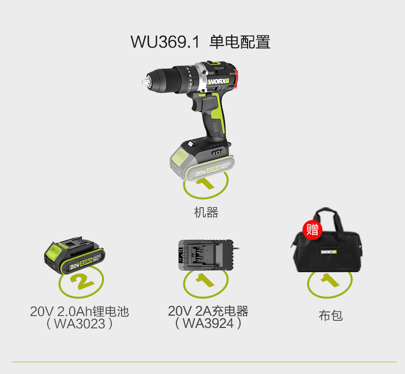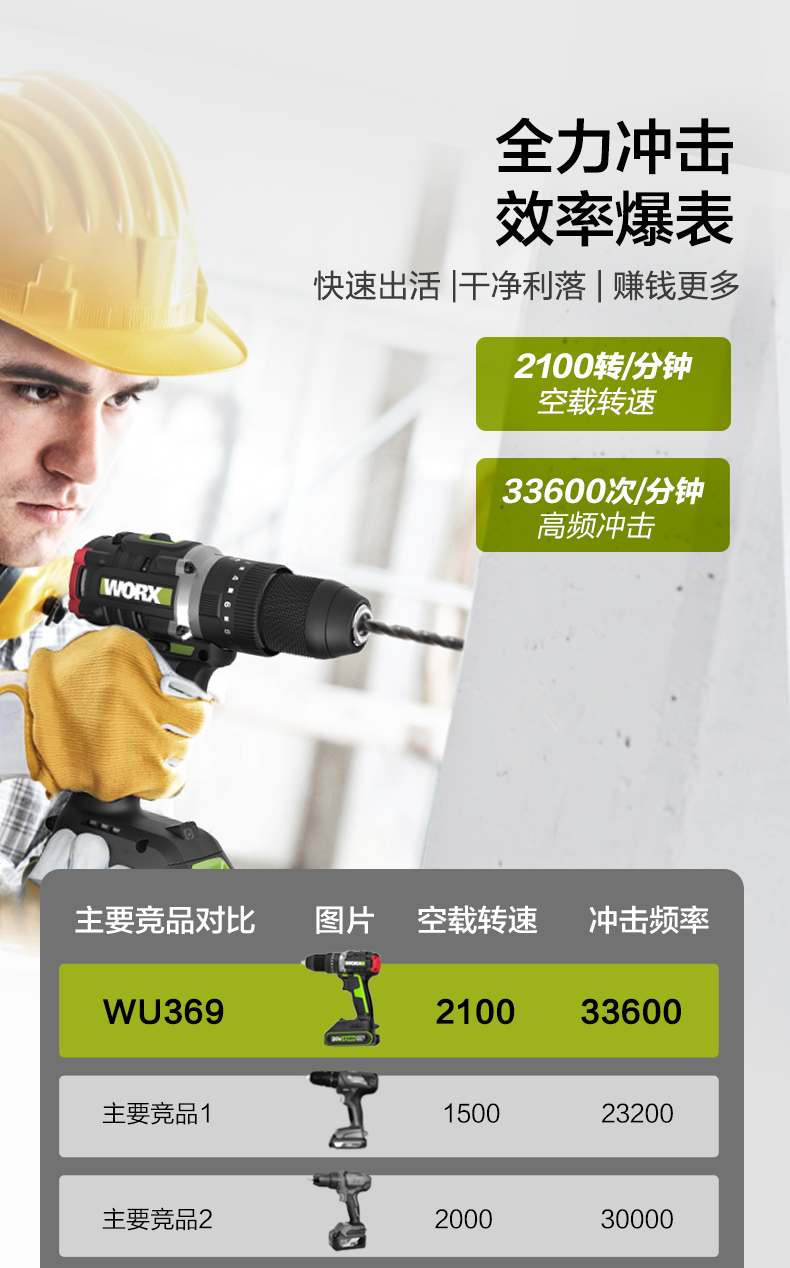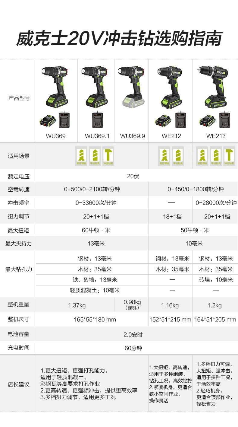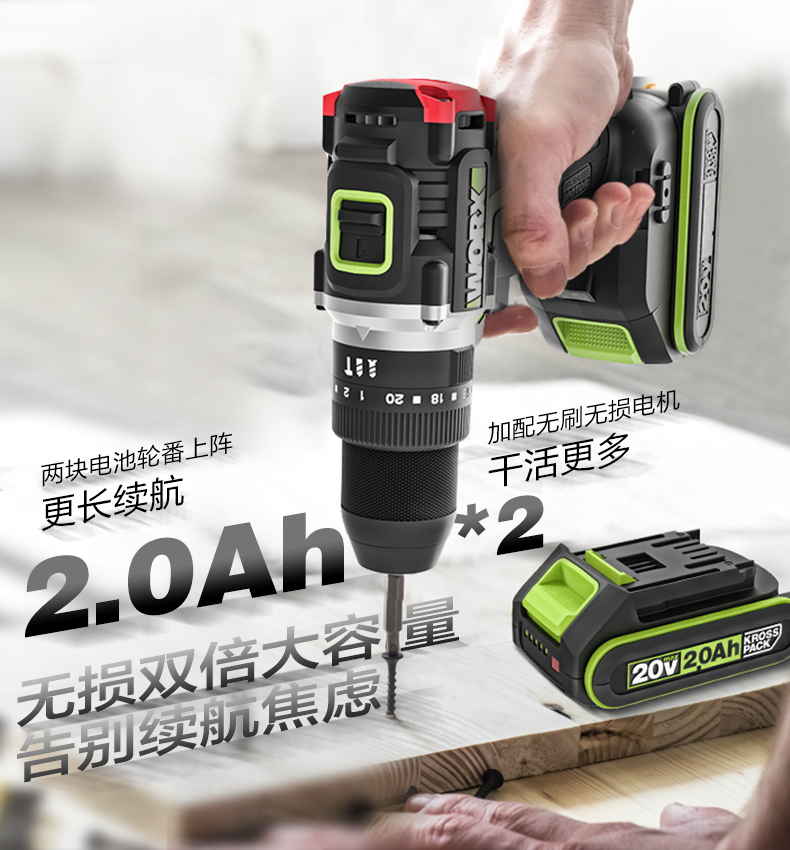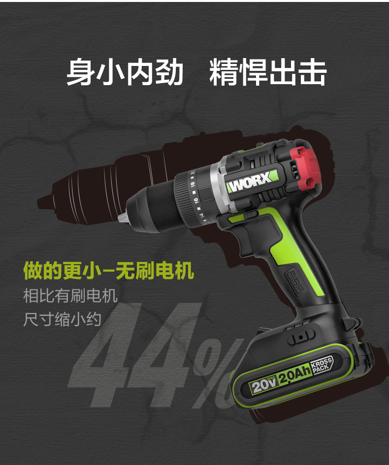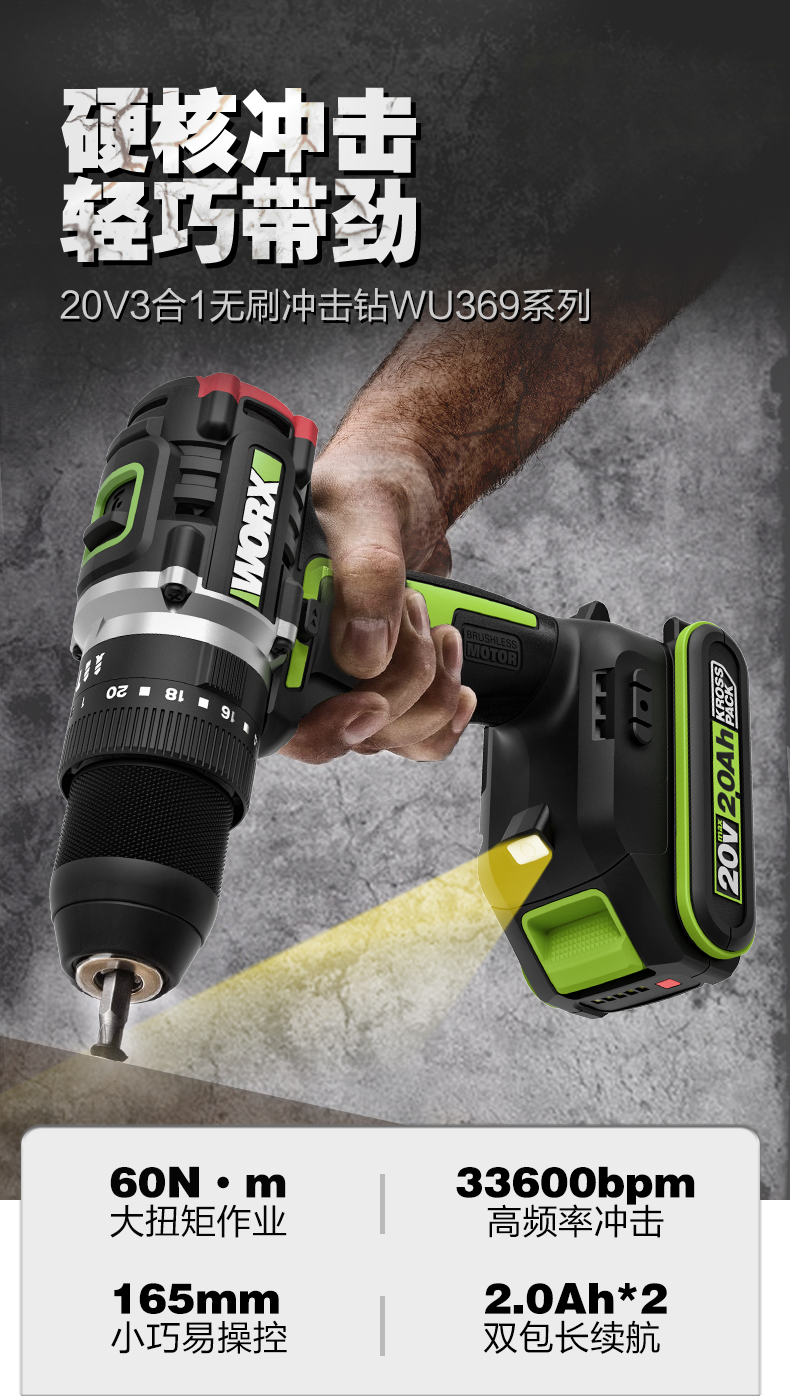 威克士WU369 20V无刷锂电冲击钻小型充电式手电钻大功率电动工具