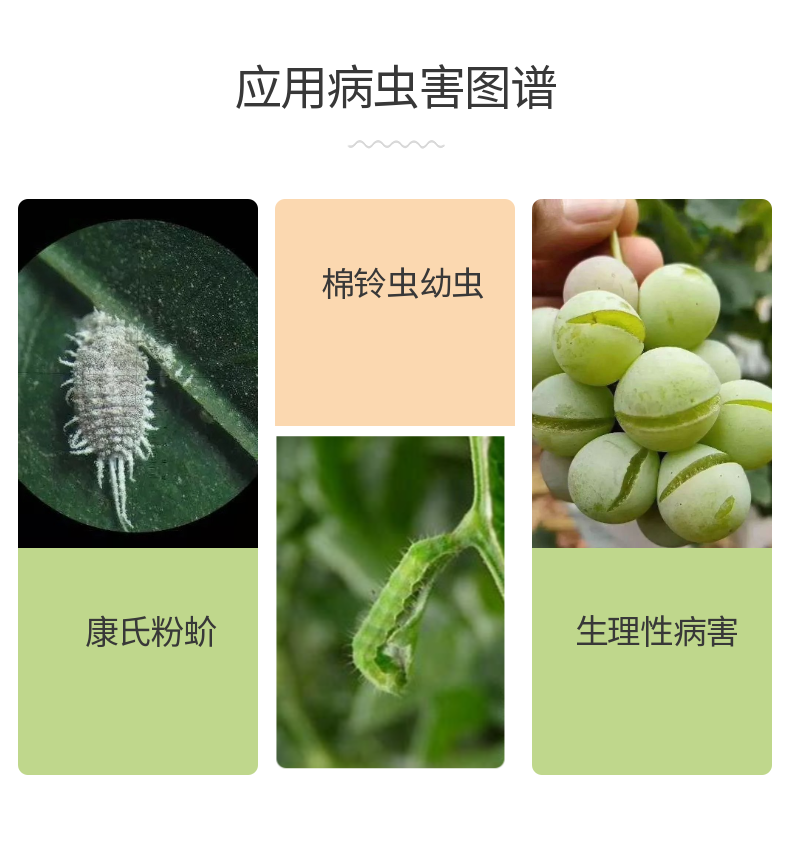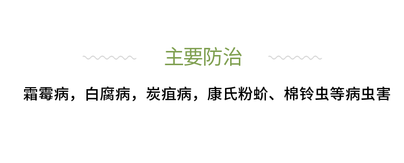 3.方案作用:主要防治霜霉病,白腐病,炭疽病,康氏粉蚧,棉铃虫等病虫病。
