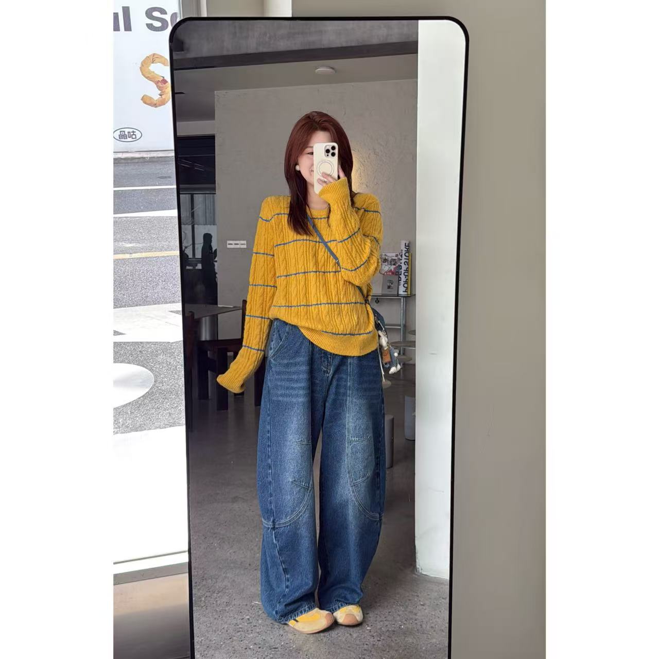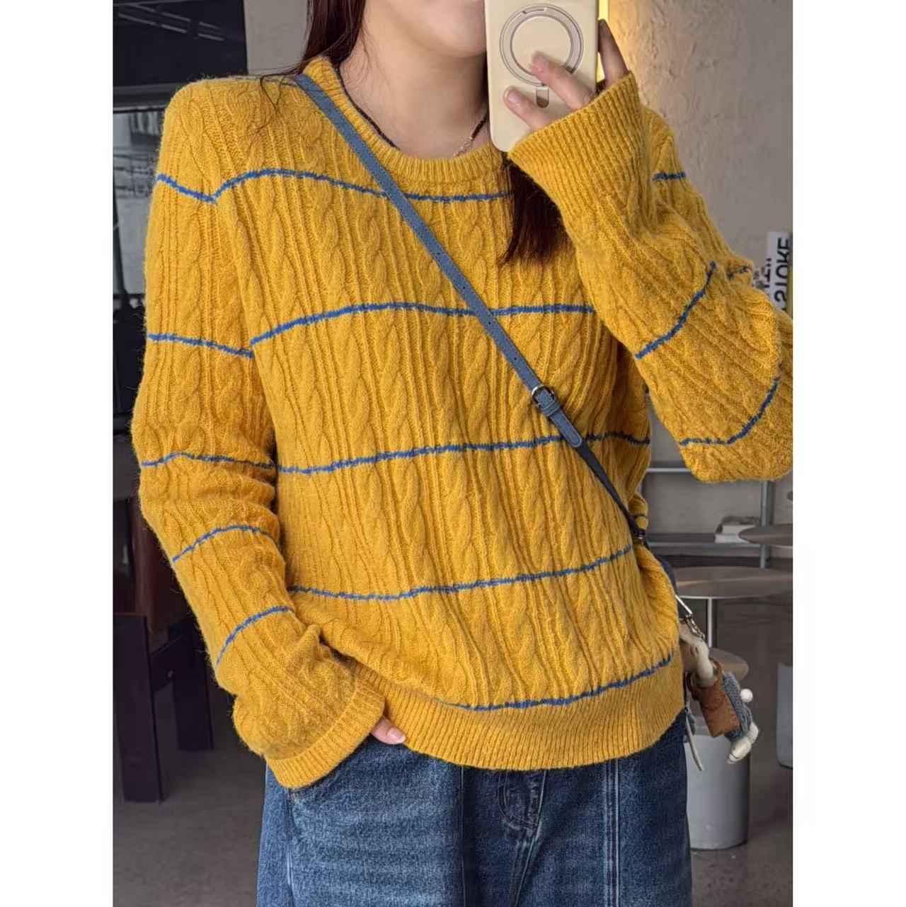 25AW上新 佳佳同款【芒果圈】圆领麻花纹路横线感套头毛衣长袖百搭慵懒撞色