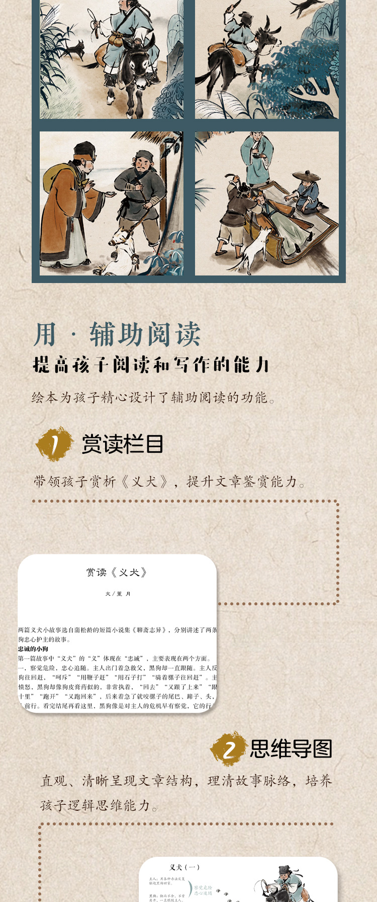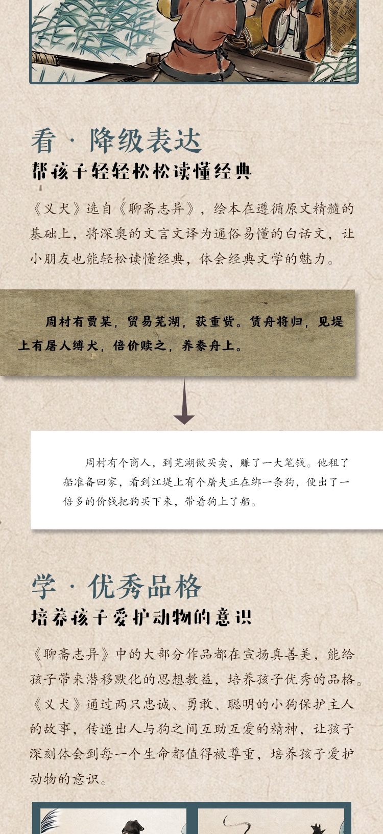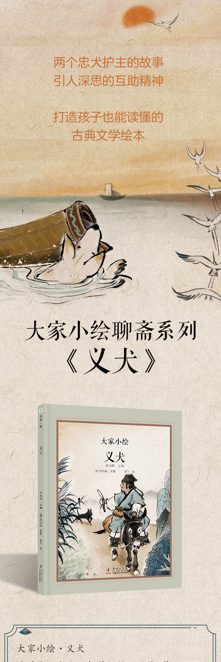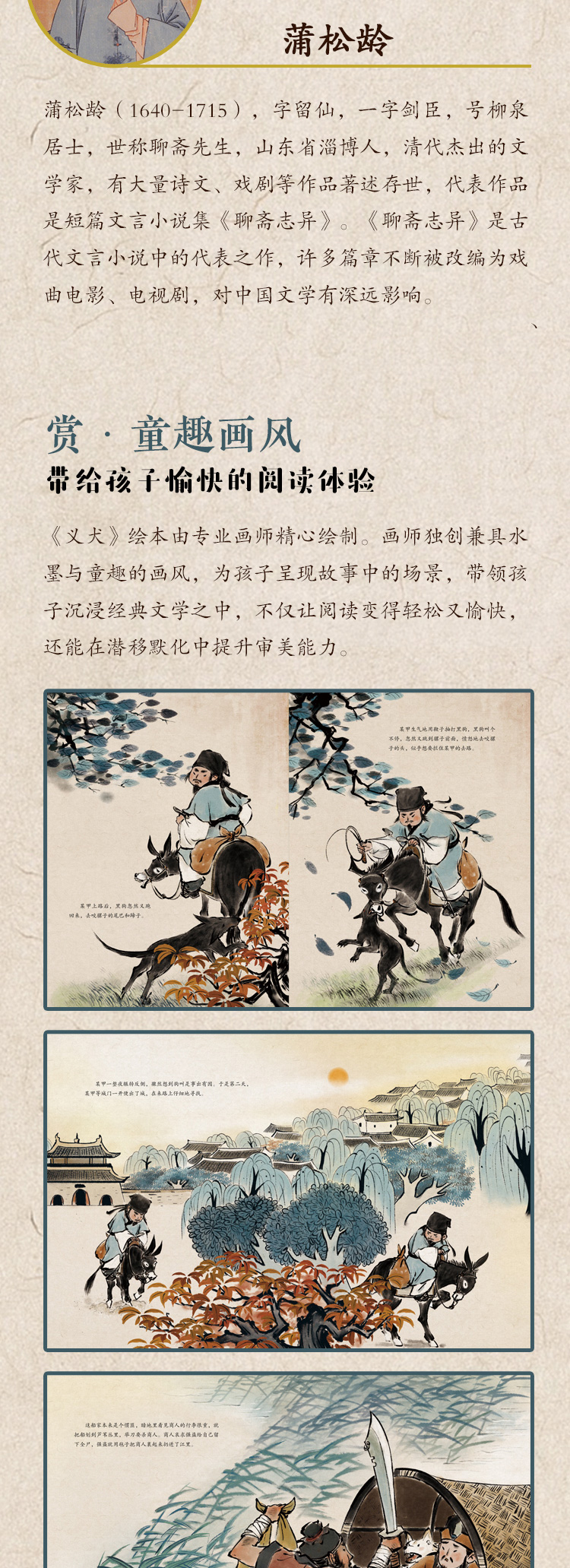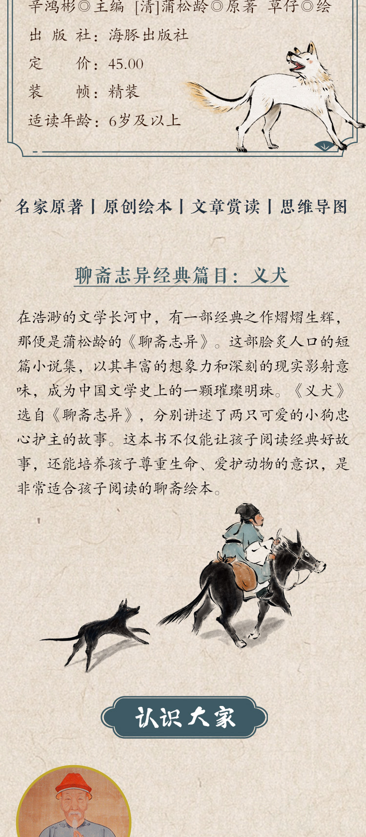在浩渺的文学长河中,有一部经典之作熠熠生辉,那便是蒲松龄的《聊斋志异》。这部脍炙人口的短篇小说集,以其丰富的想象力和深刻的现实影射意味,成为中国文学史上的一颗璀璨明珠。《义犬》选自《聊斋志异》,分别讲述了两只可爱的小狗忠心护主的故事。这本书不仅能让孩子阅读经典好故事,还能培养孩子尊重生命、爱护动物的意识,是非常适合孩子阅读的聊斋绘本。