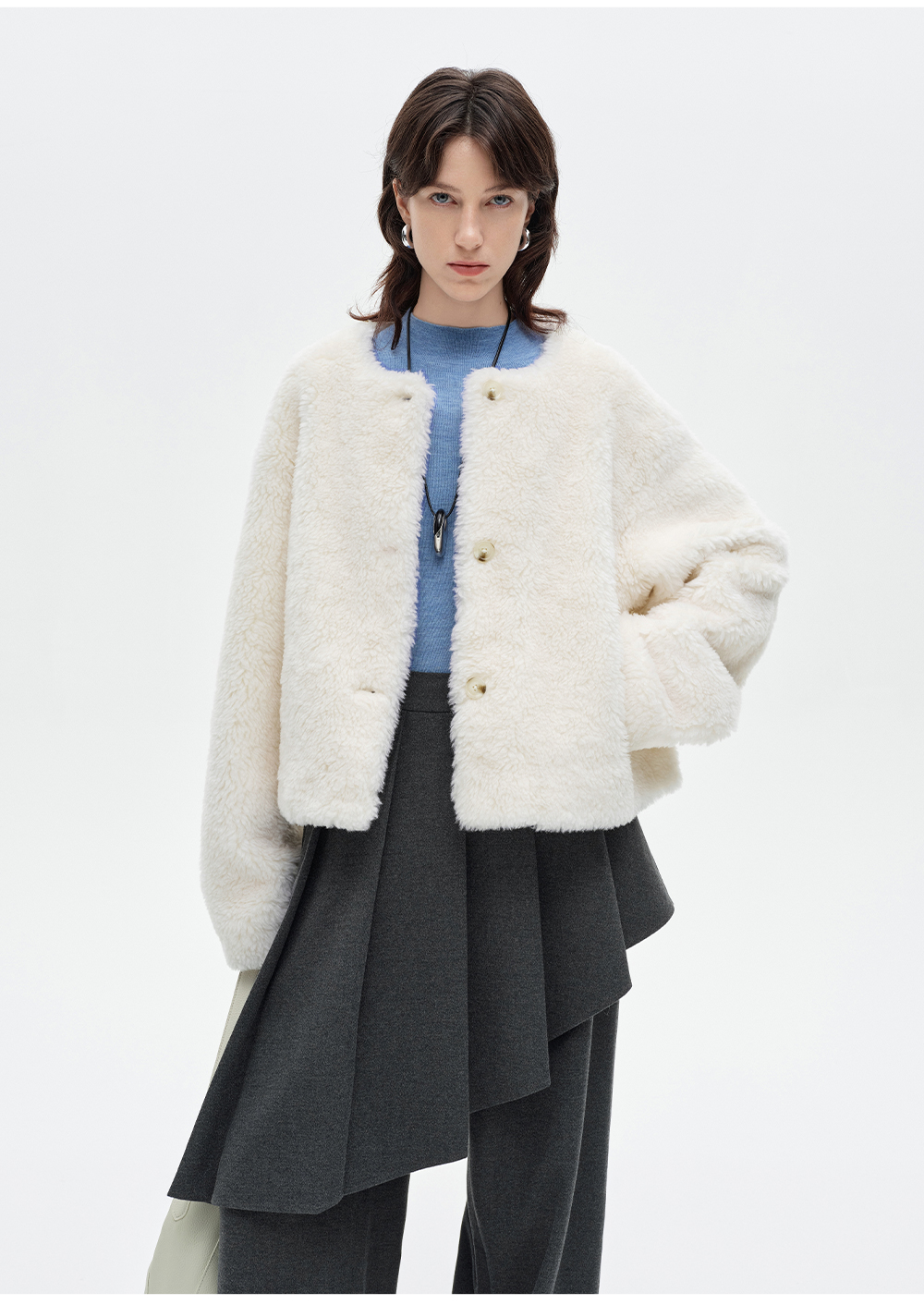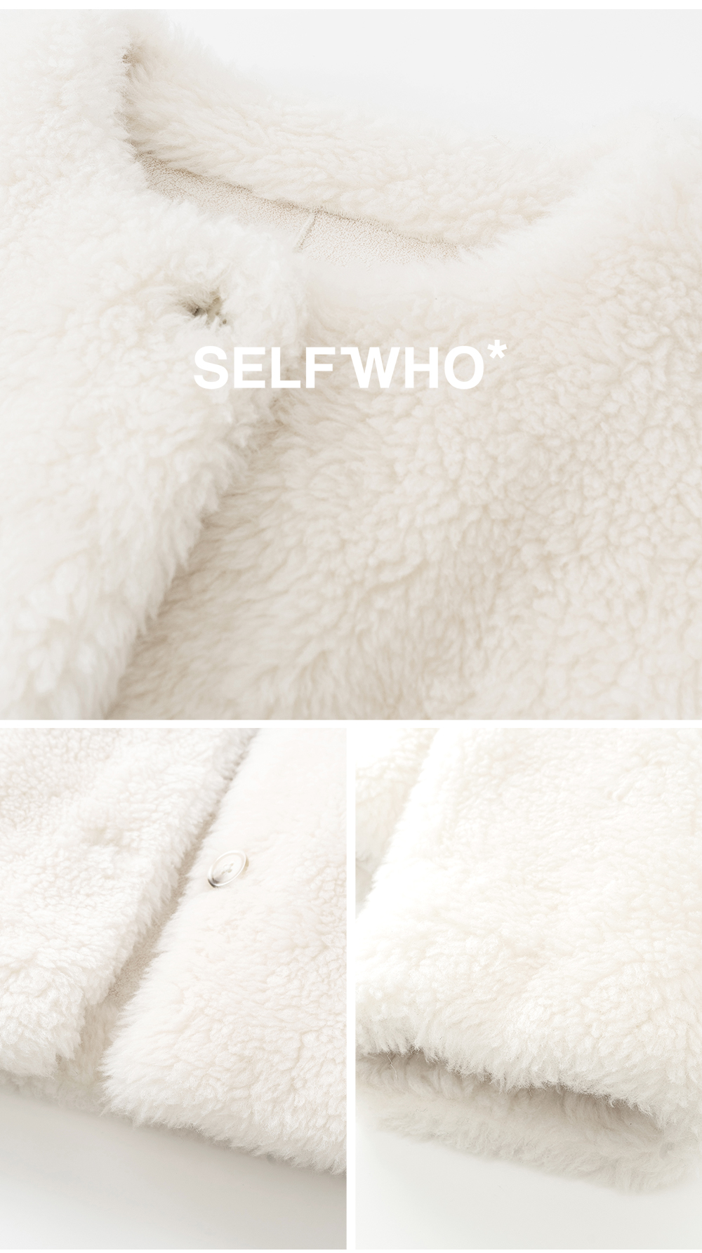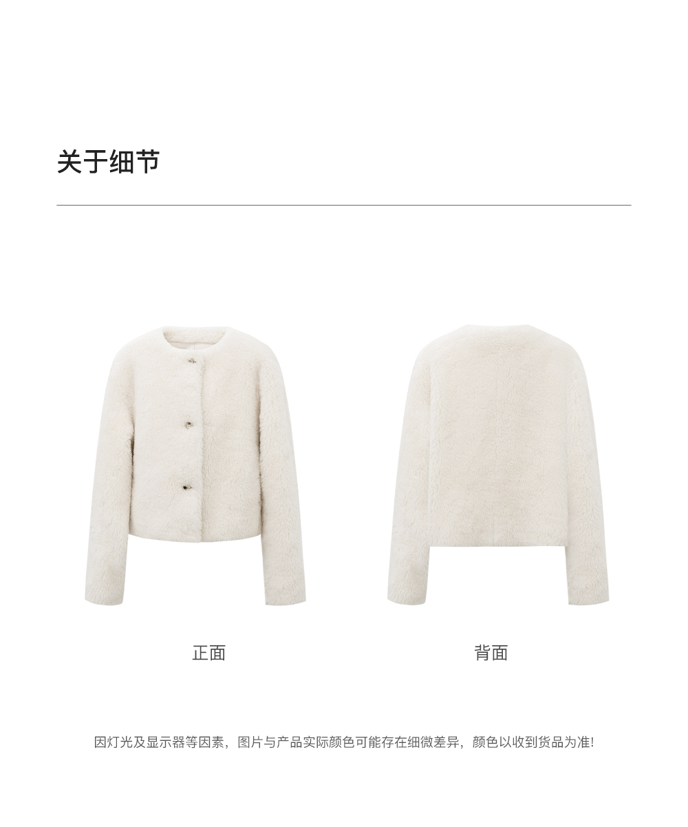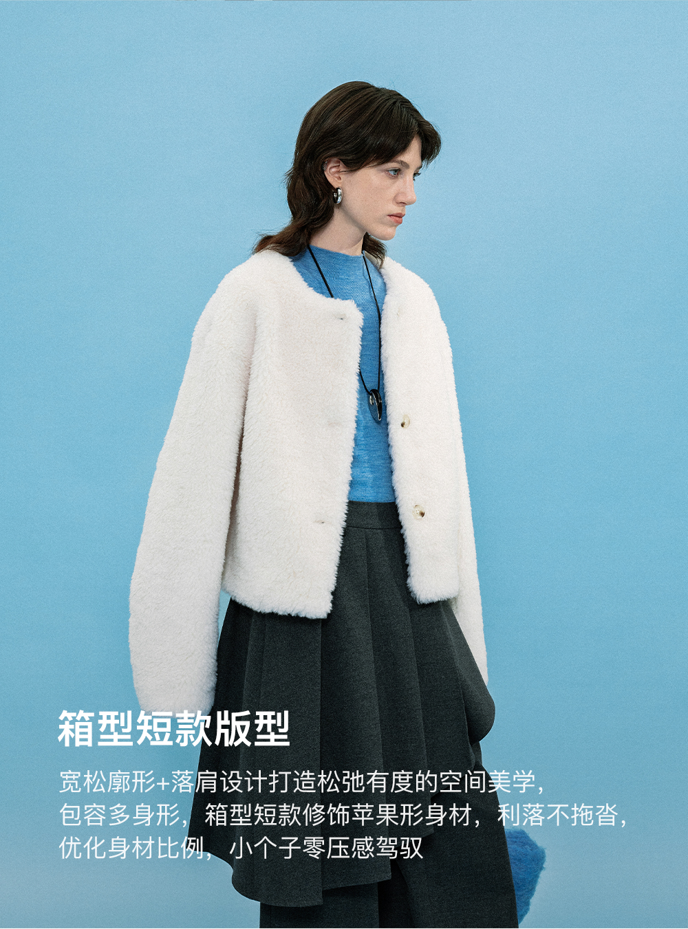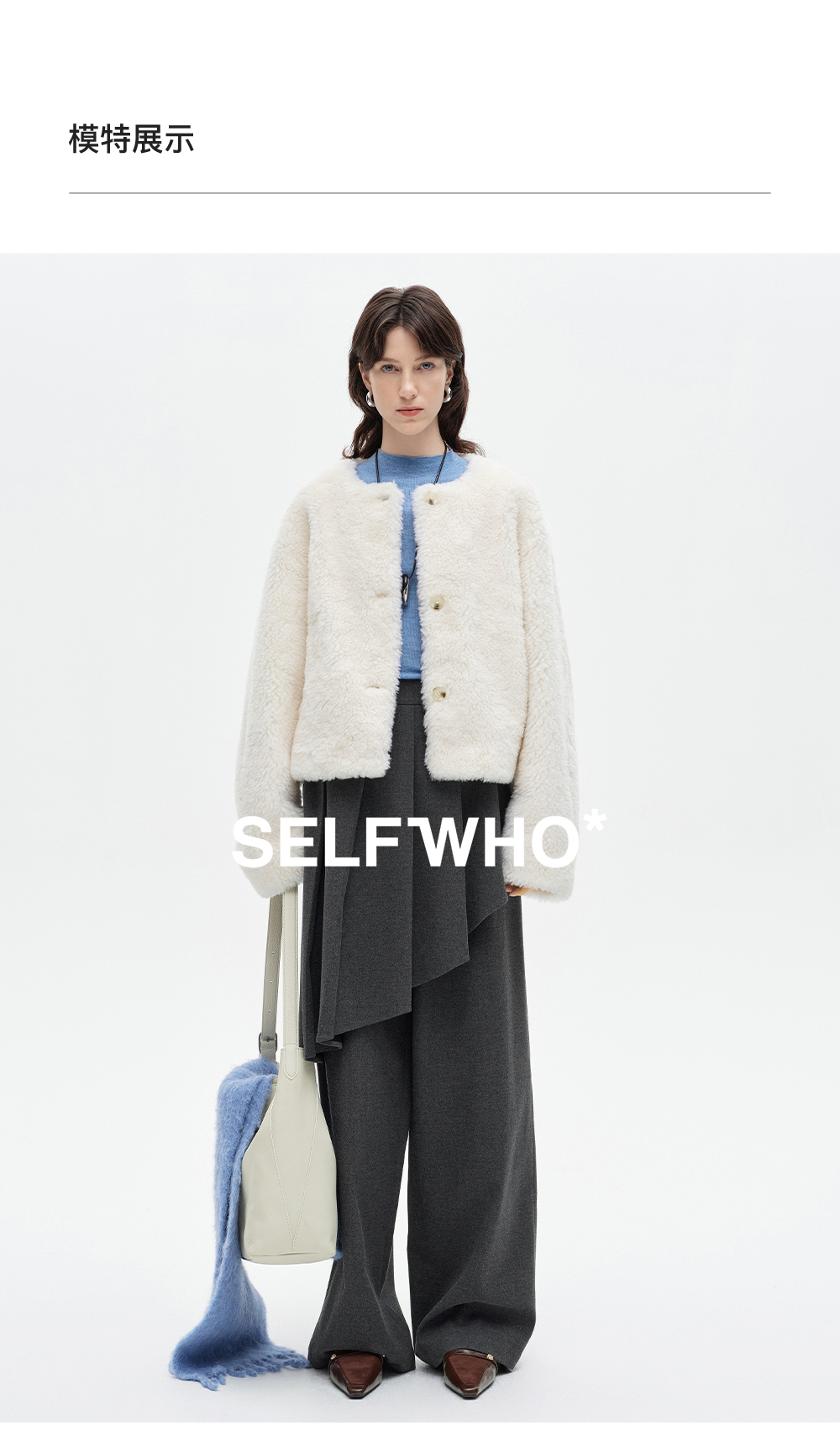 SELFWHO绵羊毛混纺白色皮草外套女2025冬季新款圆领箱型短款上衣