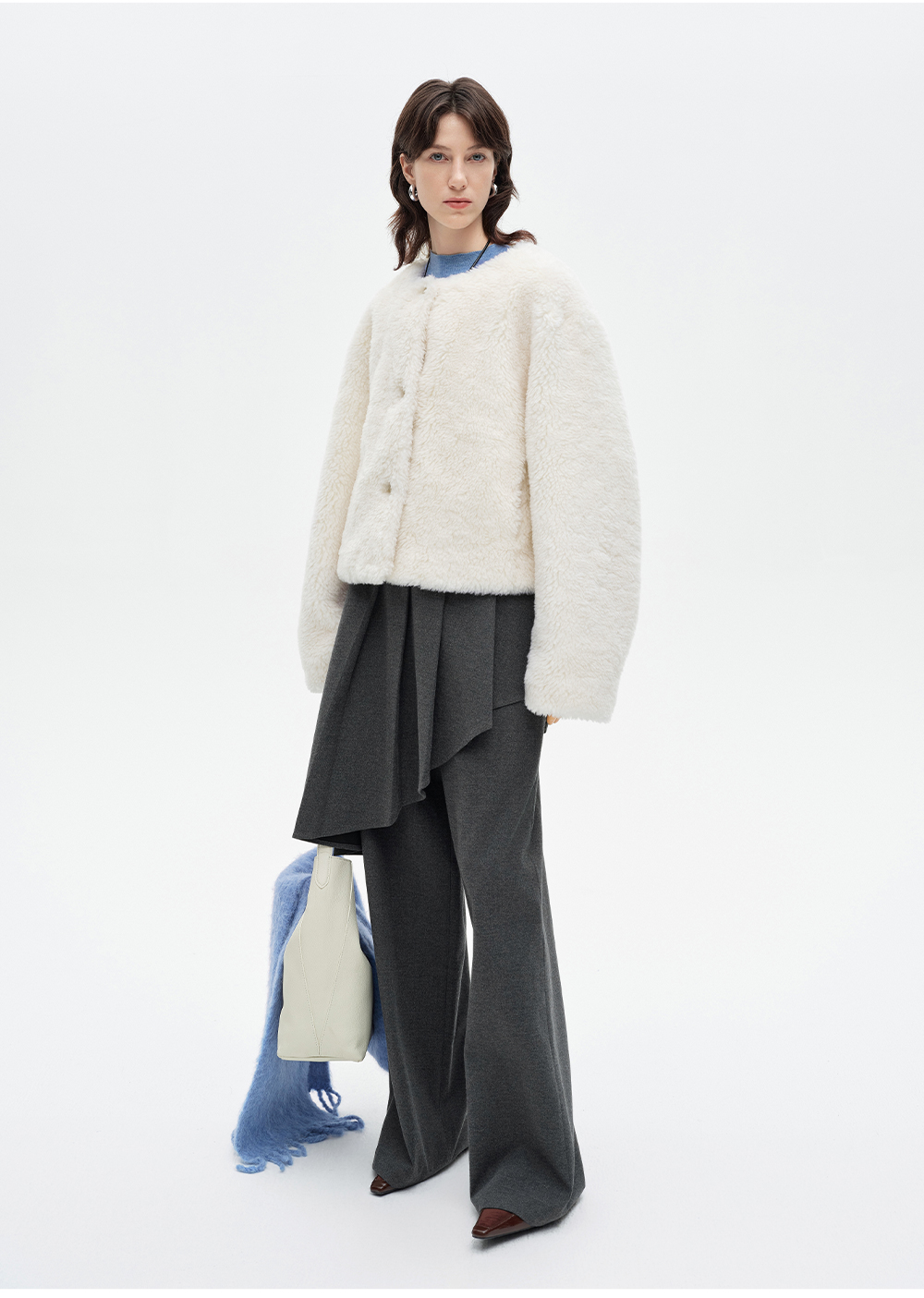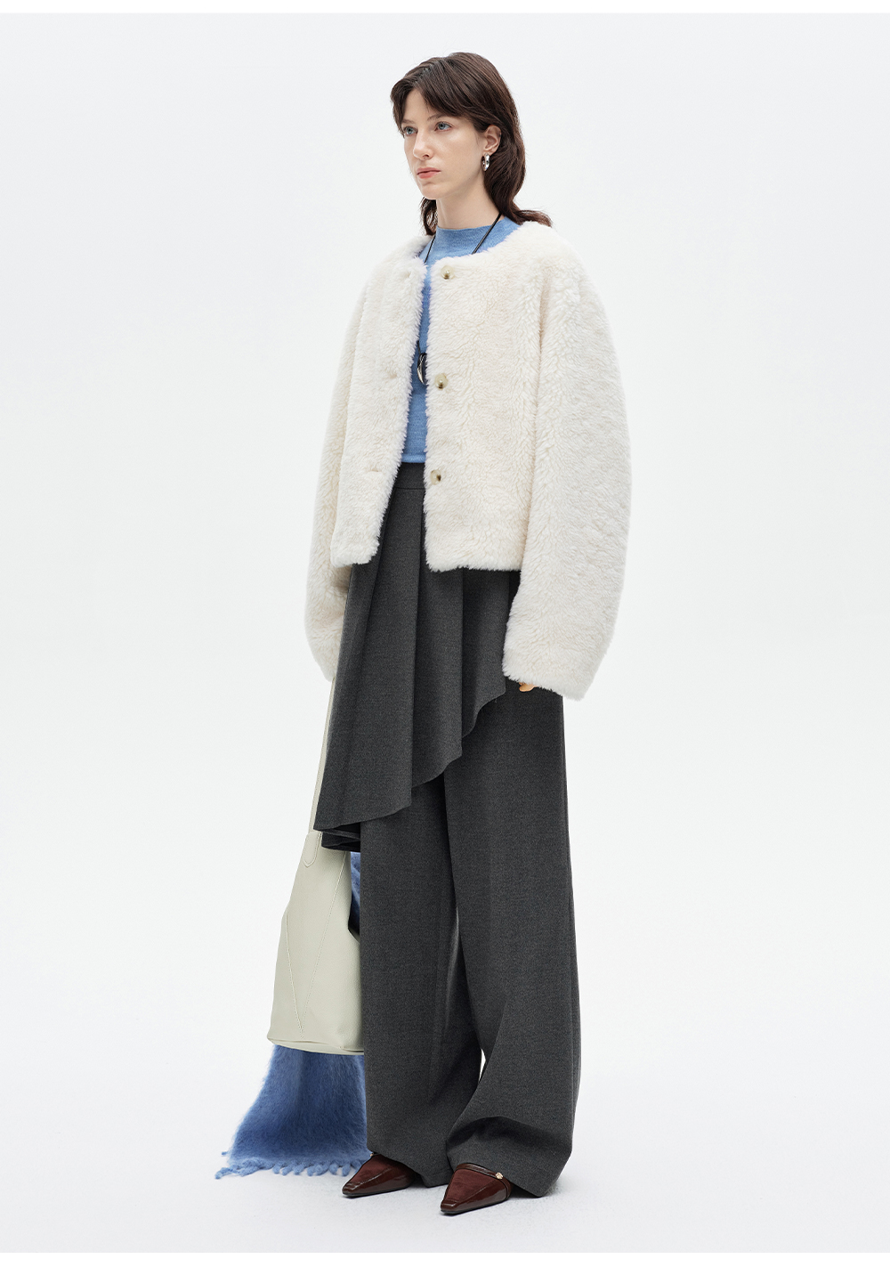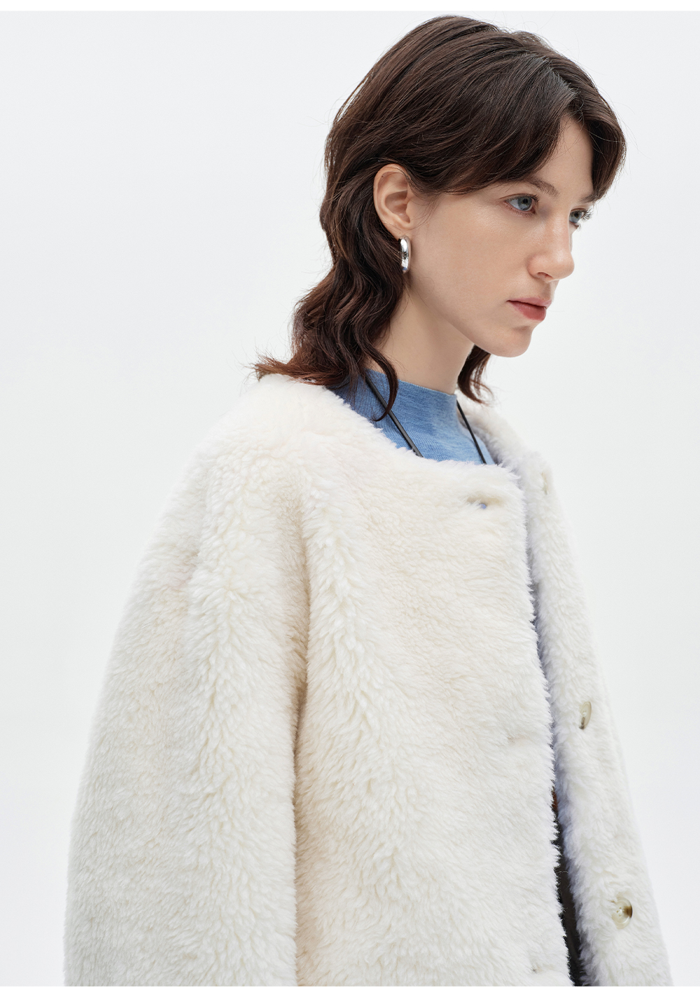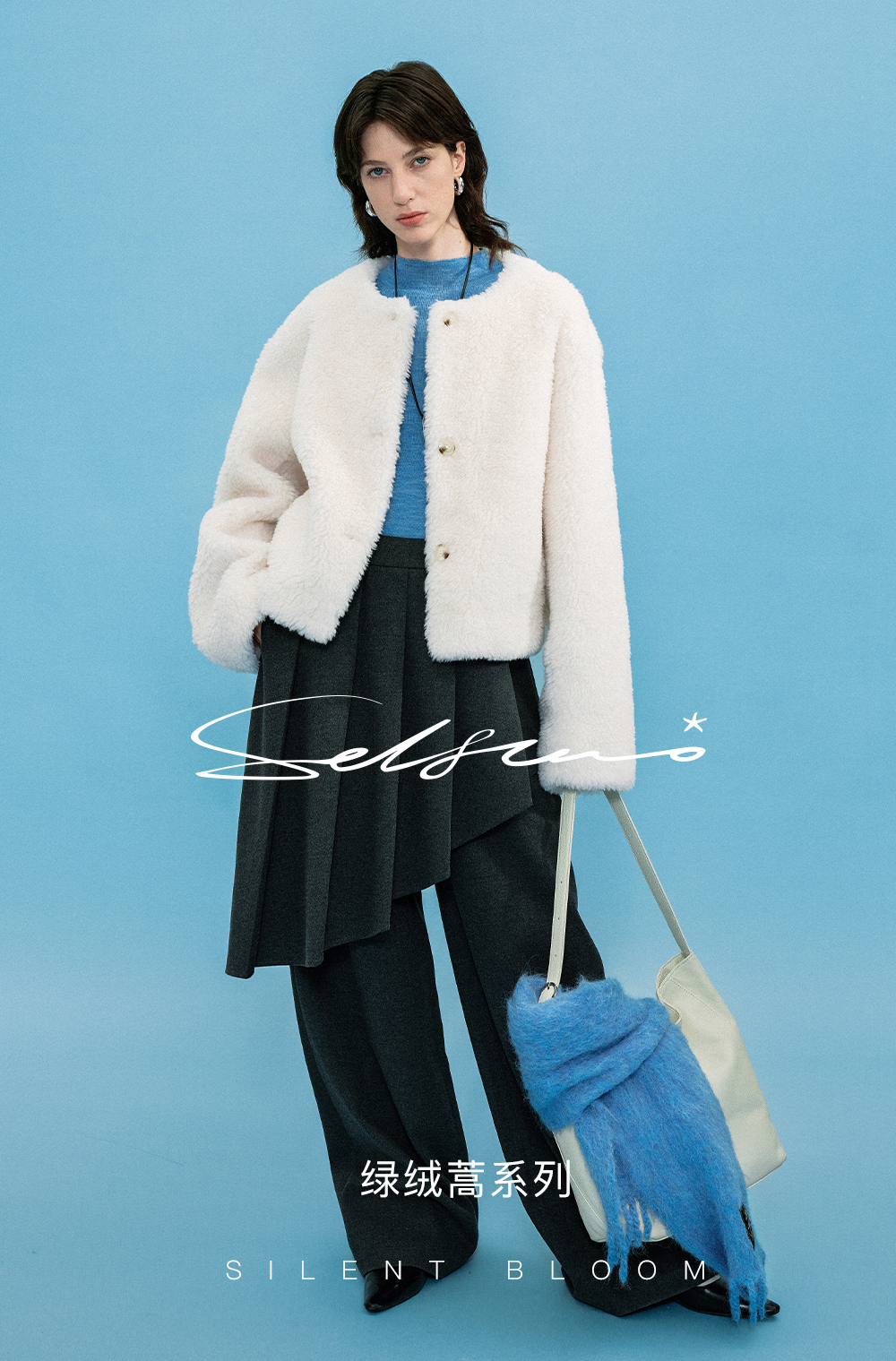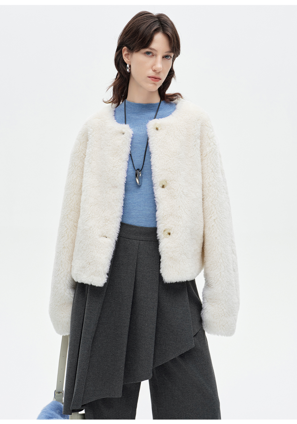 SELFWHO绵羊毛混纺白色皮草外套女2025冬季新款圆领箱型短款上衣