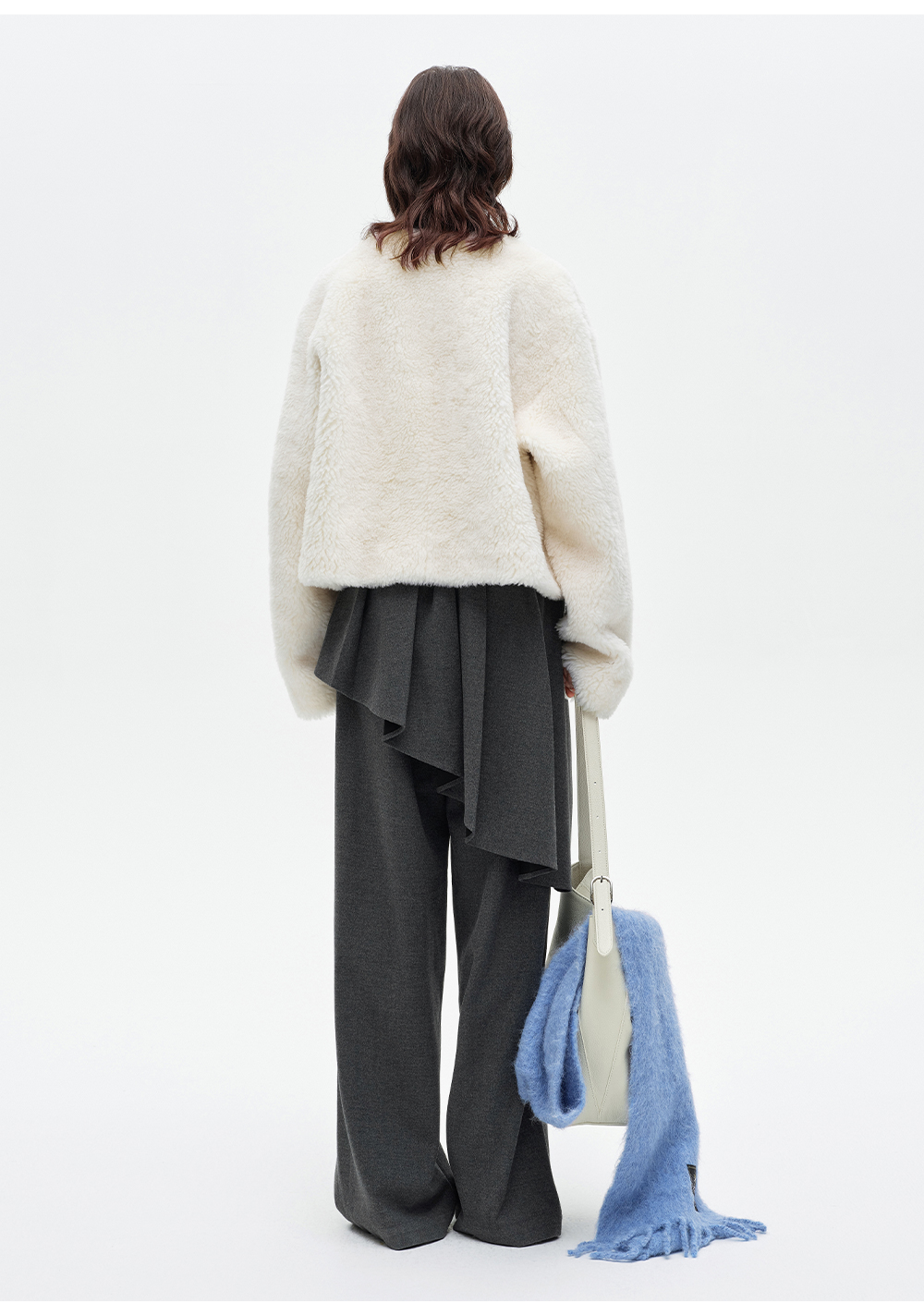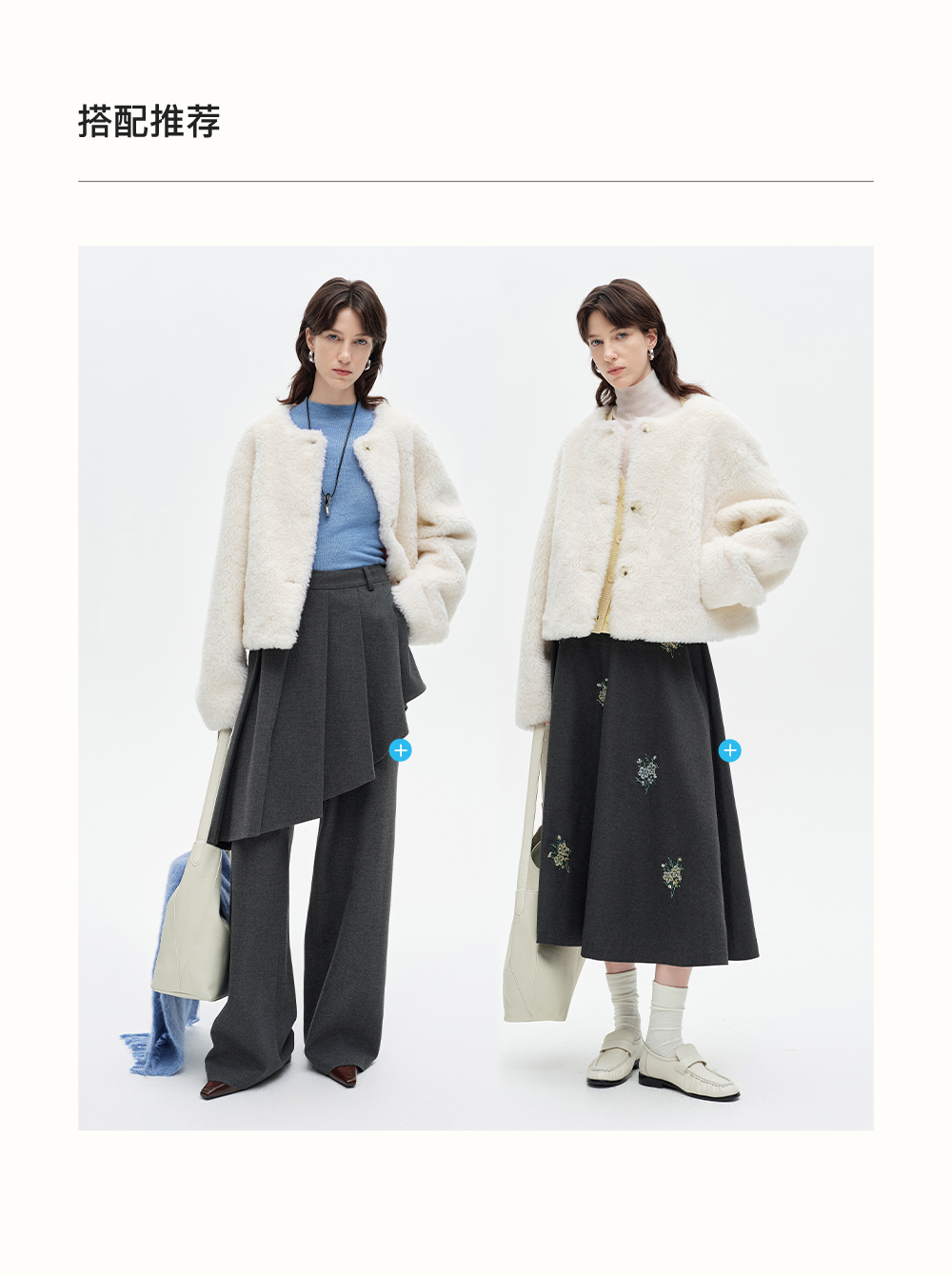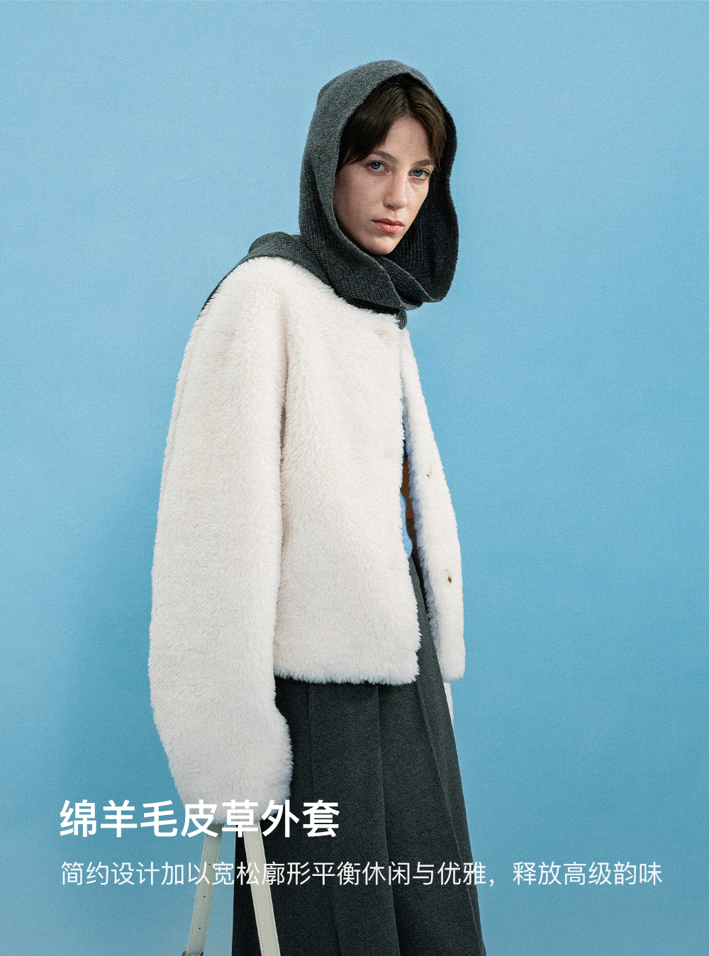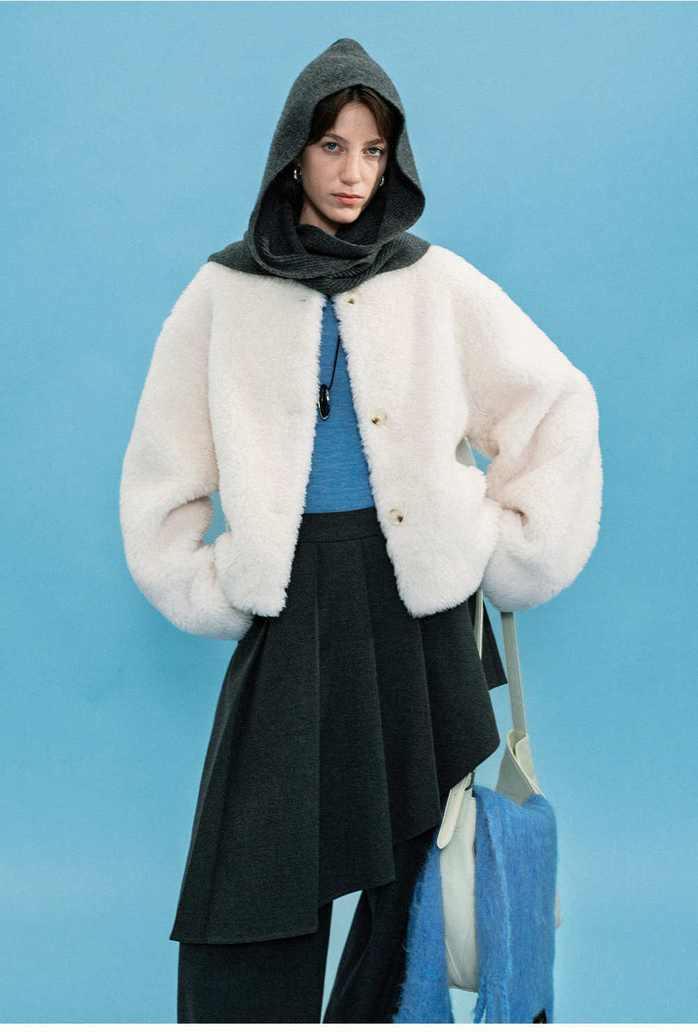 SELFWHO绵羊毛混纺白色皮草外套女2025冬季新款圆领箱型短款上衣