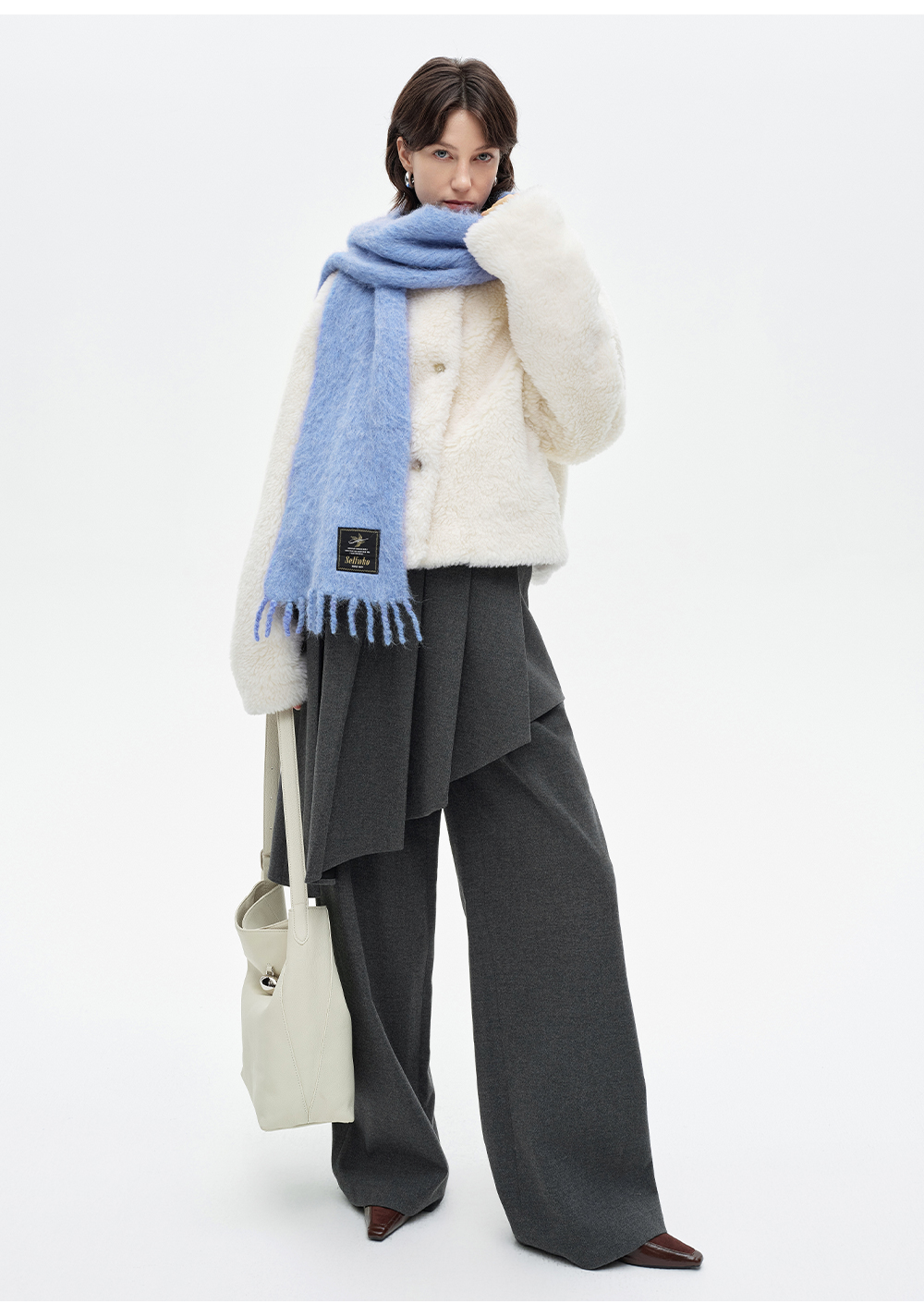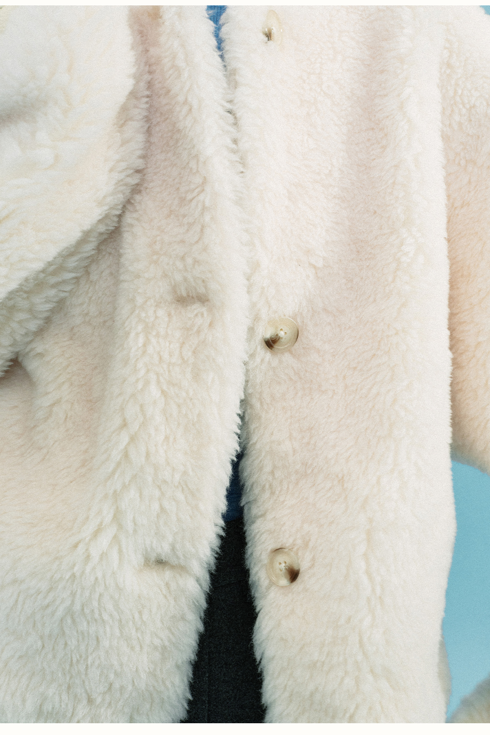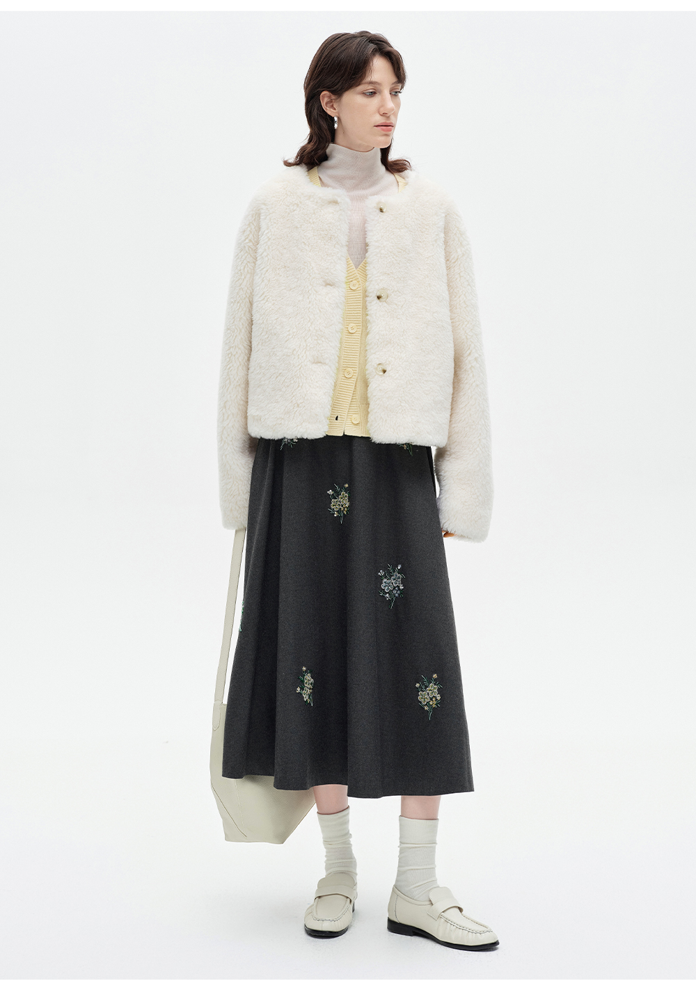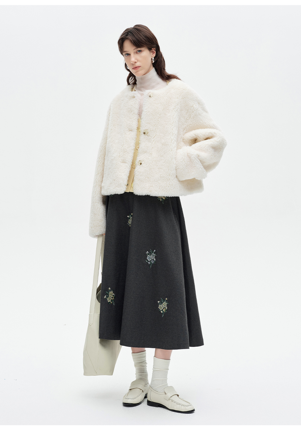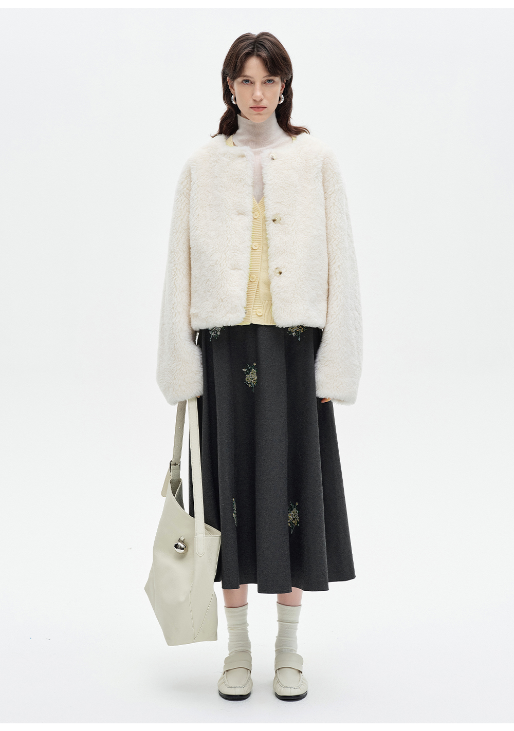 SELFWHO绵羊毛混纺白色皮草外套女2025冬季新款圆领箱型短款上衣