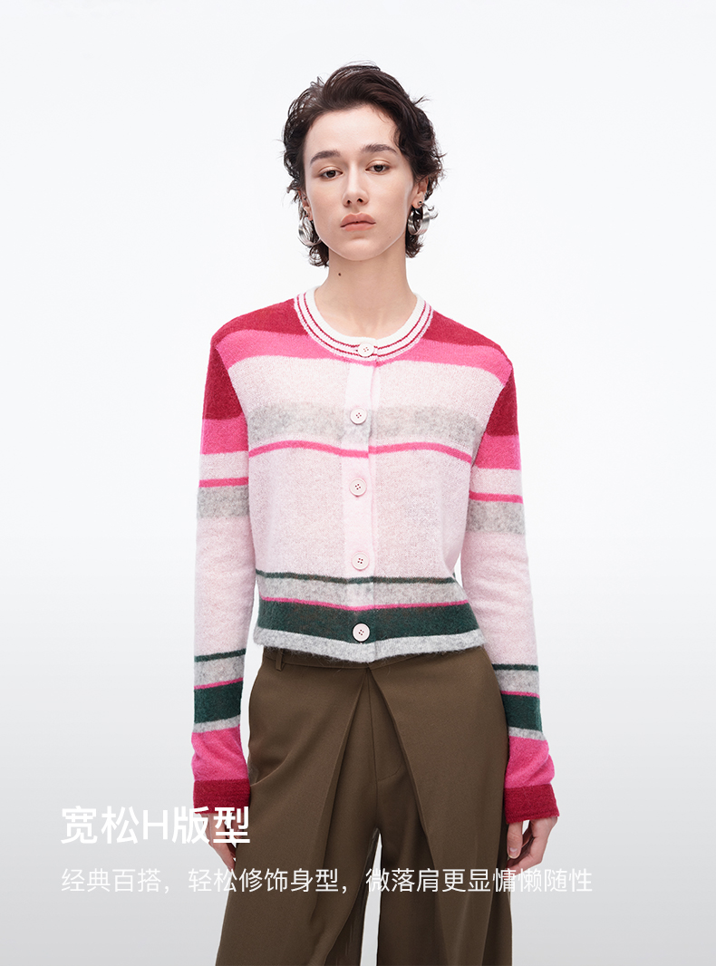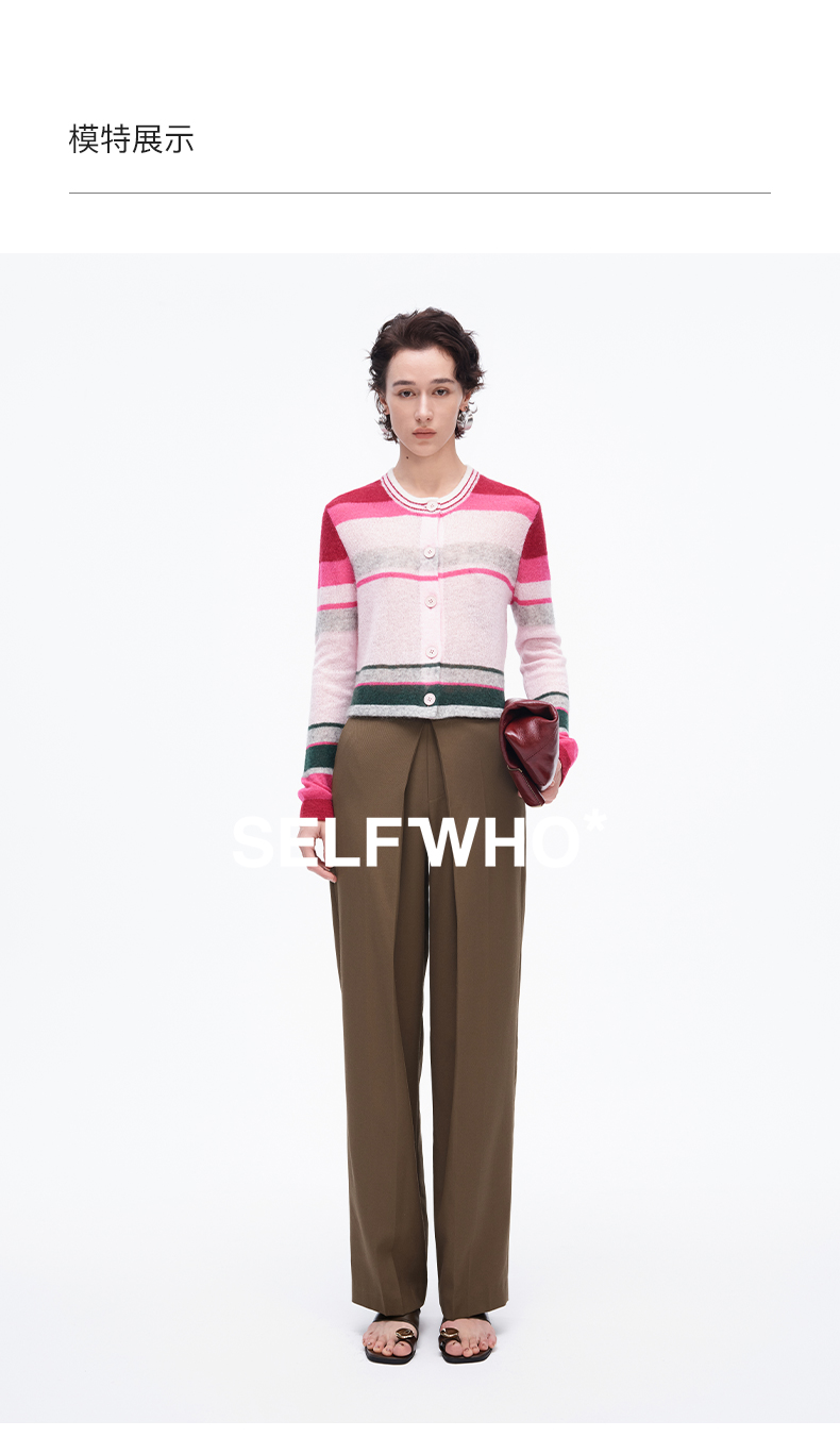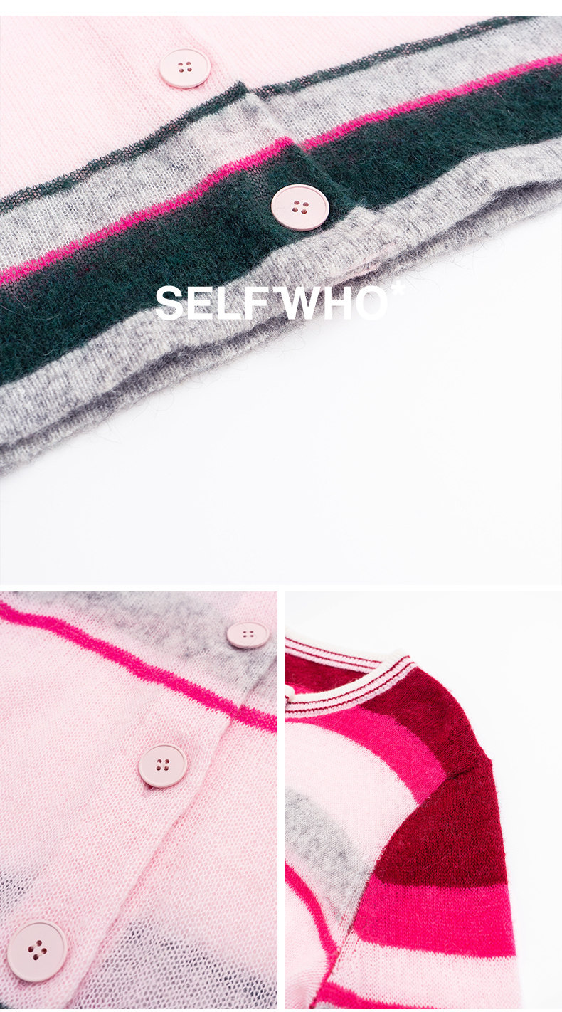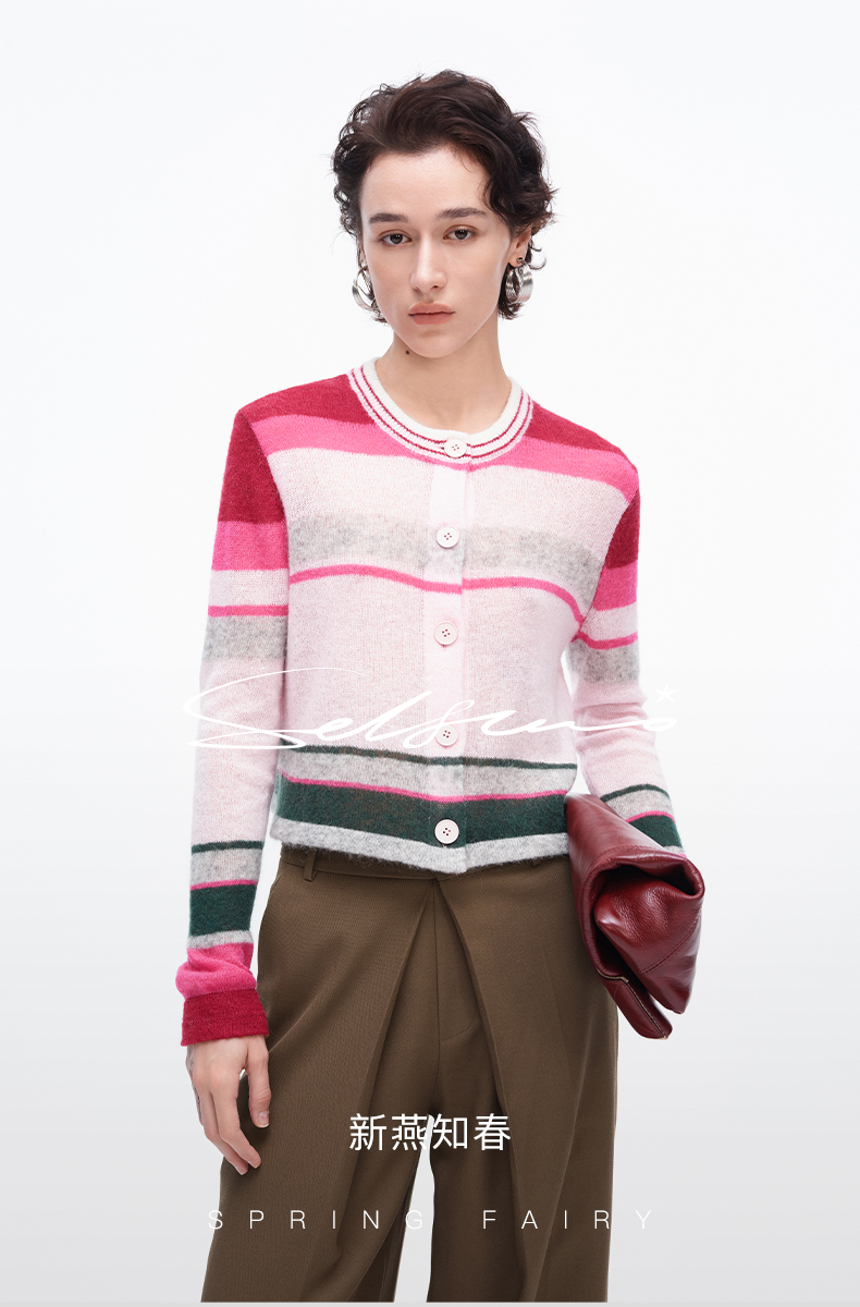 SELFWHO羊毛混纺新年红色条纹针织衫女2025春季新款圆领开衫上衣