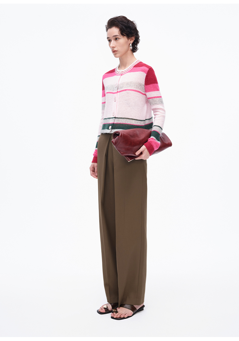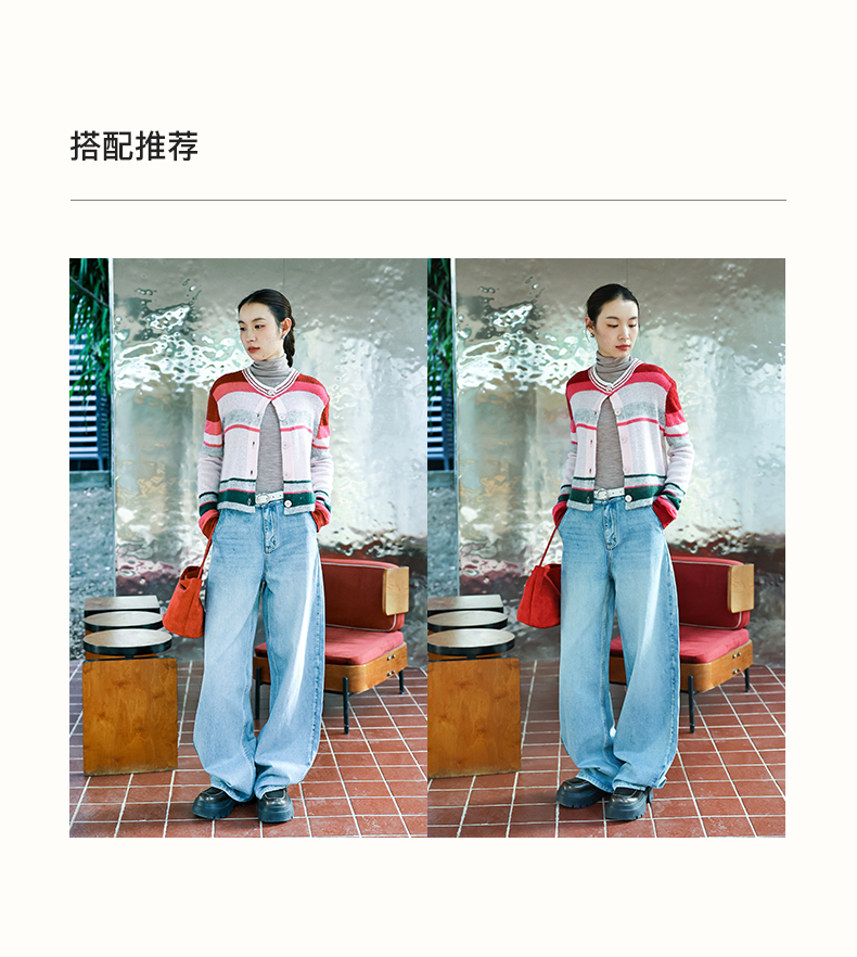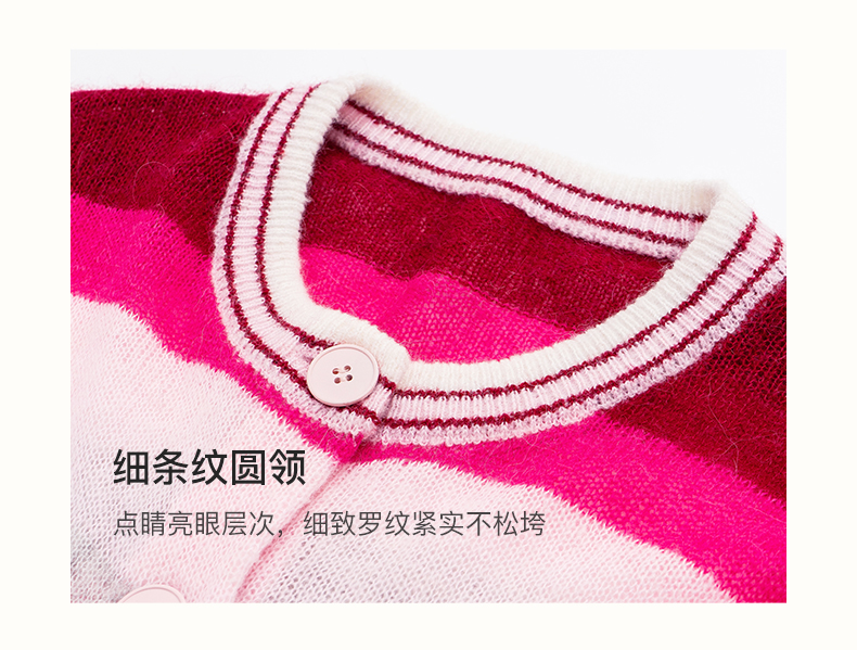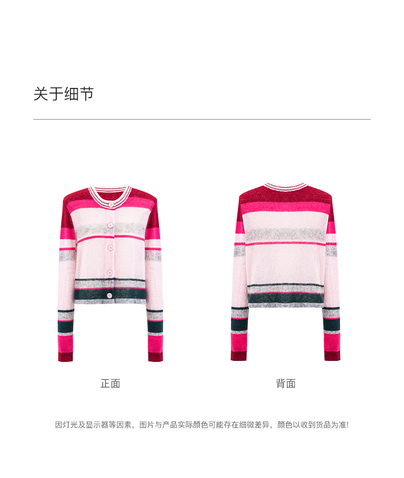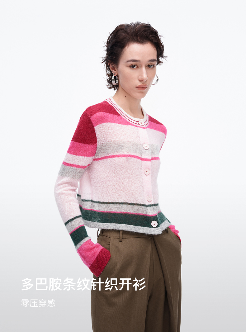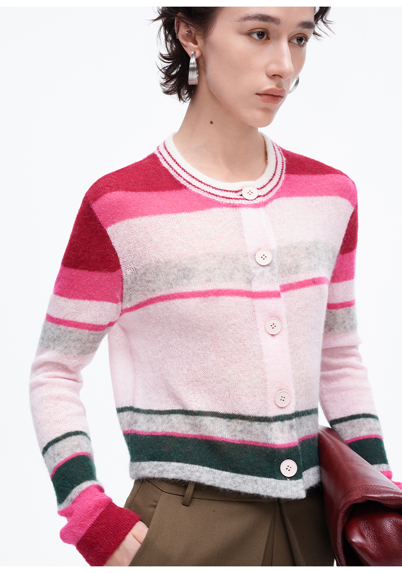 SELFWHO羊毛混纺新年红色条纹针织衫女2025春季新款圆领开衫上衣