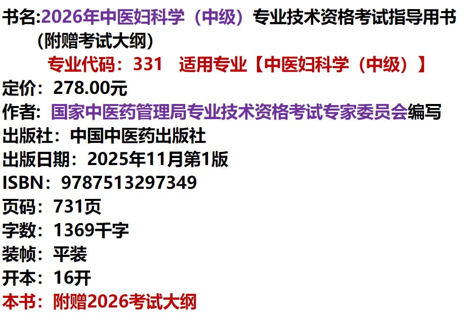 2026年中医妇科学(中级)专业技术资格考试指导用书 专业代码331 国家中医药管理局专业技术资格考试专家委员会 中国中医药出版社