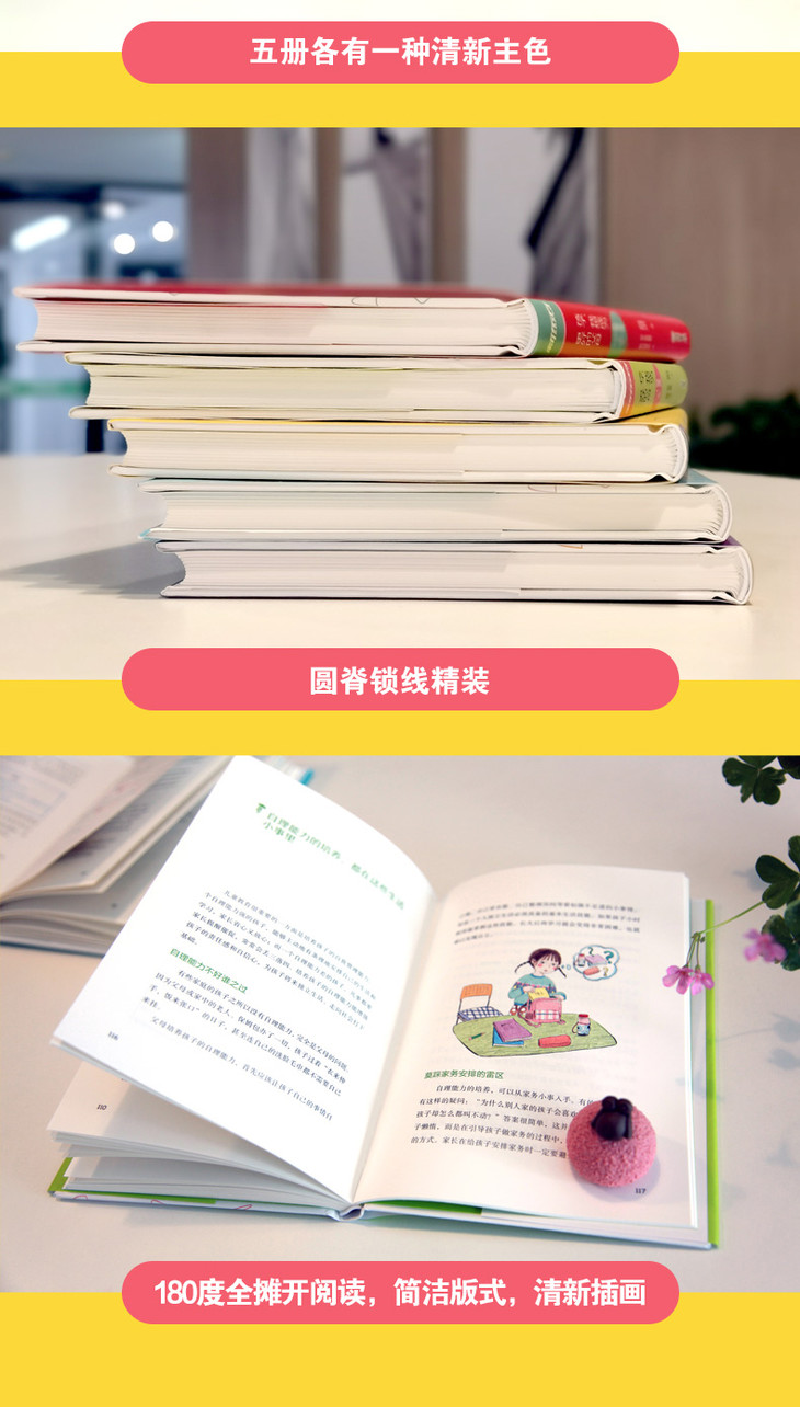 7.装帧设计之美与思想内容完美融合。圆脊锁线精装,180度全摊开阅读,纸张颜色柔和,五册图书各有一种清新主色,配温馨彩色插画,让阅读轻松愉悦。