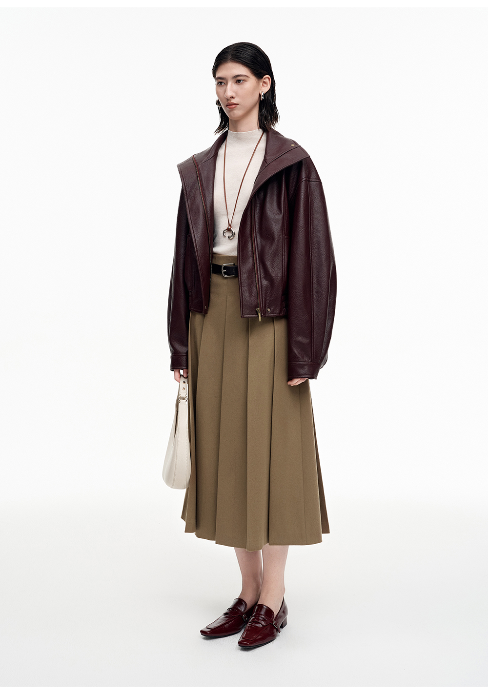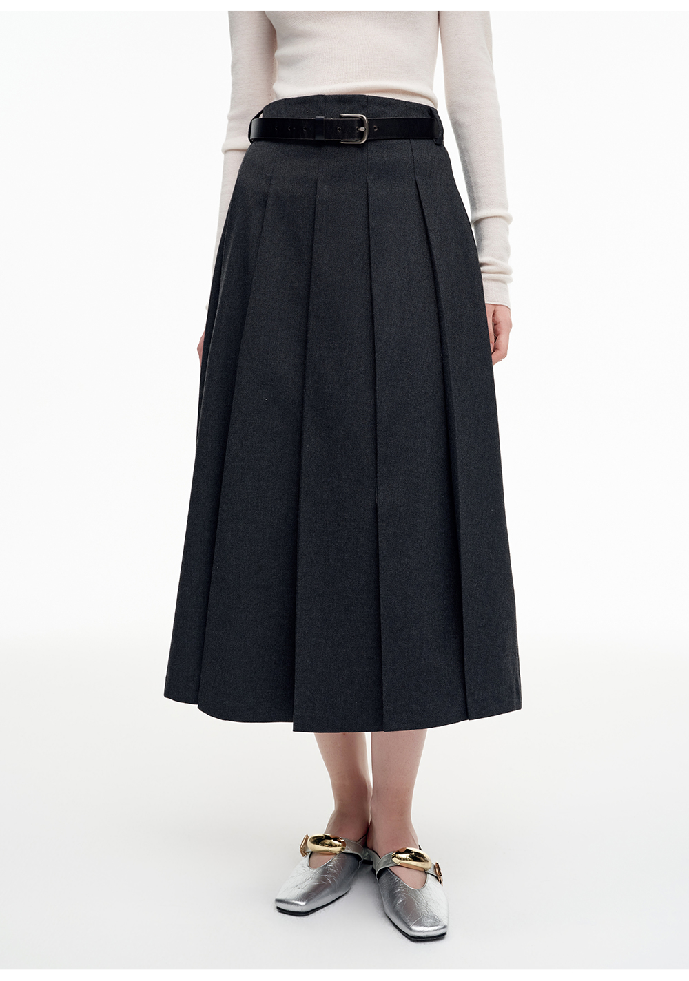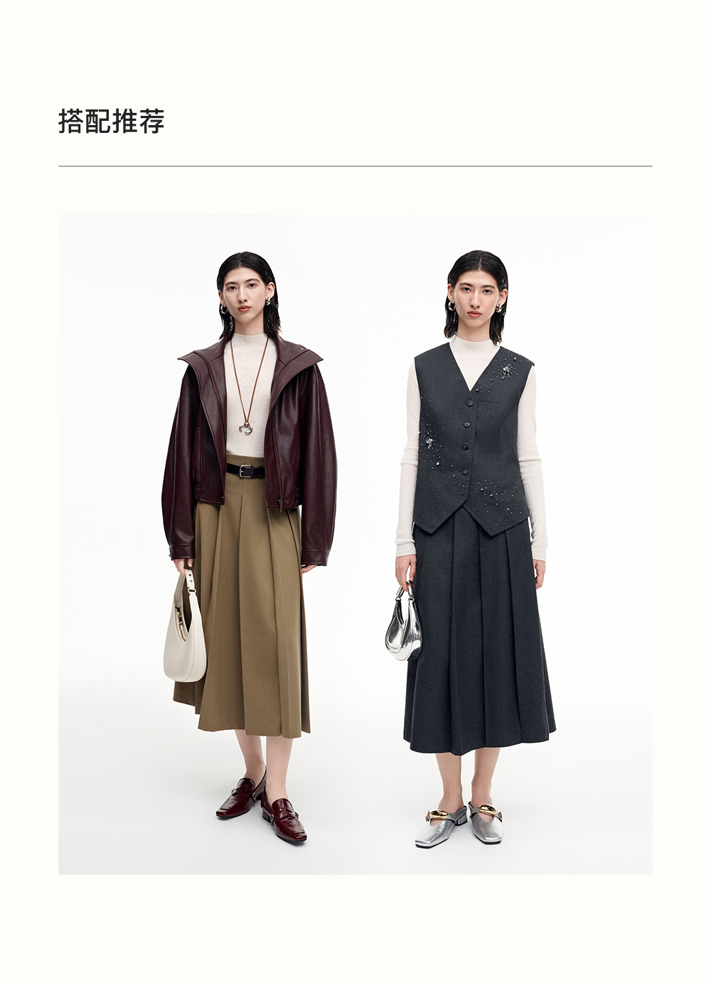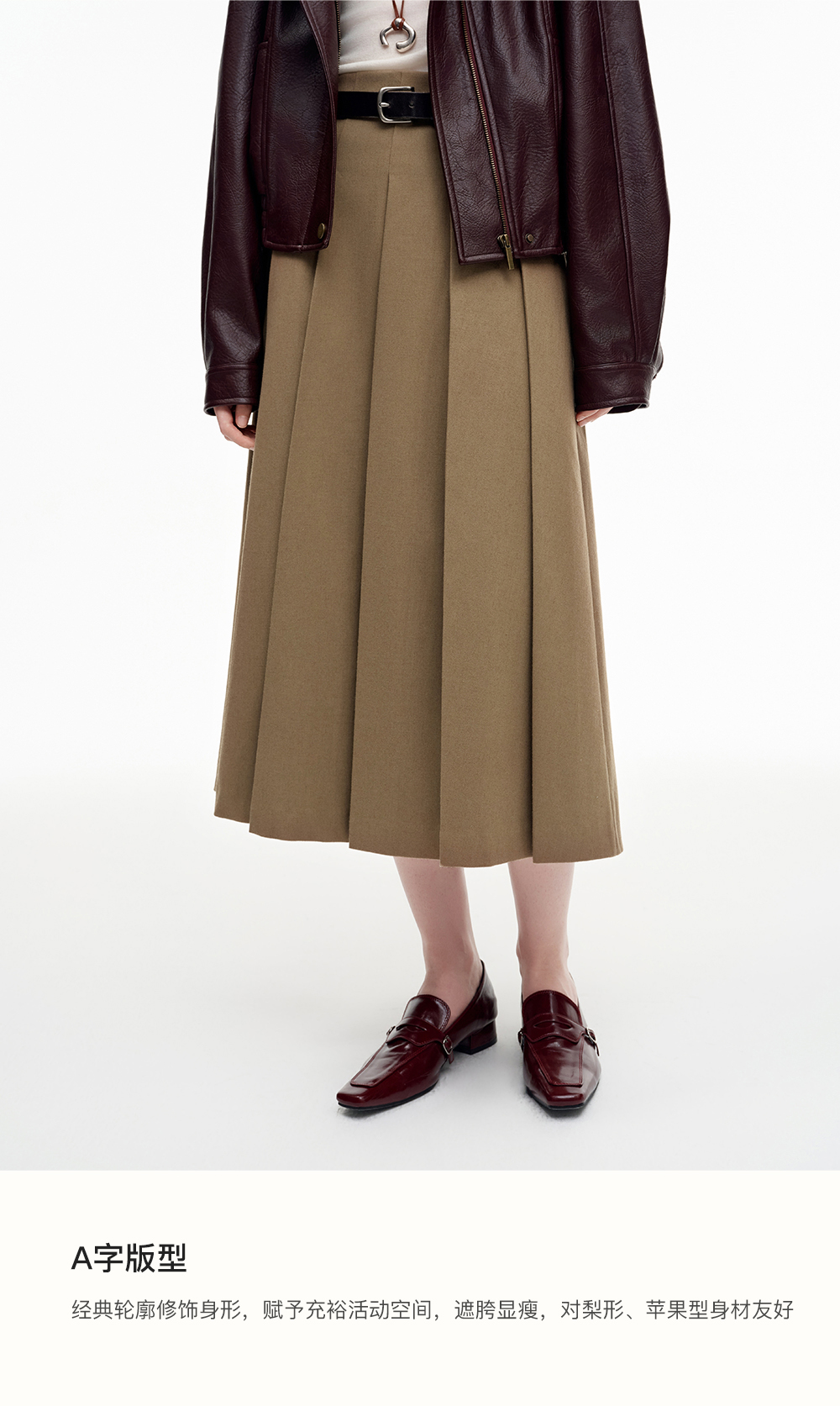 SELFWHO绵羊毛混纺复古无腰头半身裙女2025秋季新款通勤A字百褶裙