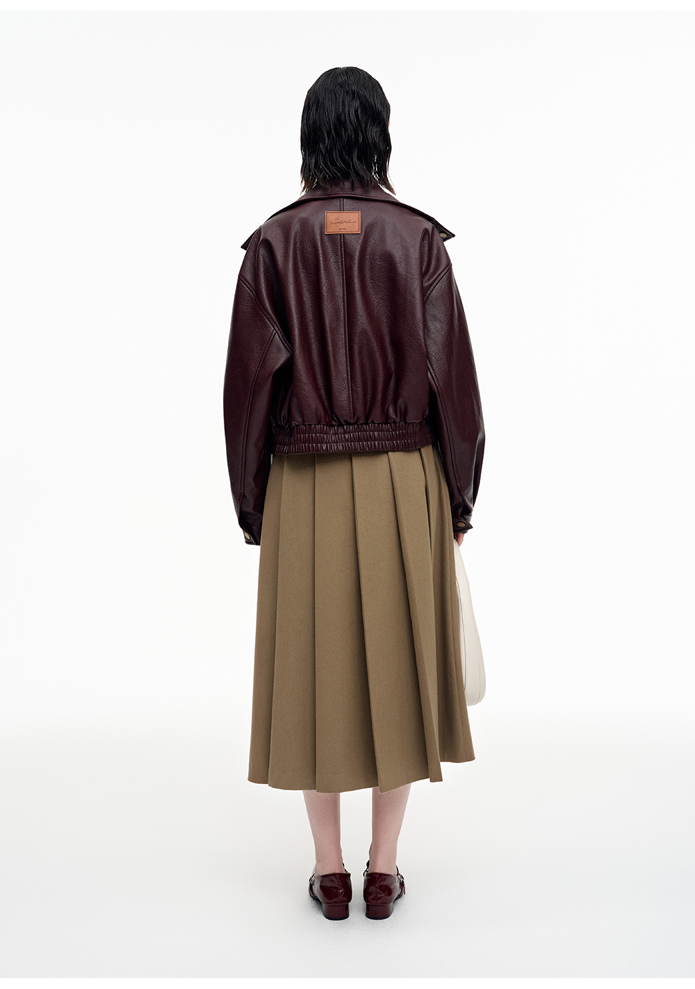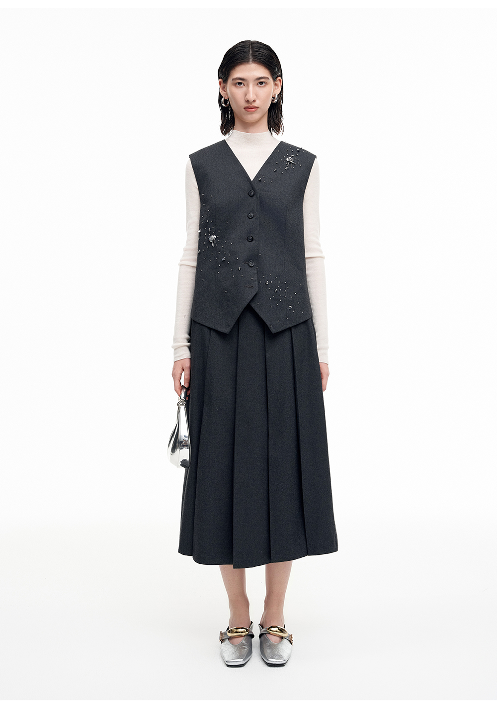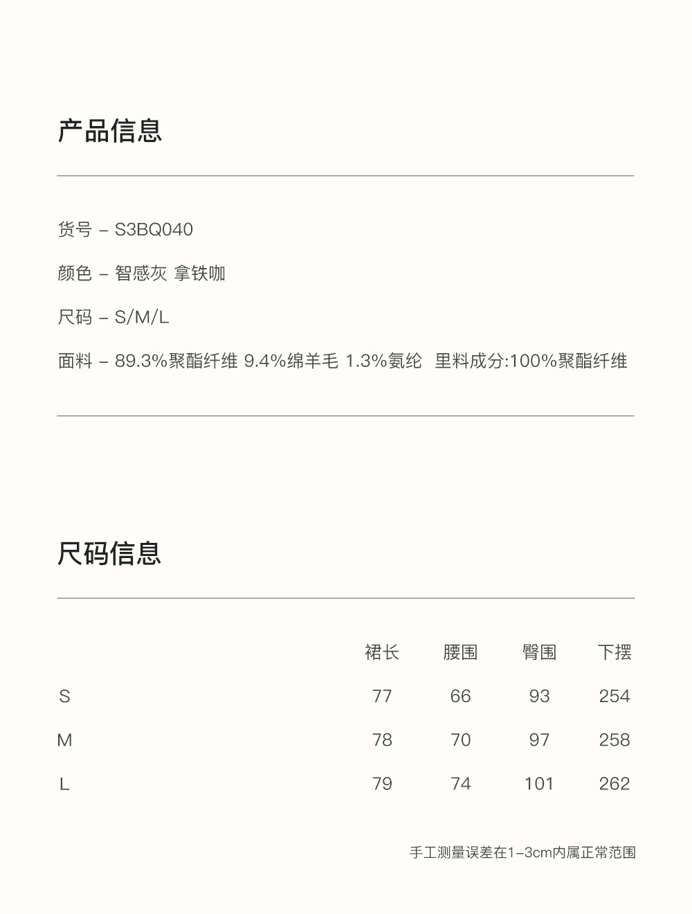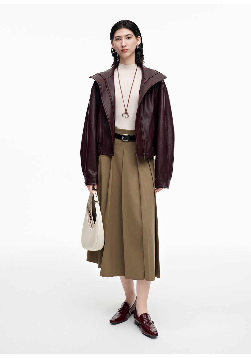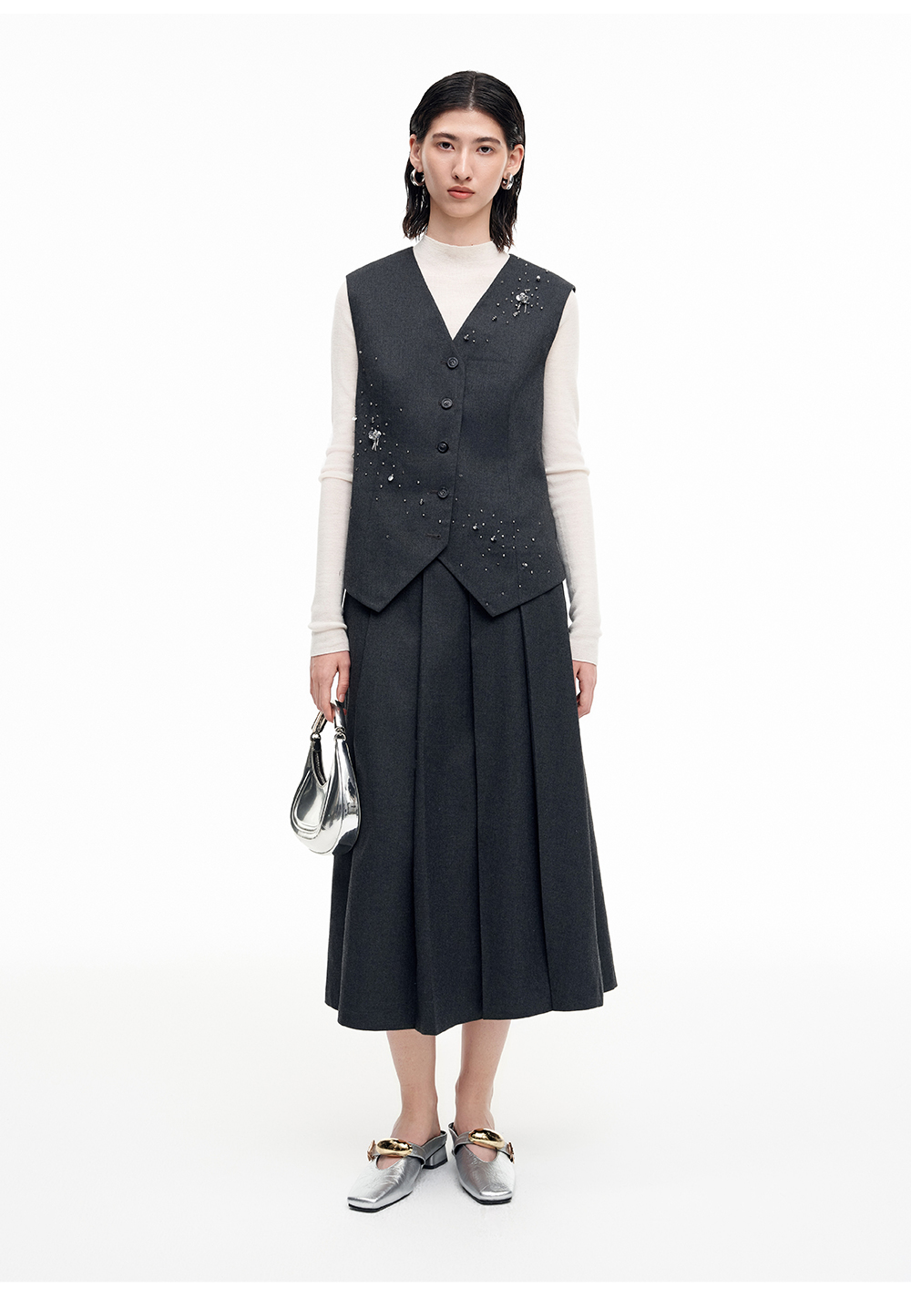 SELFWHO绵羊毛混纺复古无腰头半身裙女2025秋季新款通勤A字百褶裙