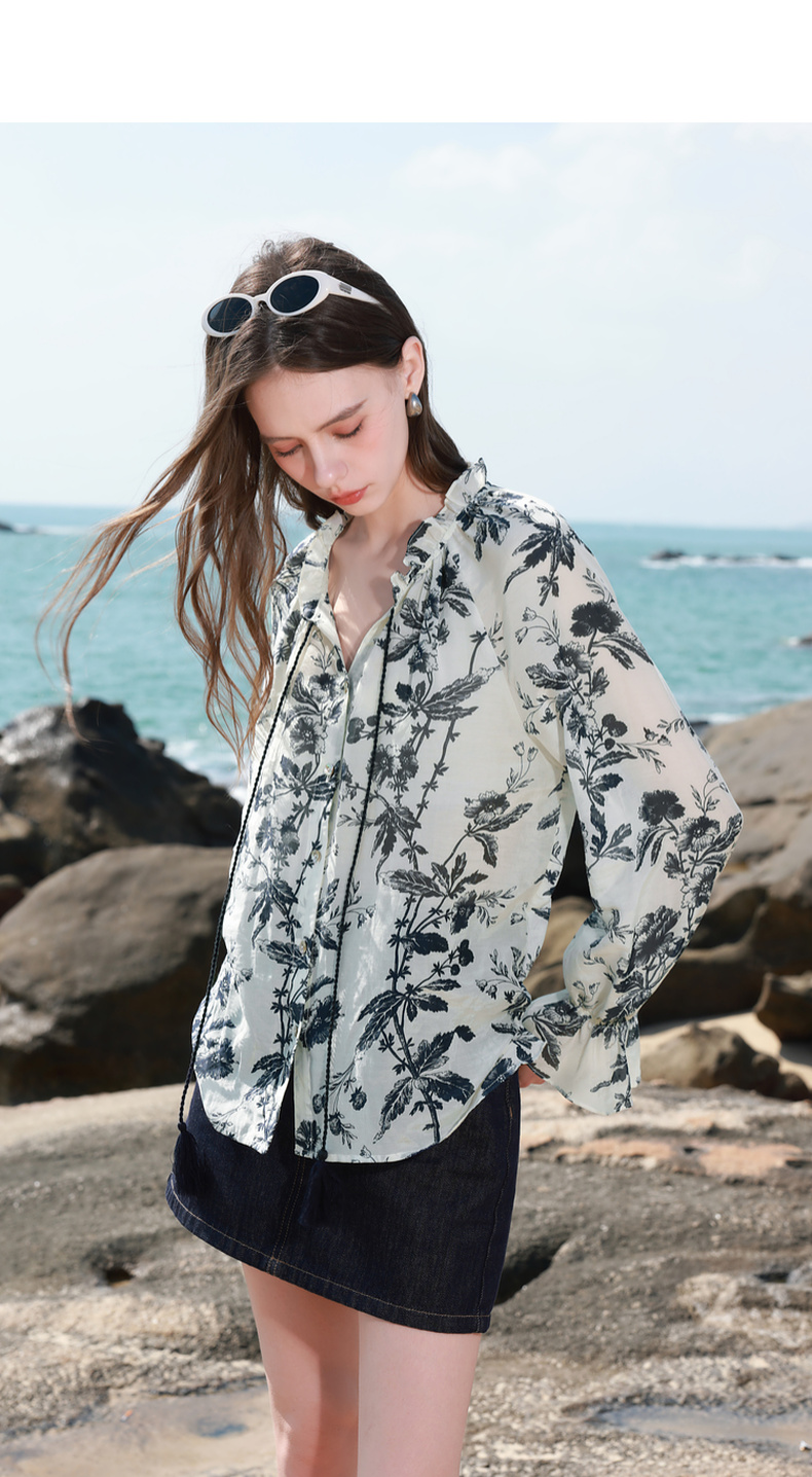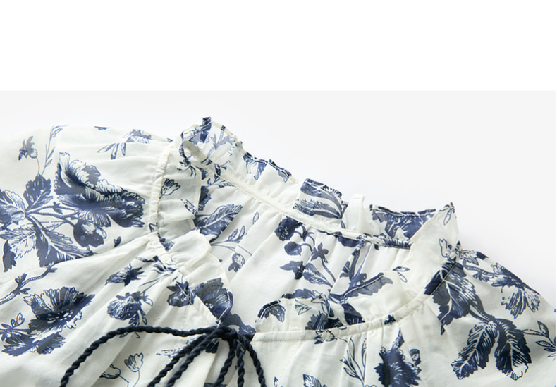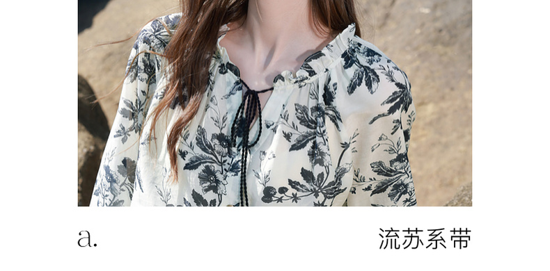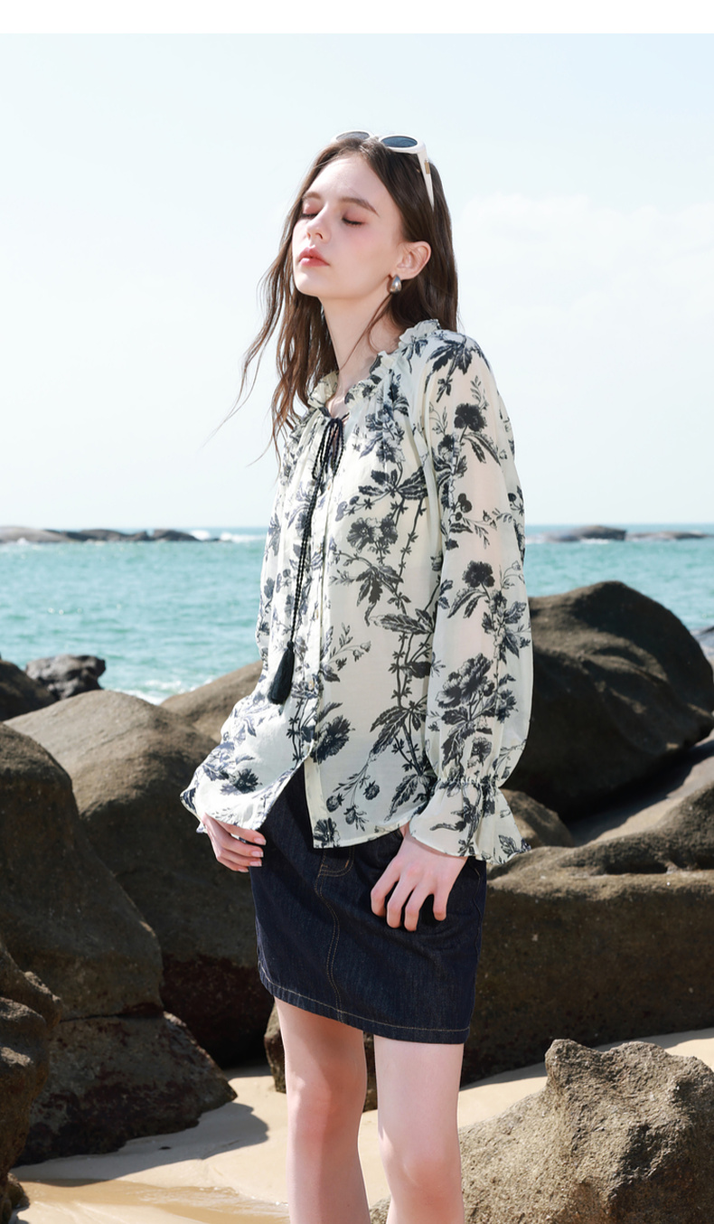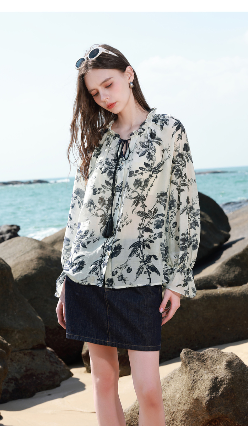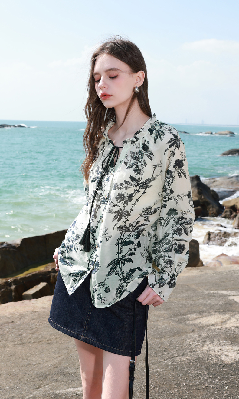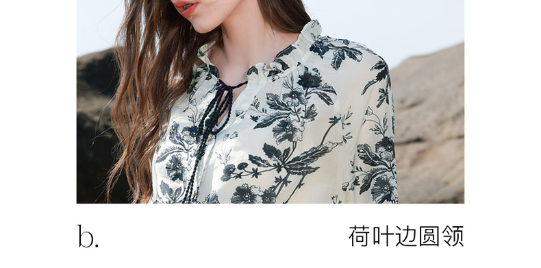 【桑蚕丝】三彩2026春季新款荷叶边圆领印花衬衫小衫衬衣宽松M