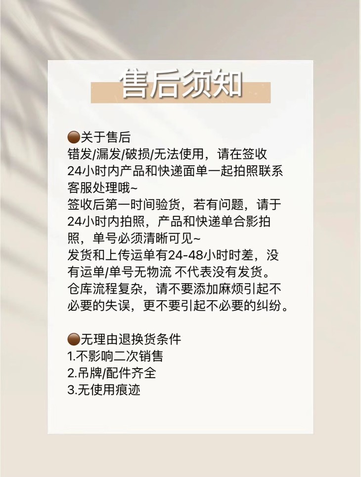 【发货地】浙江仓 【发货快递】极兔/邮政 【发货时效】5-10天 【加运费地】新疆+15 【不发货地】西藏、港澳台 【是否支持7天无理由】不影响二次销售支持 🔻 售后说明: ❎ 错发/漏发/质量问题收到后24小时内带快递面单与产品图片联系售后处理,逾期不予处理 ❎ 包装完整不影响二次销售,72小时内退换。需扣除发出运费4元,拦截拒收扣除4元 1.客户留地址电话等信息导致货物不能正常送达均不在售后范围内,不接受拒收 2.产品已经发出的情况下,不可更改地址,不退货下单前,一定要留对信息 3.外包装快递运输过程中难免会有些磨损,属于正常现象,不例入售后范围