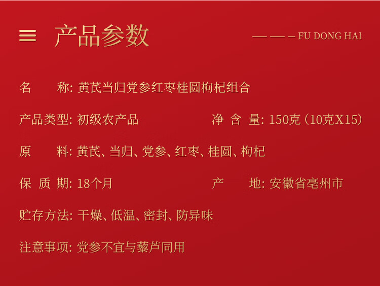 【福东海】 黄芪当归党参红枣桂圆枸杞150克(10克x15袋)/盒