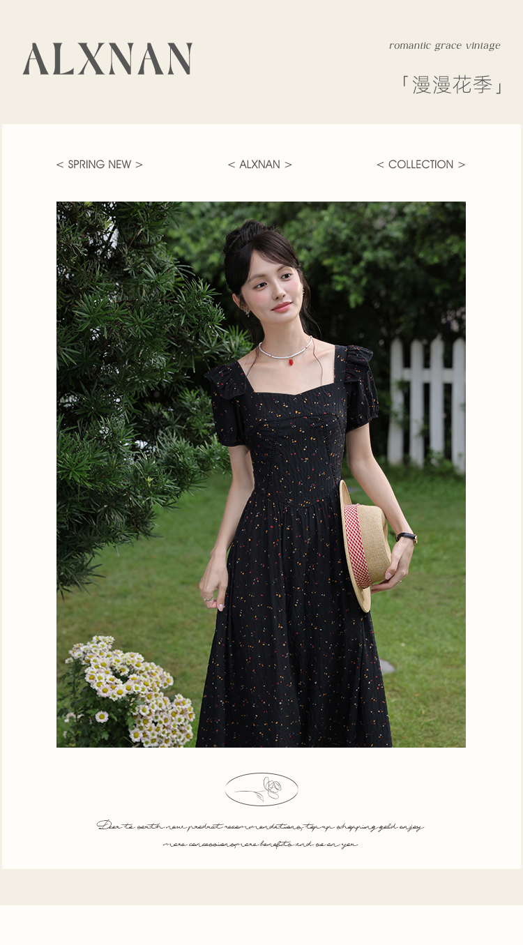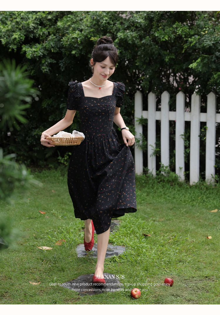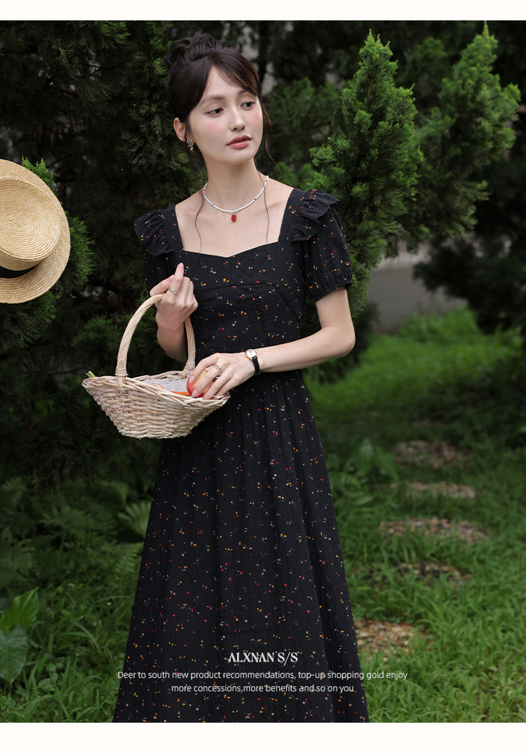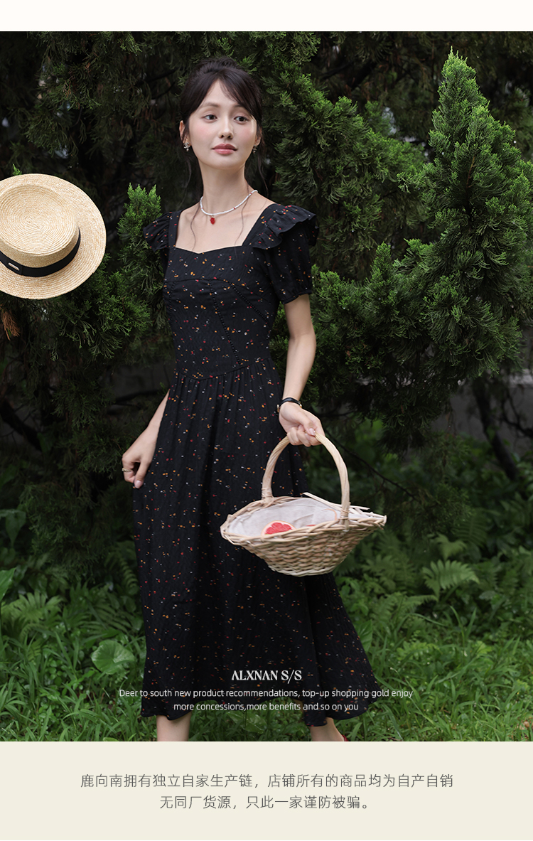【6折秒杀】鹿向南「漫漫花季」法式温柔风气质长裙女夏季显瘦黑底碎花连衣裙L56011