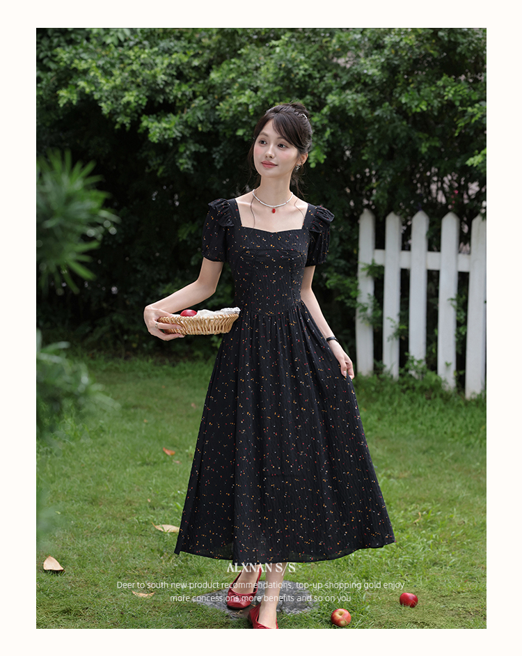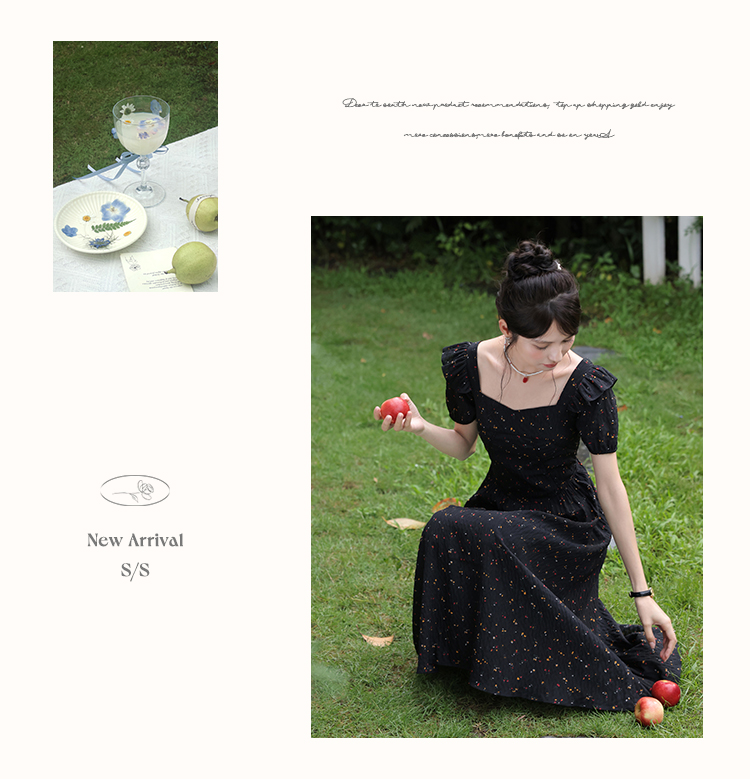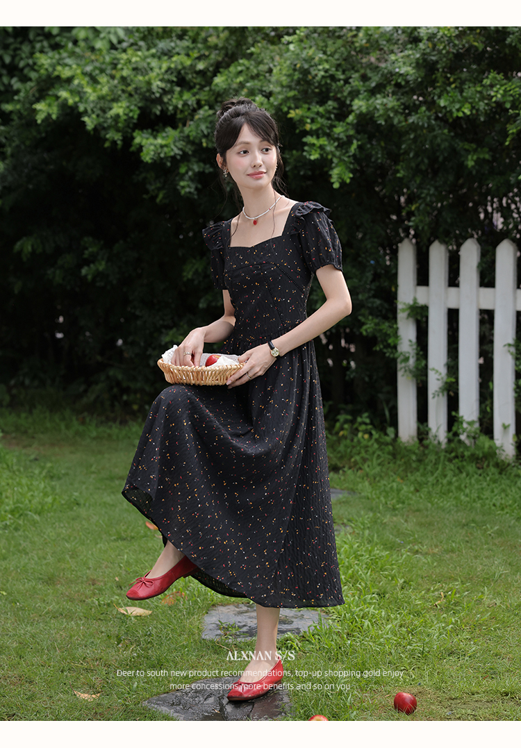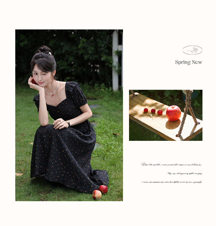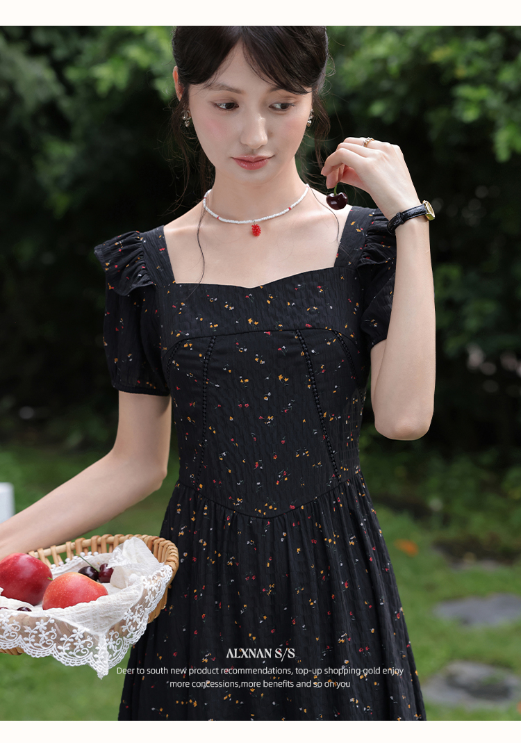 【6折秒杀】鹿向南「漫漫花季」法式温柔风气质长裙女夏季显瘦黑底碎花连衣裙L56011