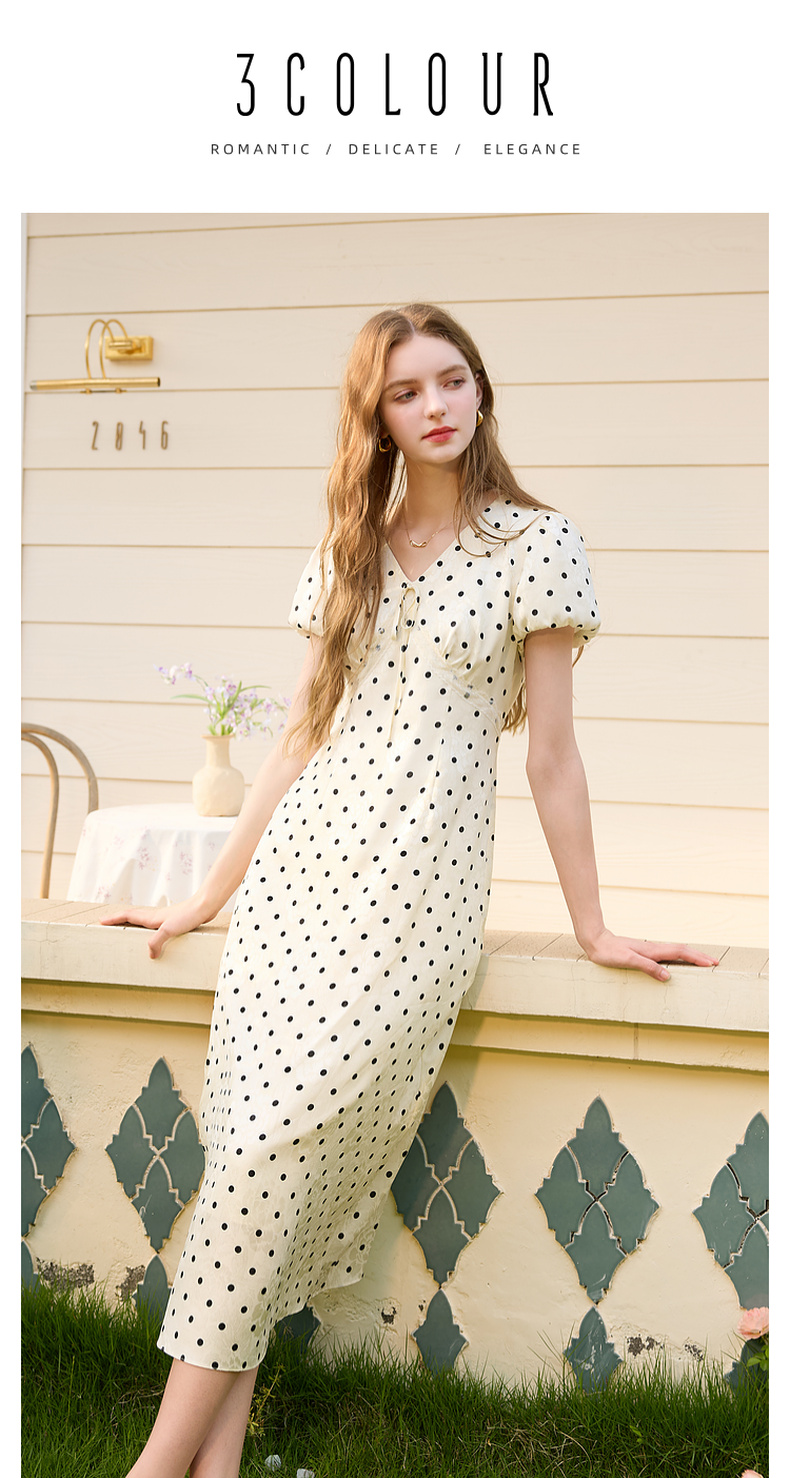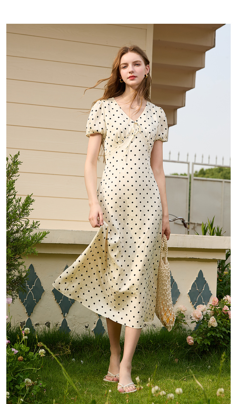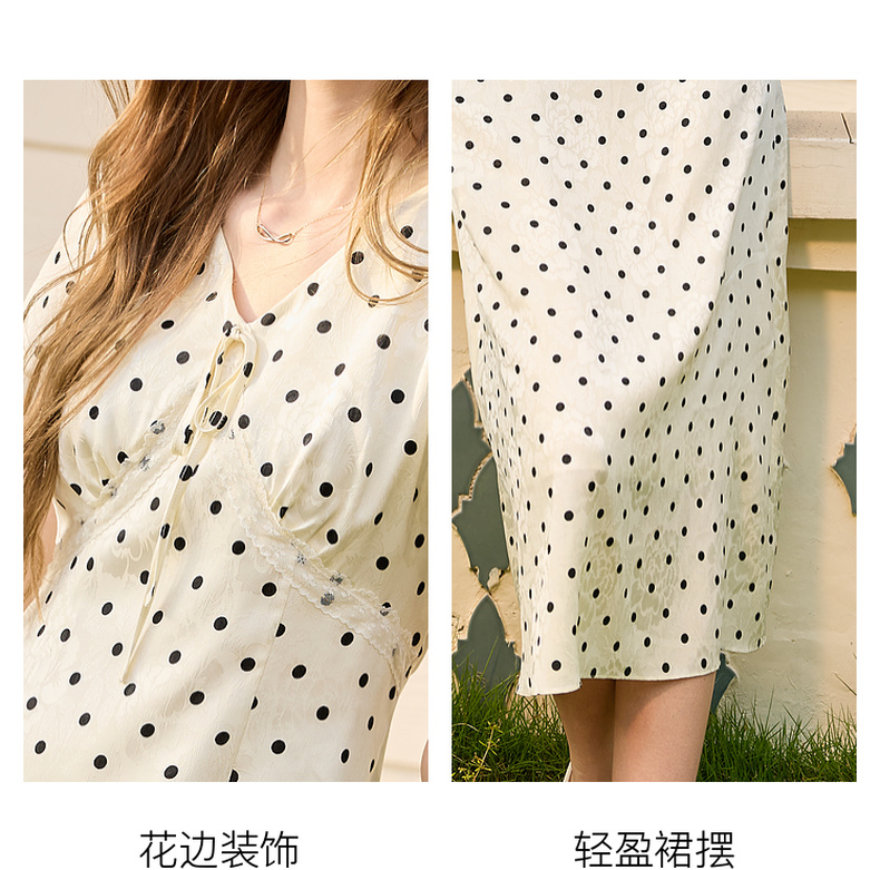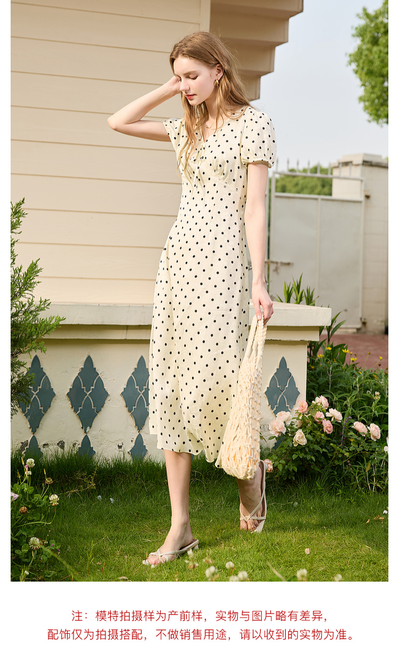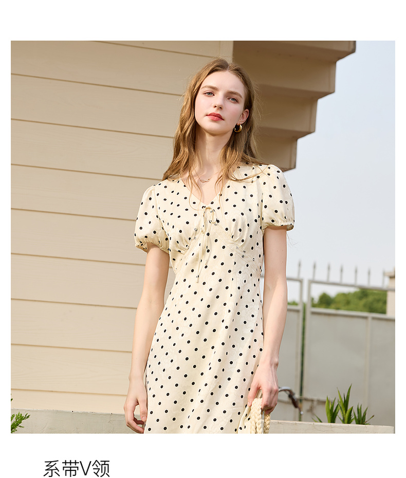 三彩2025夏季新款法式复古波点印花连衣裙V领短袖收腰A字长裙M