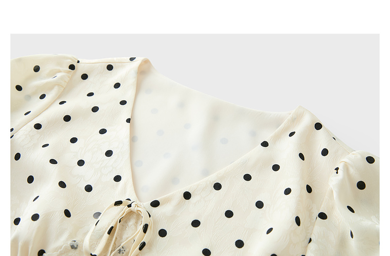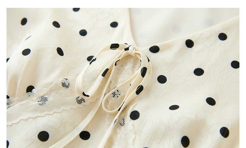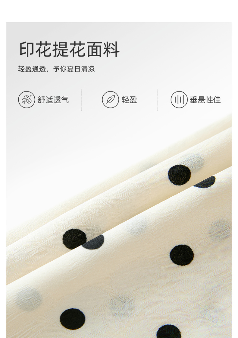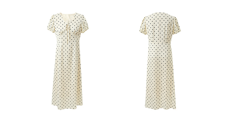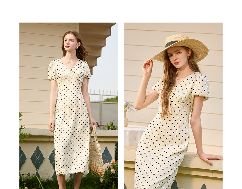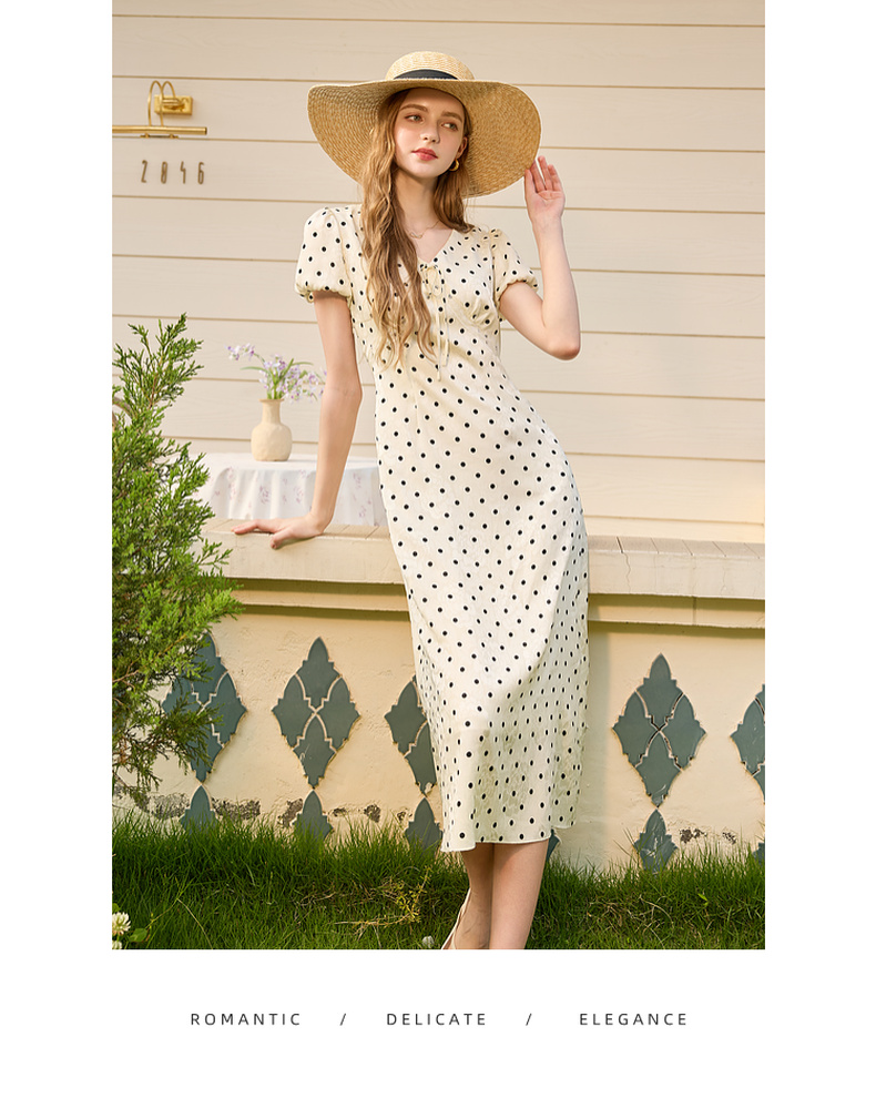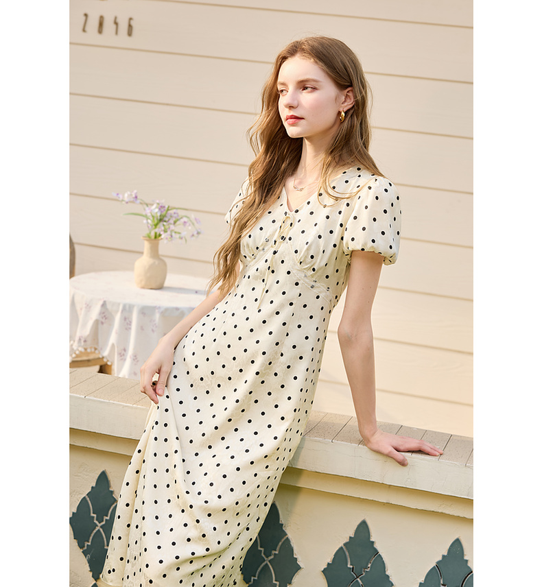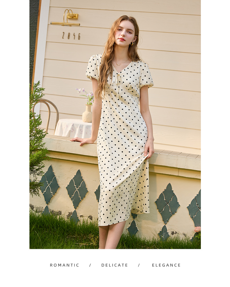 三彩2025夏季新款法式复古波点印花连衣裙V领短袖收腰A字长裙M